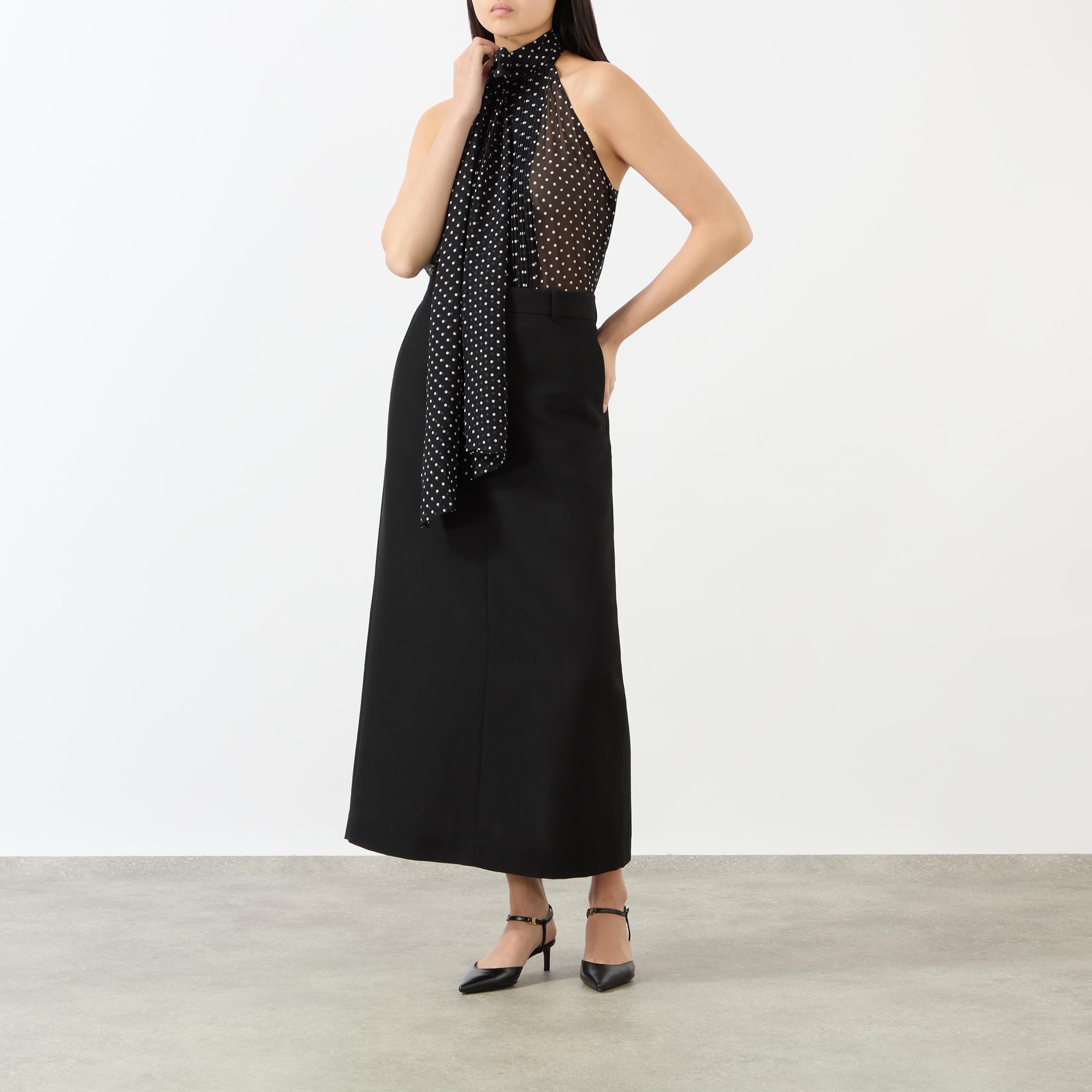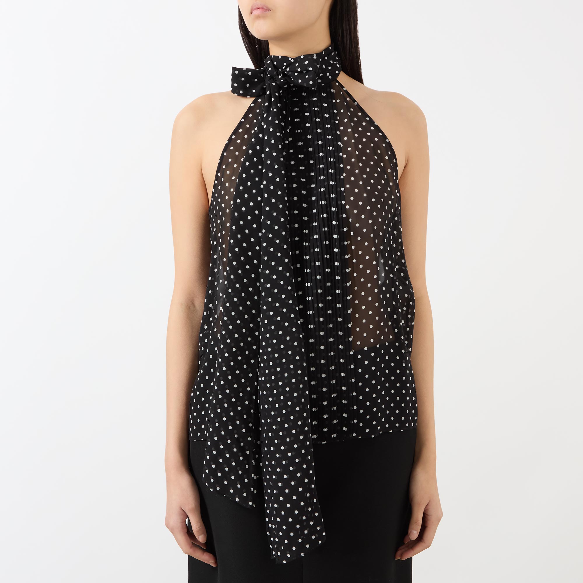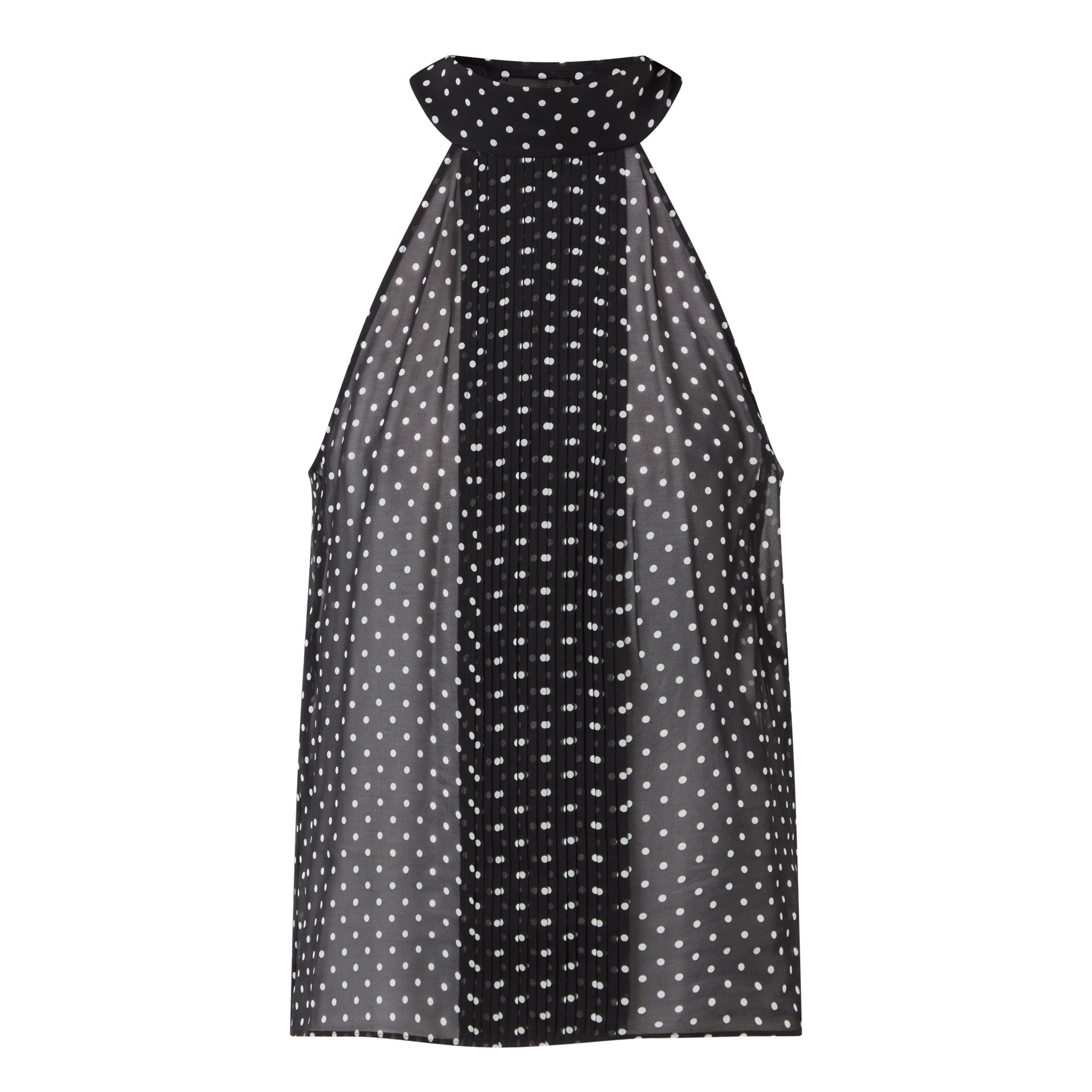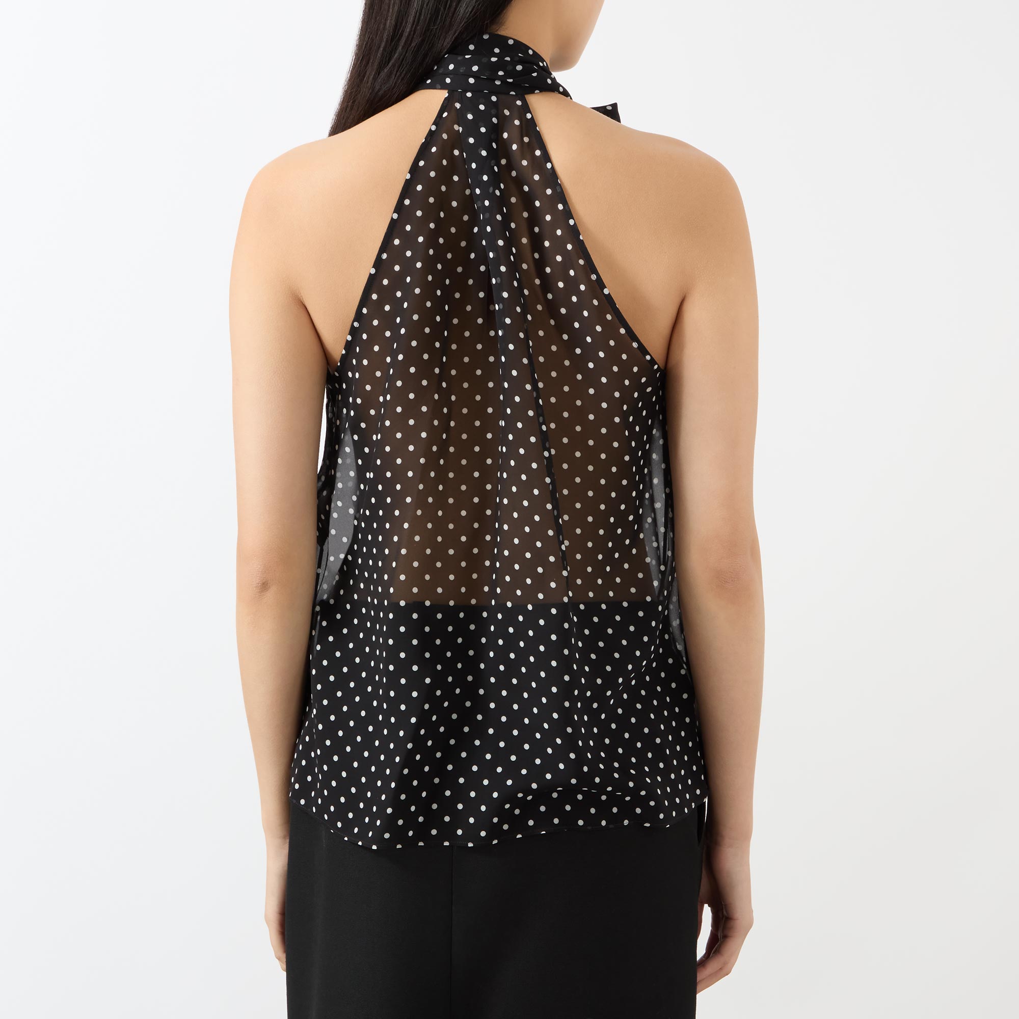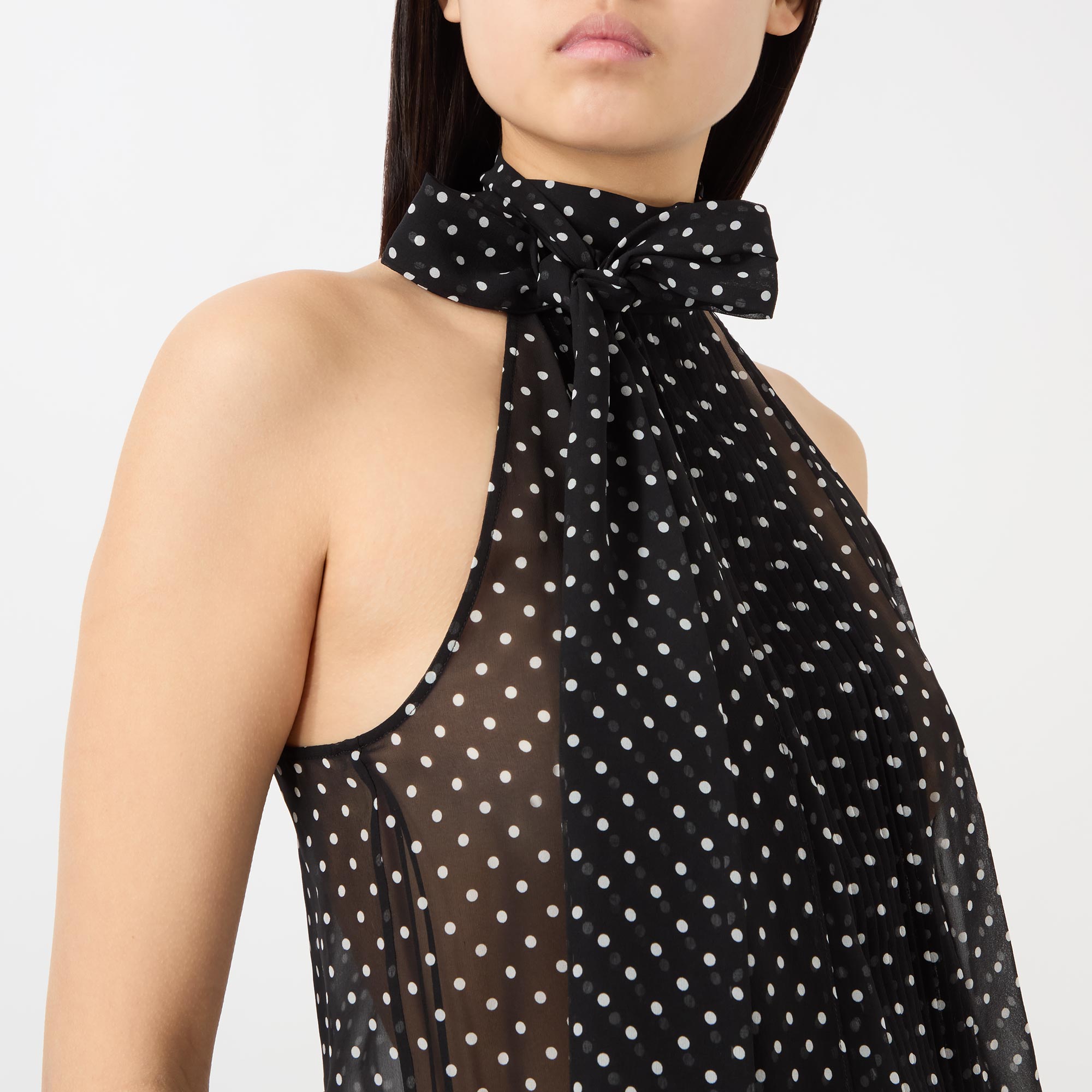 - Halter neckline, front tie-fastening bow, sleeveless, polka dot pattern, sheer silk finish