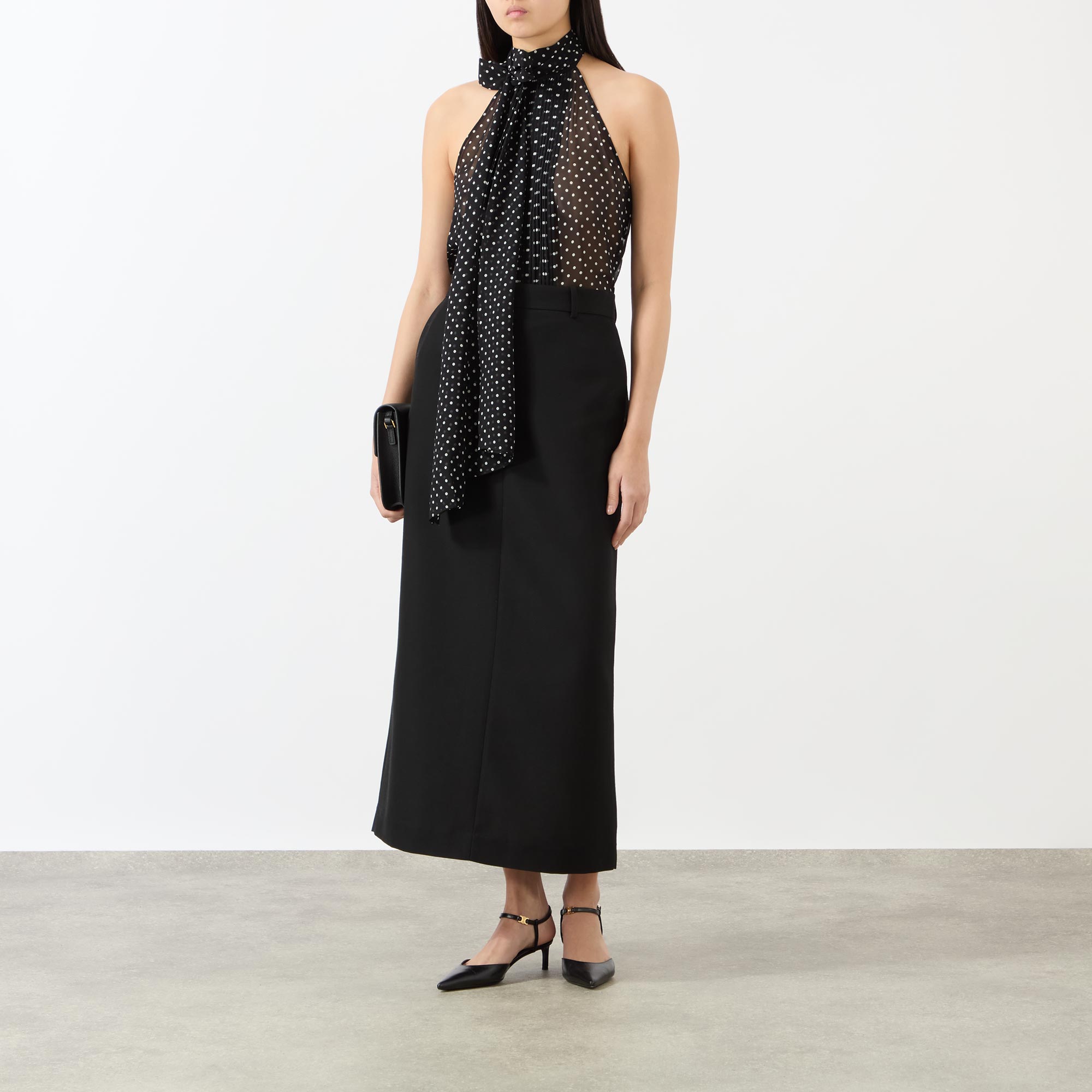 Many of Tom Ford’s designs exude seduction, and this blouse from the SS26 line is no exception. Crafted from pure silk for a luxurious feel, it features a sheer finish, a halter neckline with a tie-fastening bow, and a playful polka-dot pattern. Style it with a high-rise pencil skirt and pumps for a sleek, elegant look.