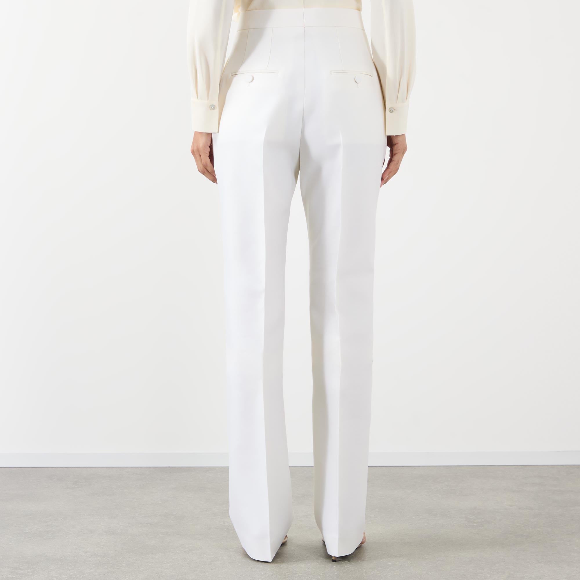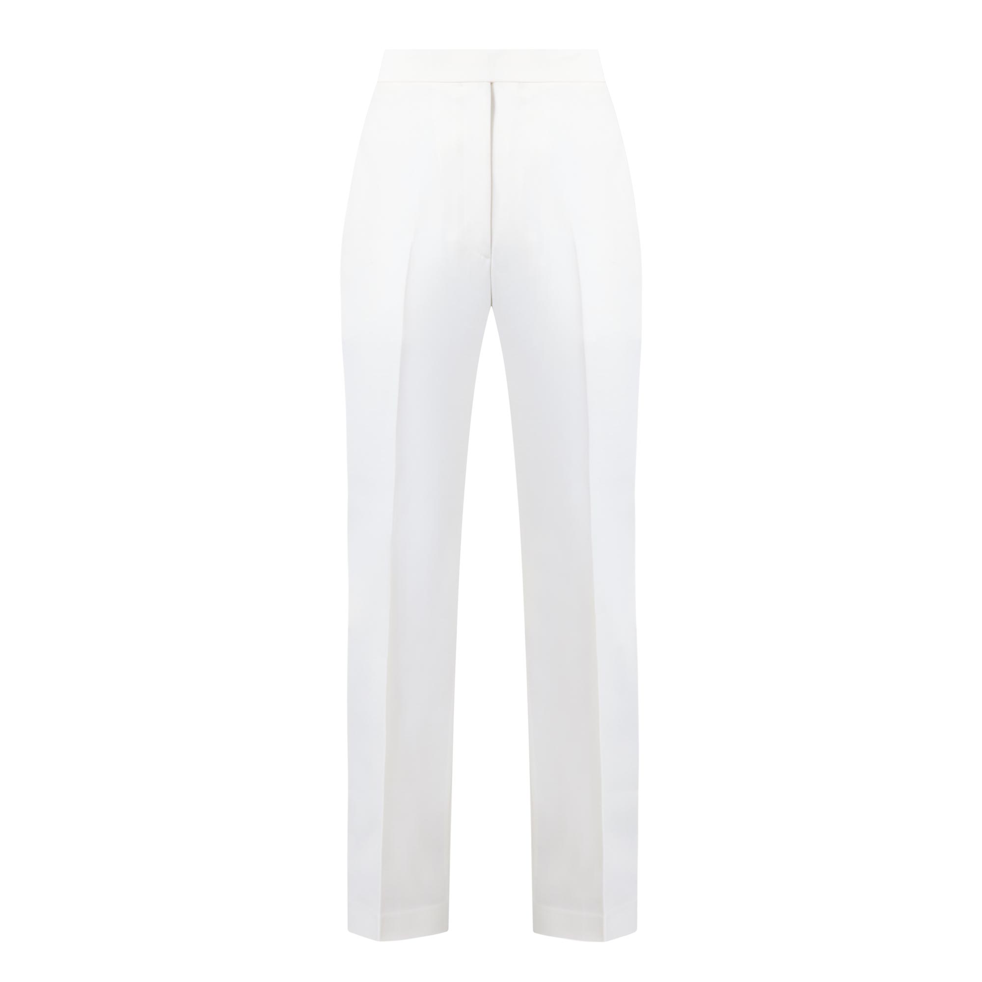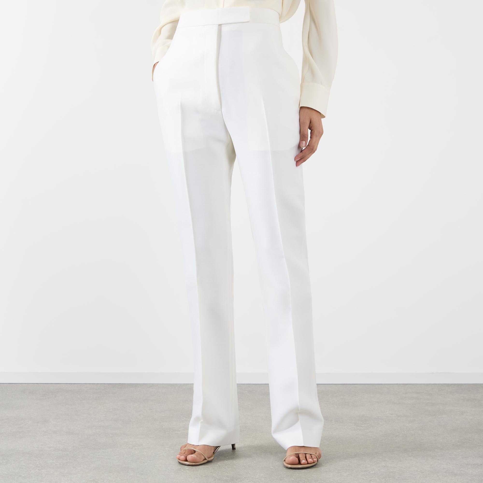 • High rise, straight leg, covered waistband, concealed fly with hook and bar fastening, two side in seam pockets, two rear jetted pockets with button fastenings, clean hems, pressed creases