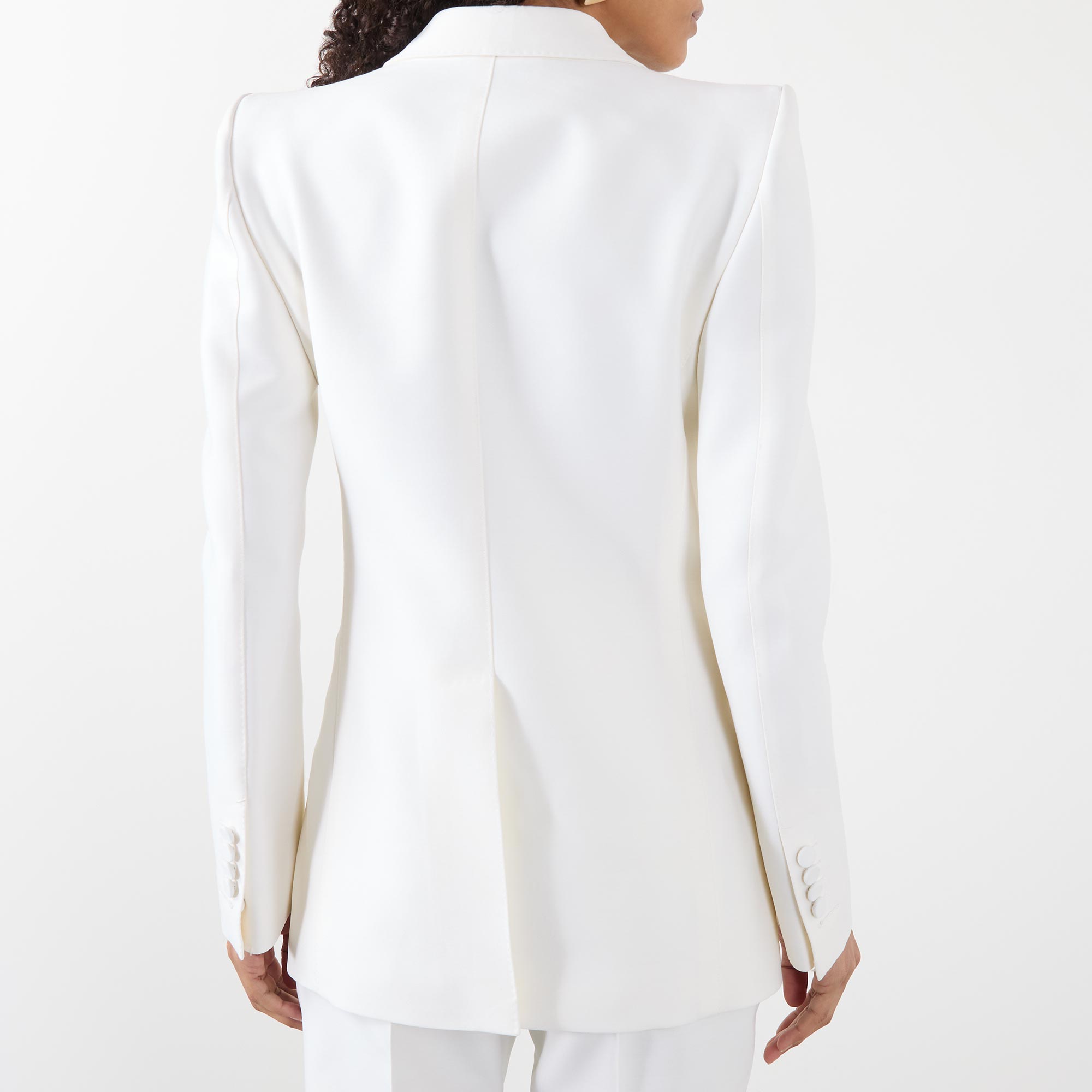 - Single breasted design, peak lapel collar, structured shoulders, long sleeves, buttoned cuffs, front button fastening, one chest welt pocket, two hip flap pockets, rear vent, smooth finish, lined