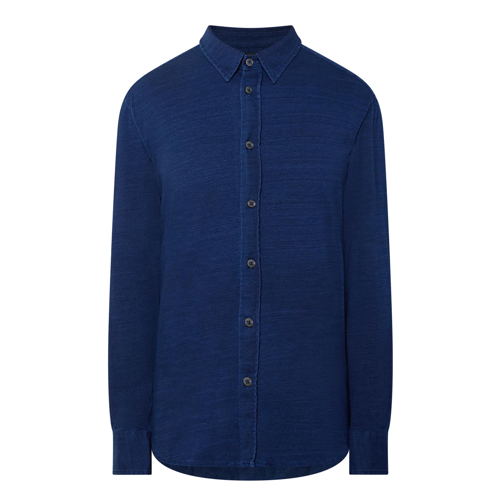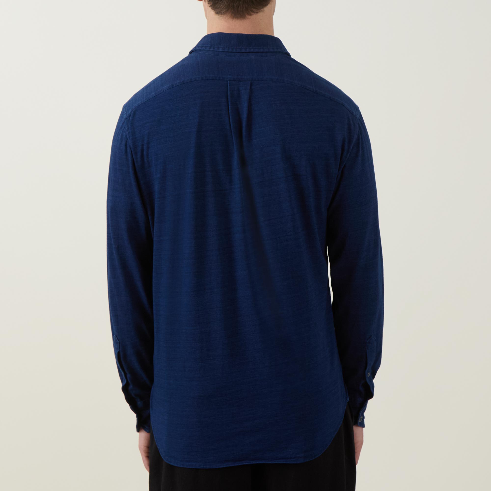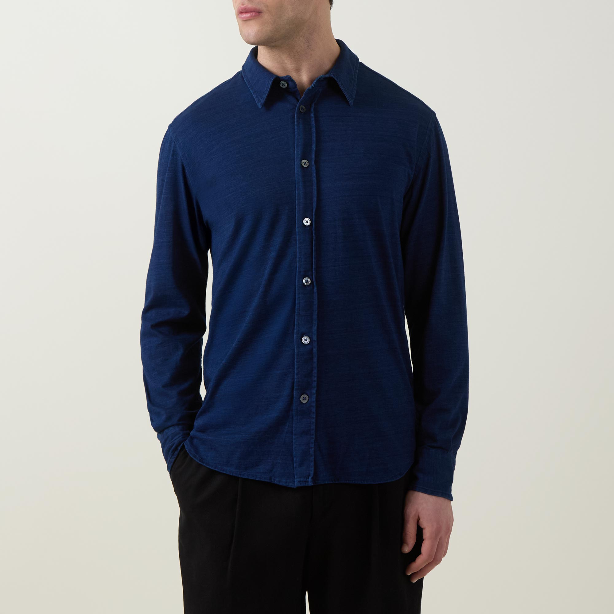 • Point collar, dropped shoulders, long sleeves, buttoned cuffs, front button fastening, curved hem, rear box pleat, soft textured jersey finish