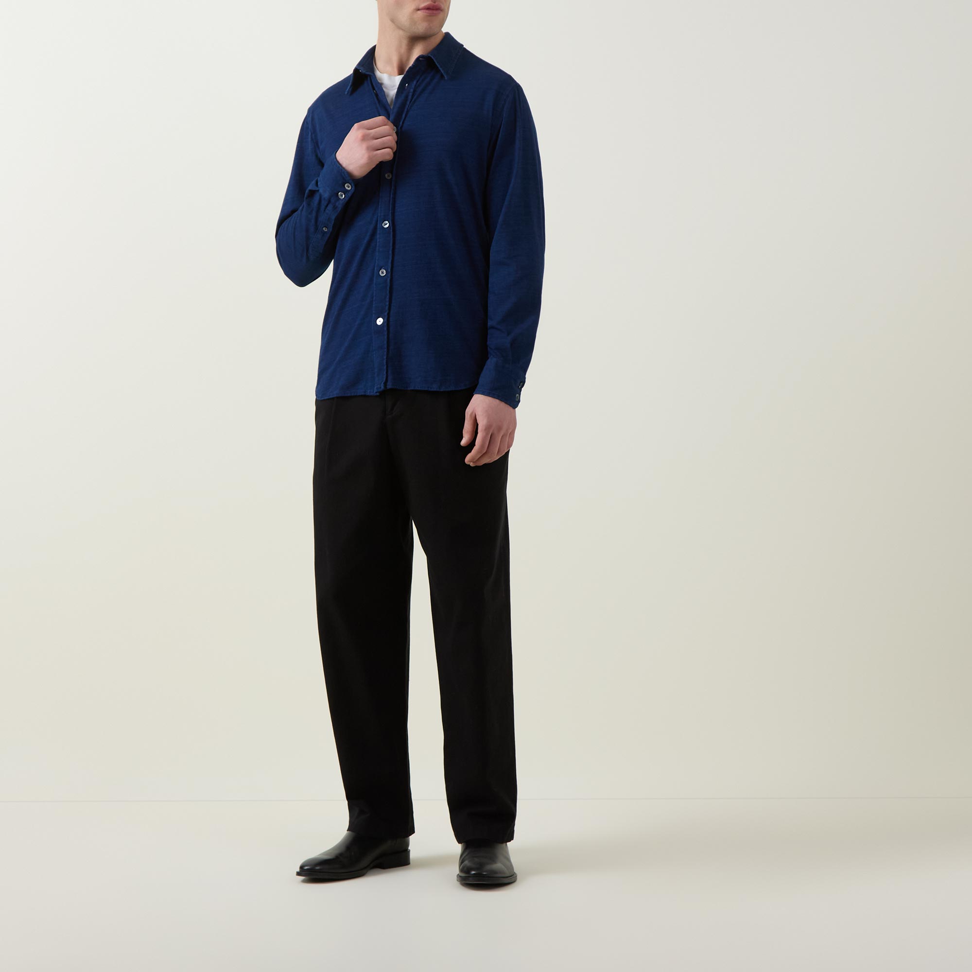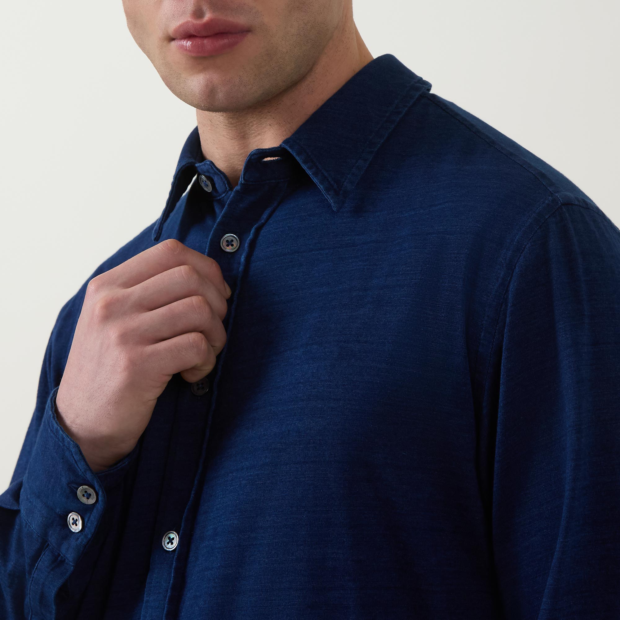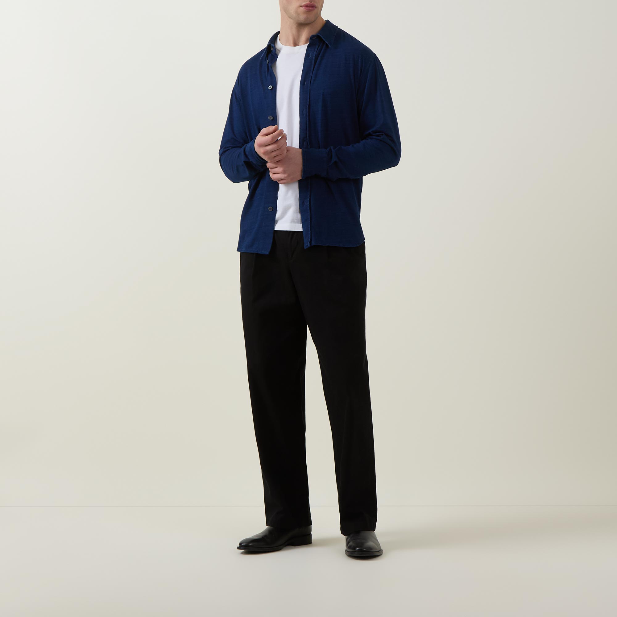 • Point collar, dropped shoulders, long sleeves, buttoned cuffs, front button fastening, curved hem, rear box pleat, soft textured jersey finish