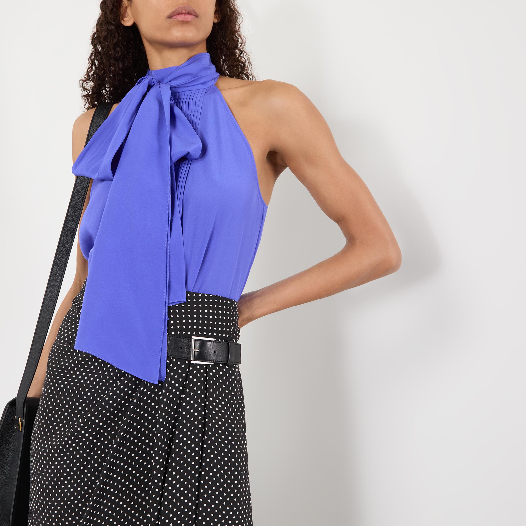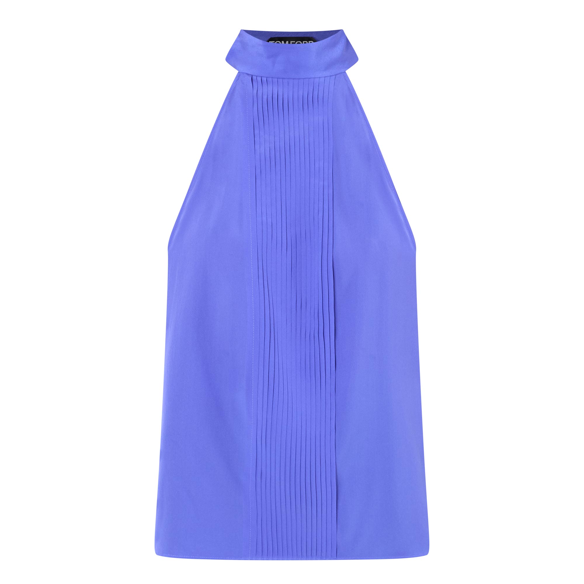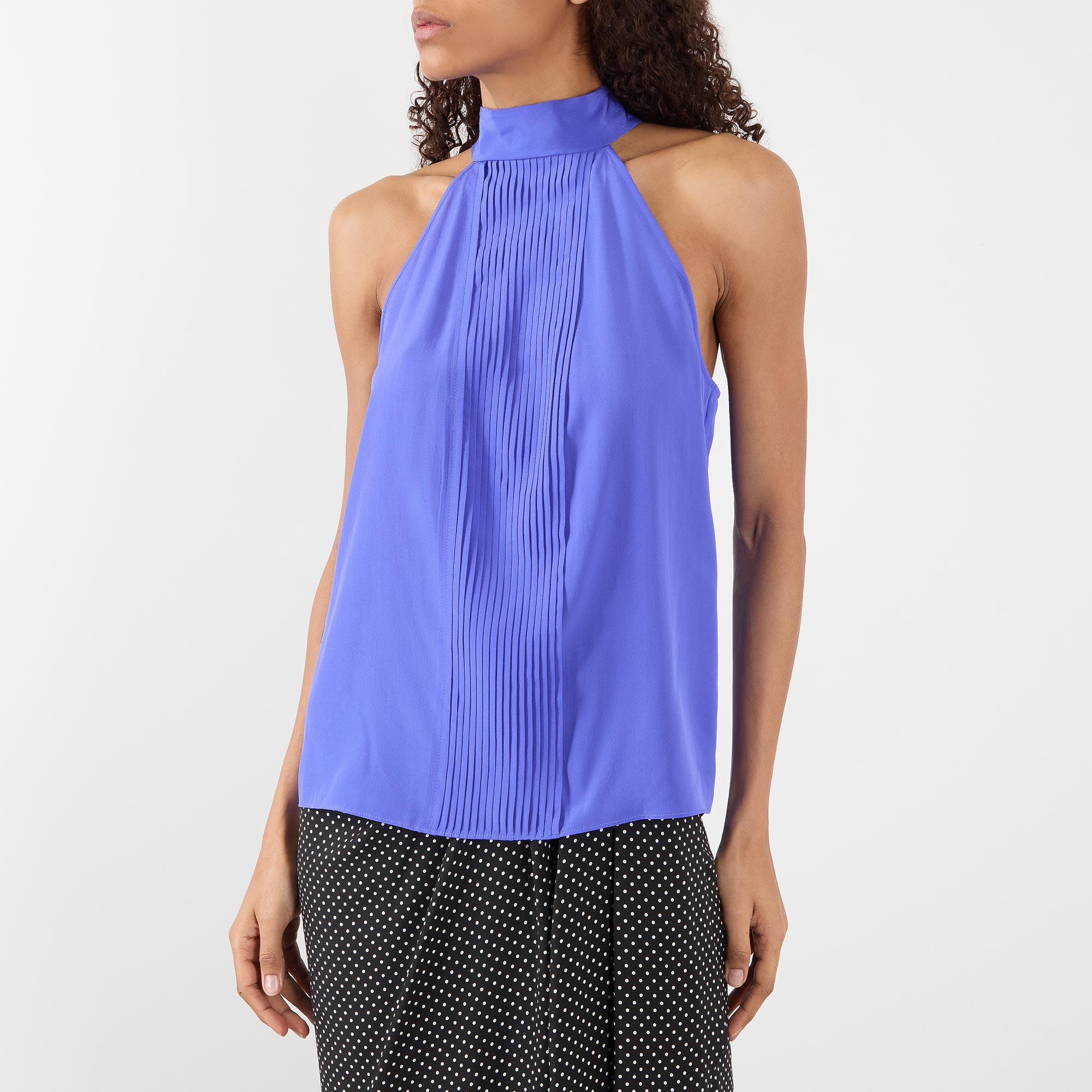 • High neckline, halter-style, lavalliere tie detail, sleeveless, plissé pleated detailing, straight hem, smooth finish