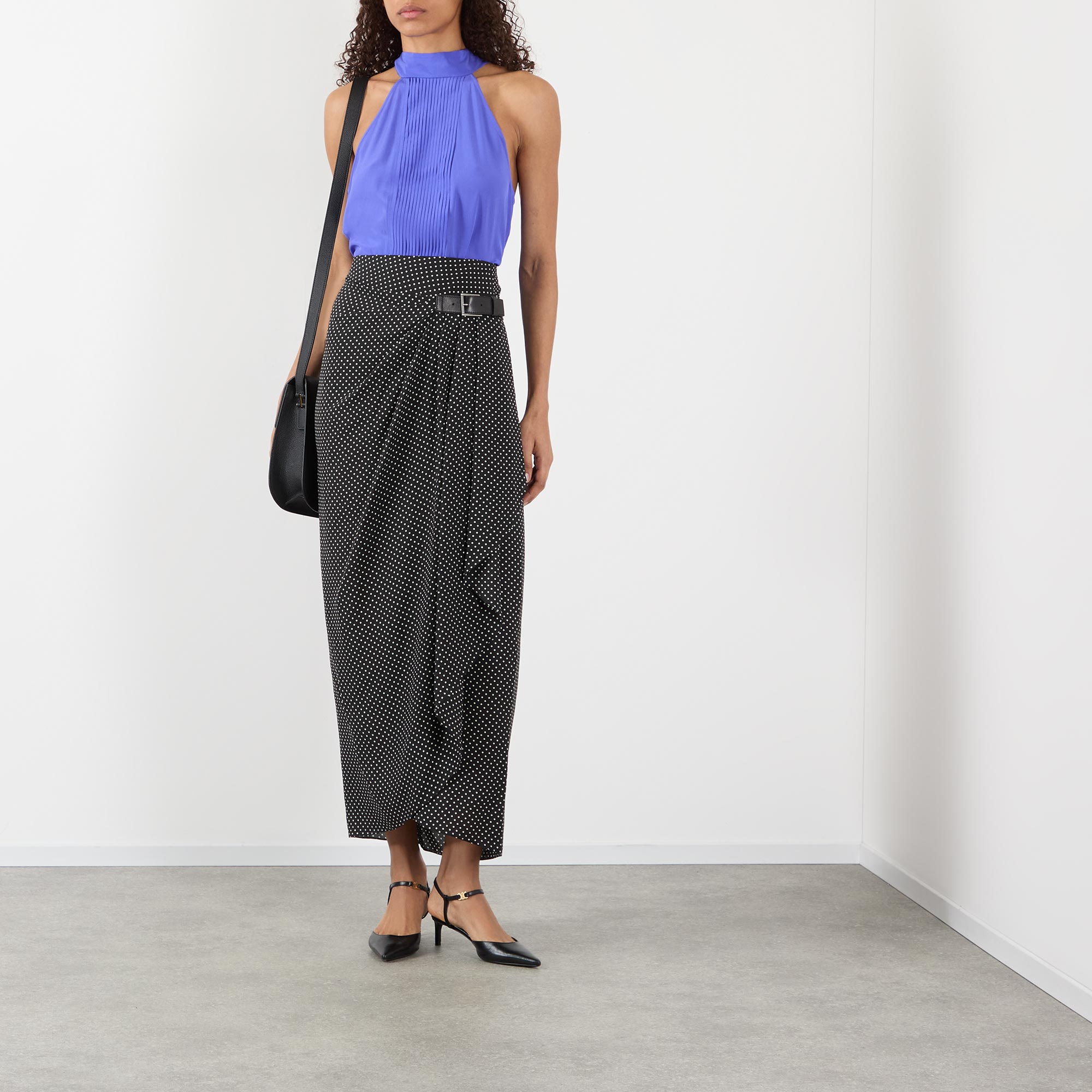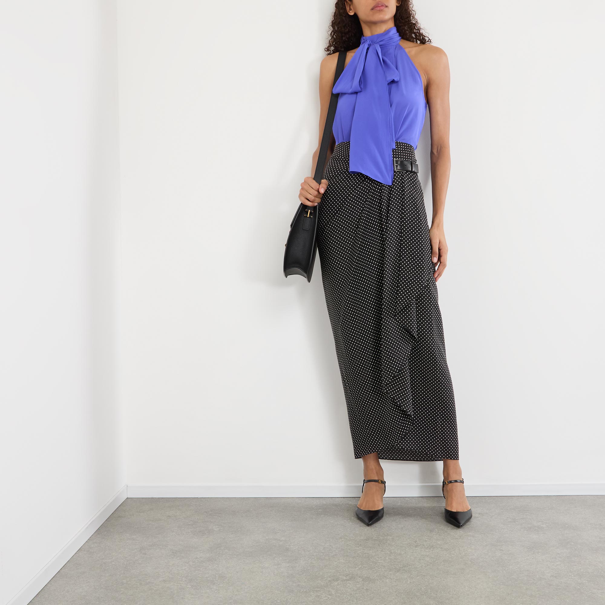 This SS26, Tom Ford offers a selection of sensual designs that feature dramatic cut-outs and backless styles, keeping movement and fluidity, take this blouse. Spun from pure silk and cut to a halter silhouette, the sleeveless number boasts a pleated plissé front, while the a lavalliere tie detail can be worn to the front or back for versatile styling.