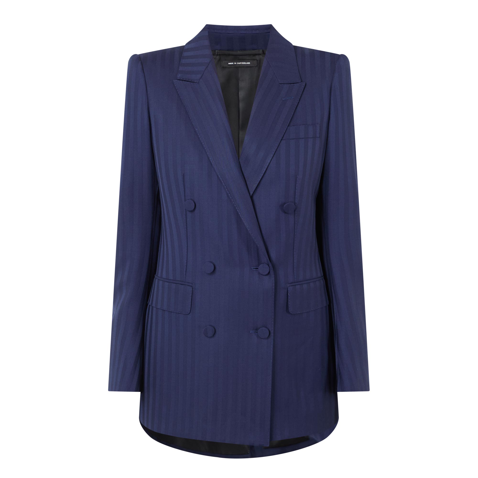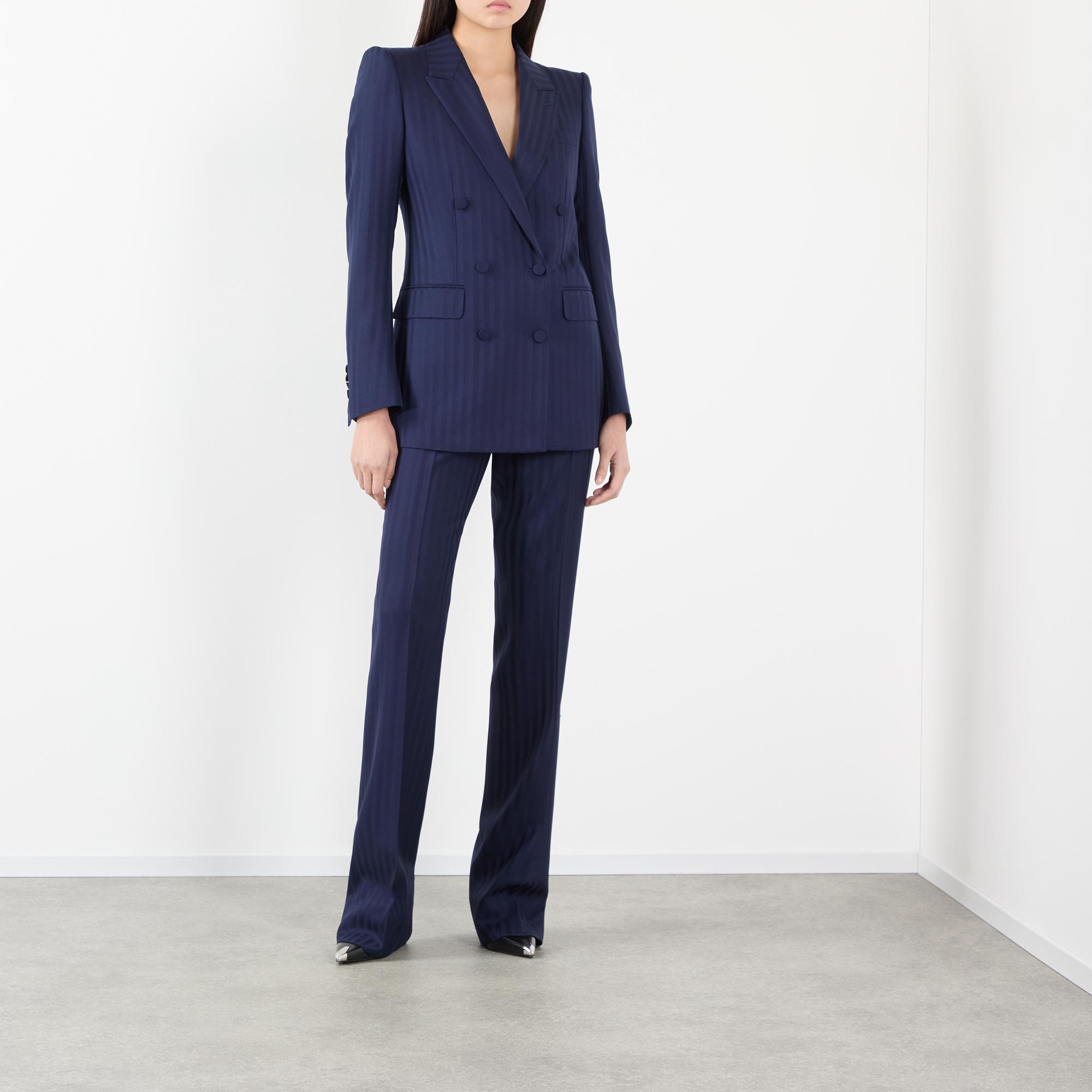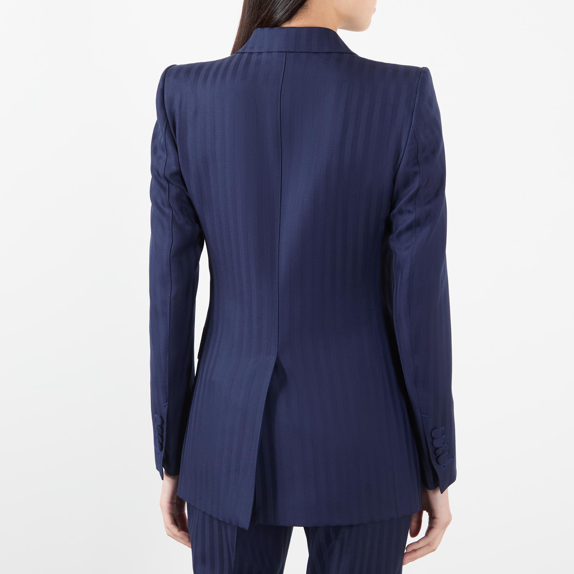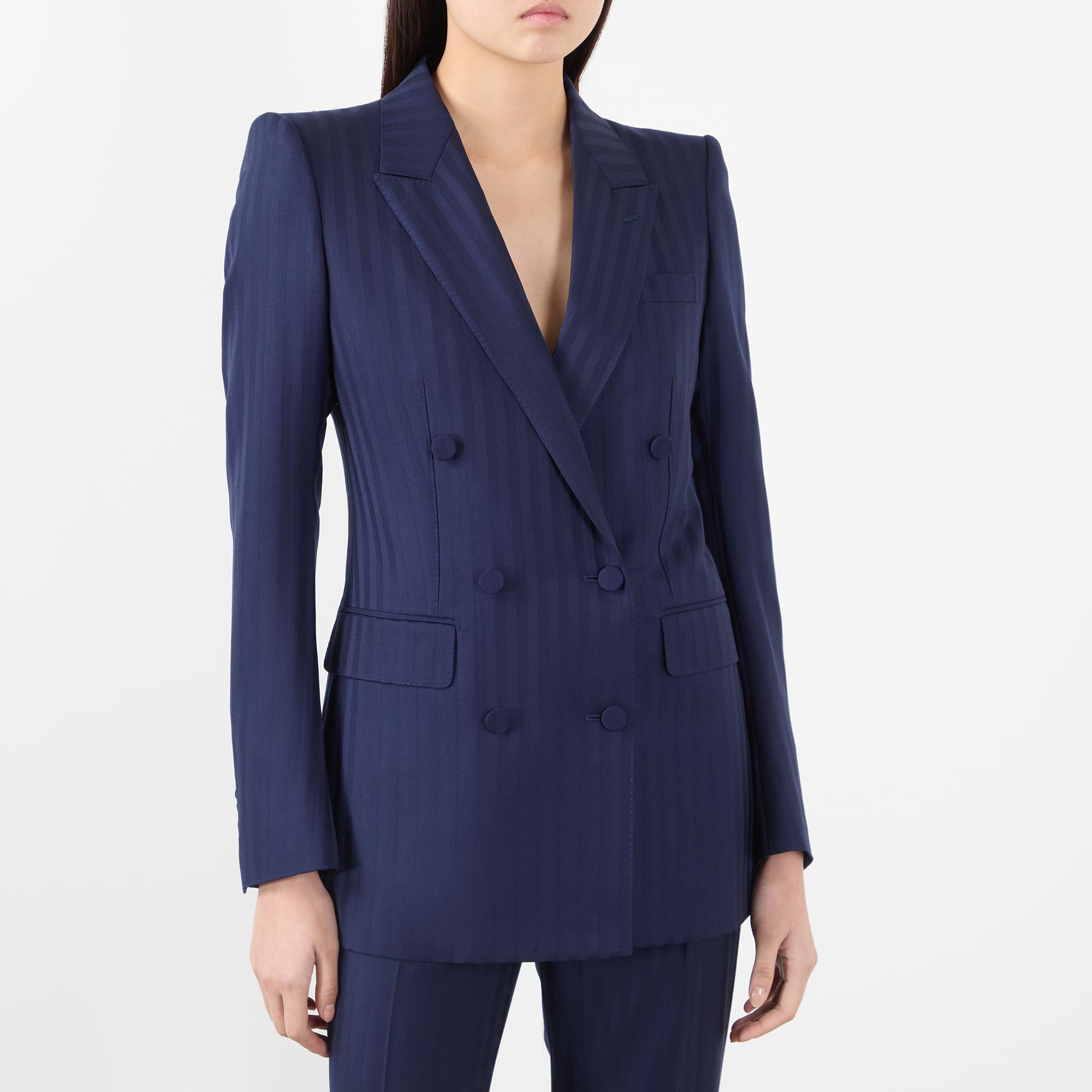 • Peaked lapels, double-breasted, button fastening, slightly curved long sleeves, tailored shoulder pads, chest pocket, flap pockets, five kissing cuff buttons, two jet internal pockets, single vent to the rear, fully lined