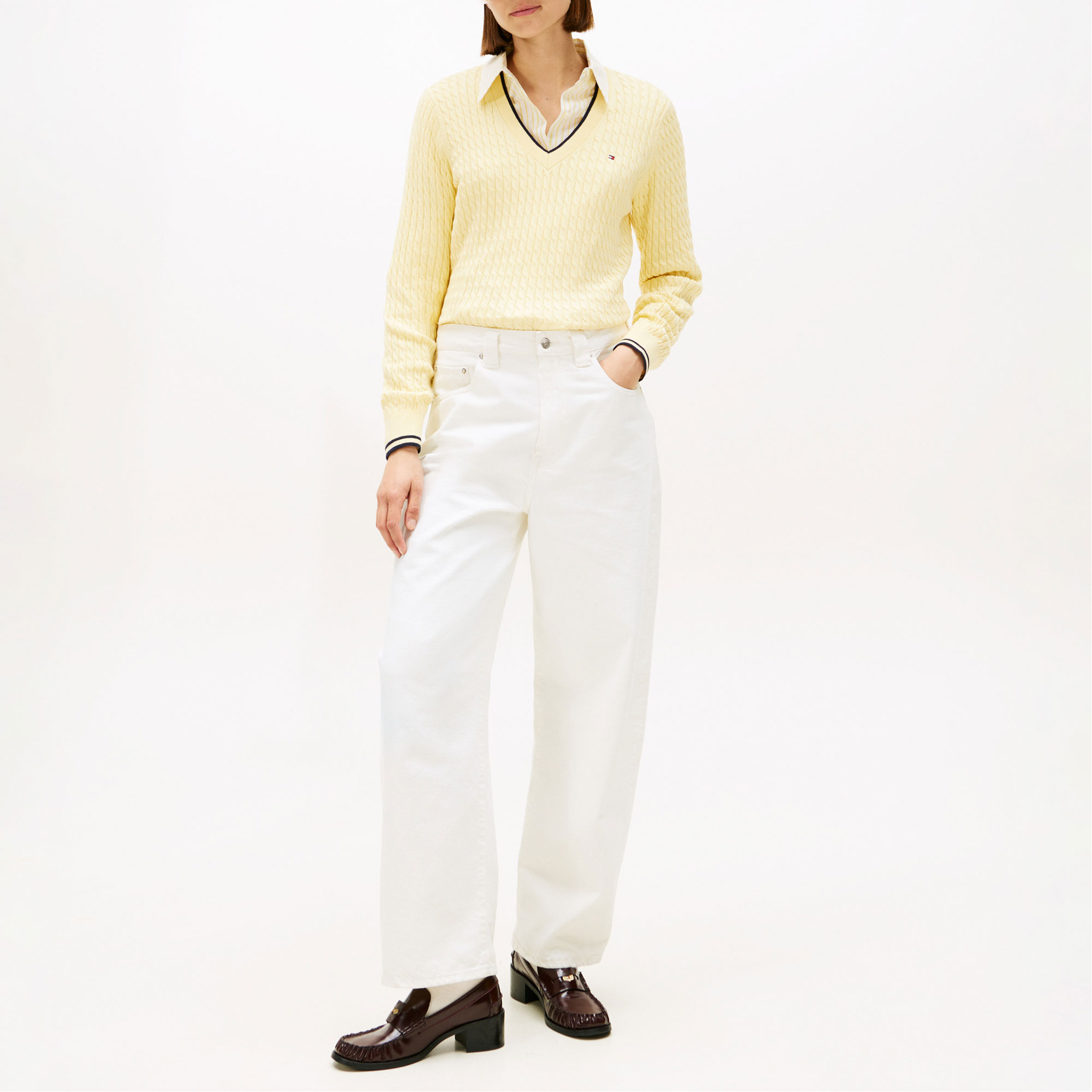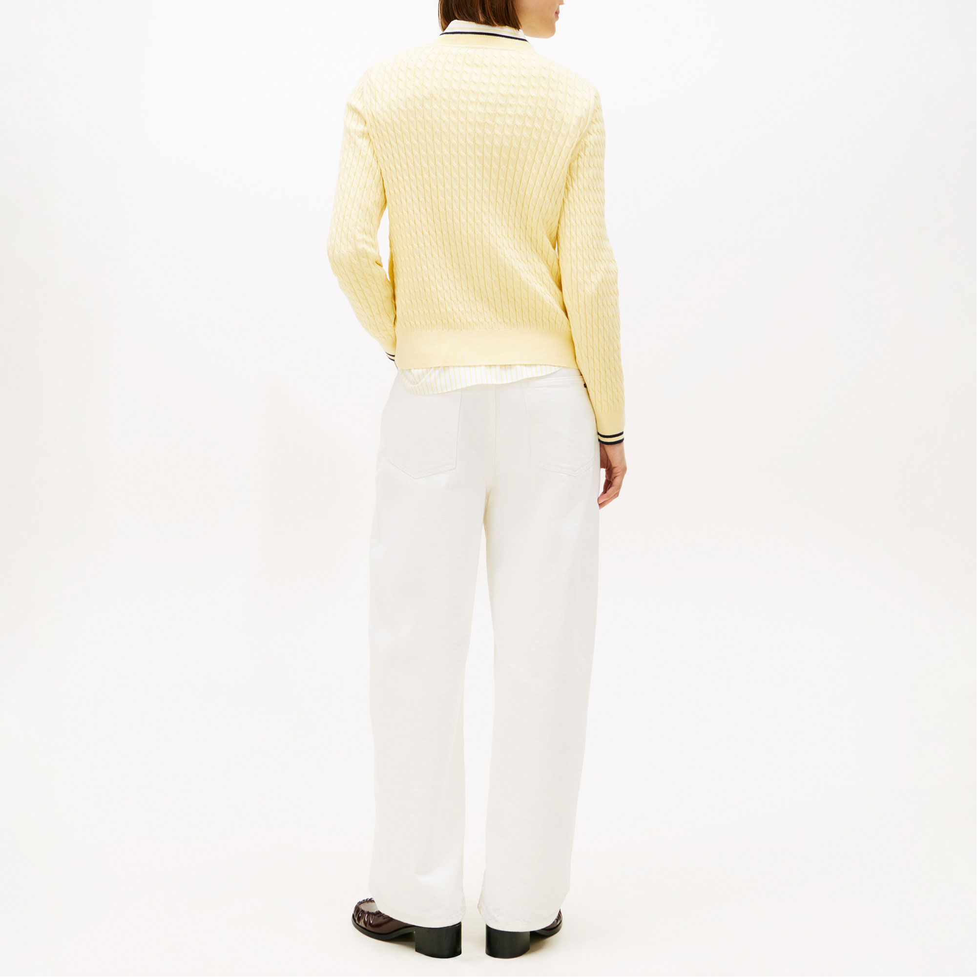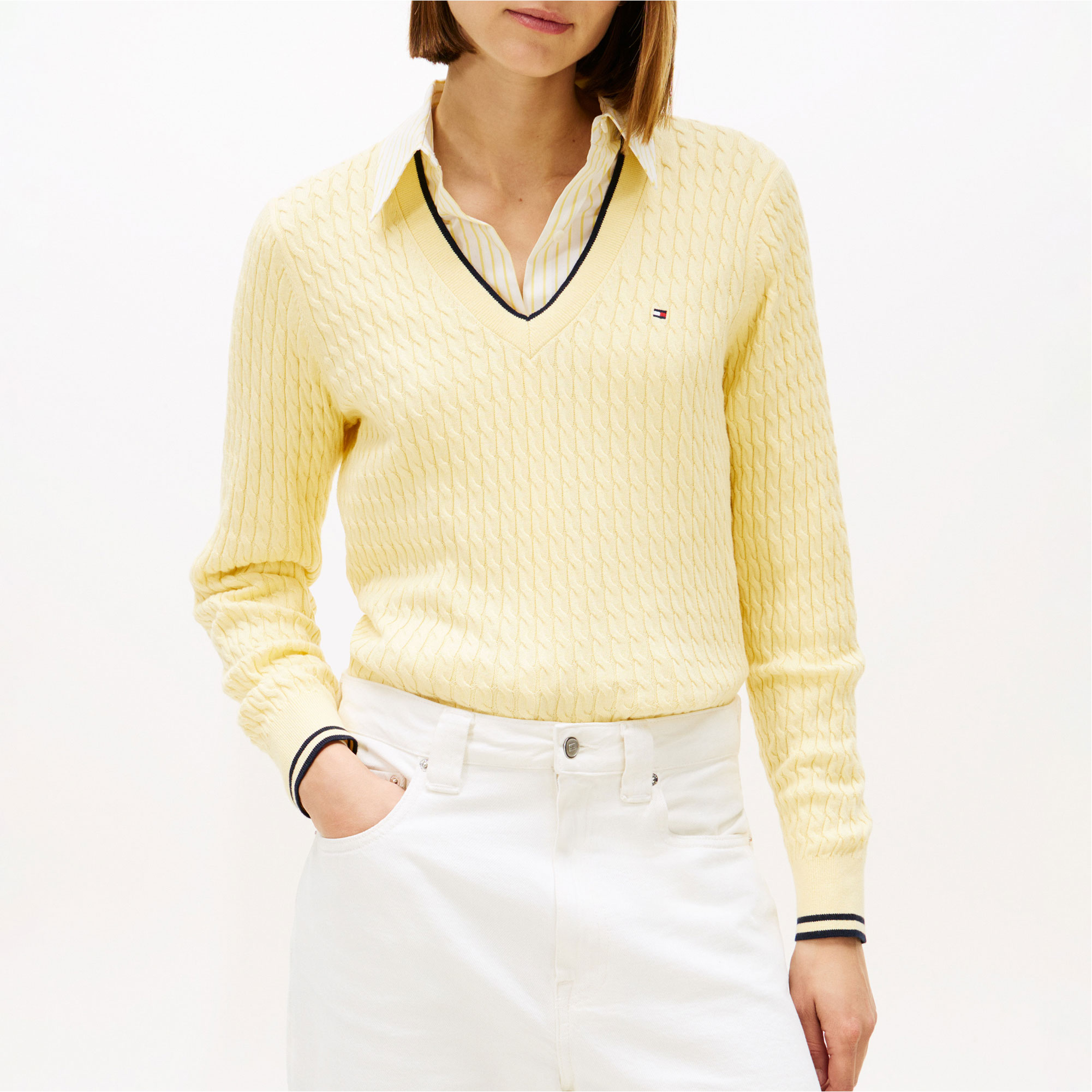 - All-over cable knit, fine gauge, V-neck, rib-knit collar, cuffs and hem, signature tape inside neckline, logo detail