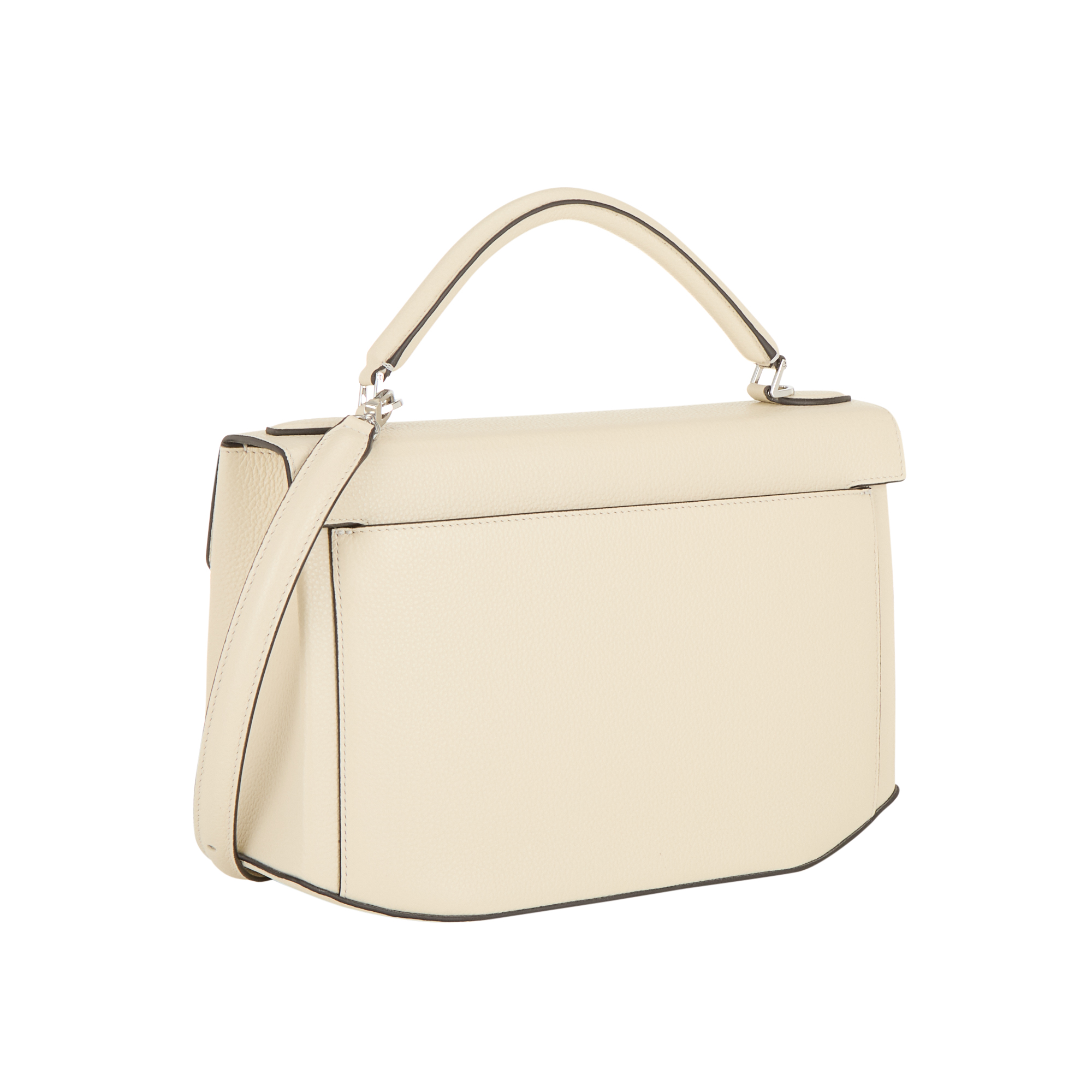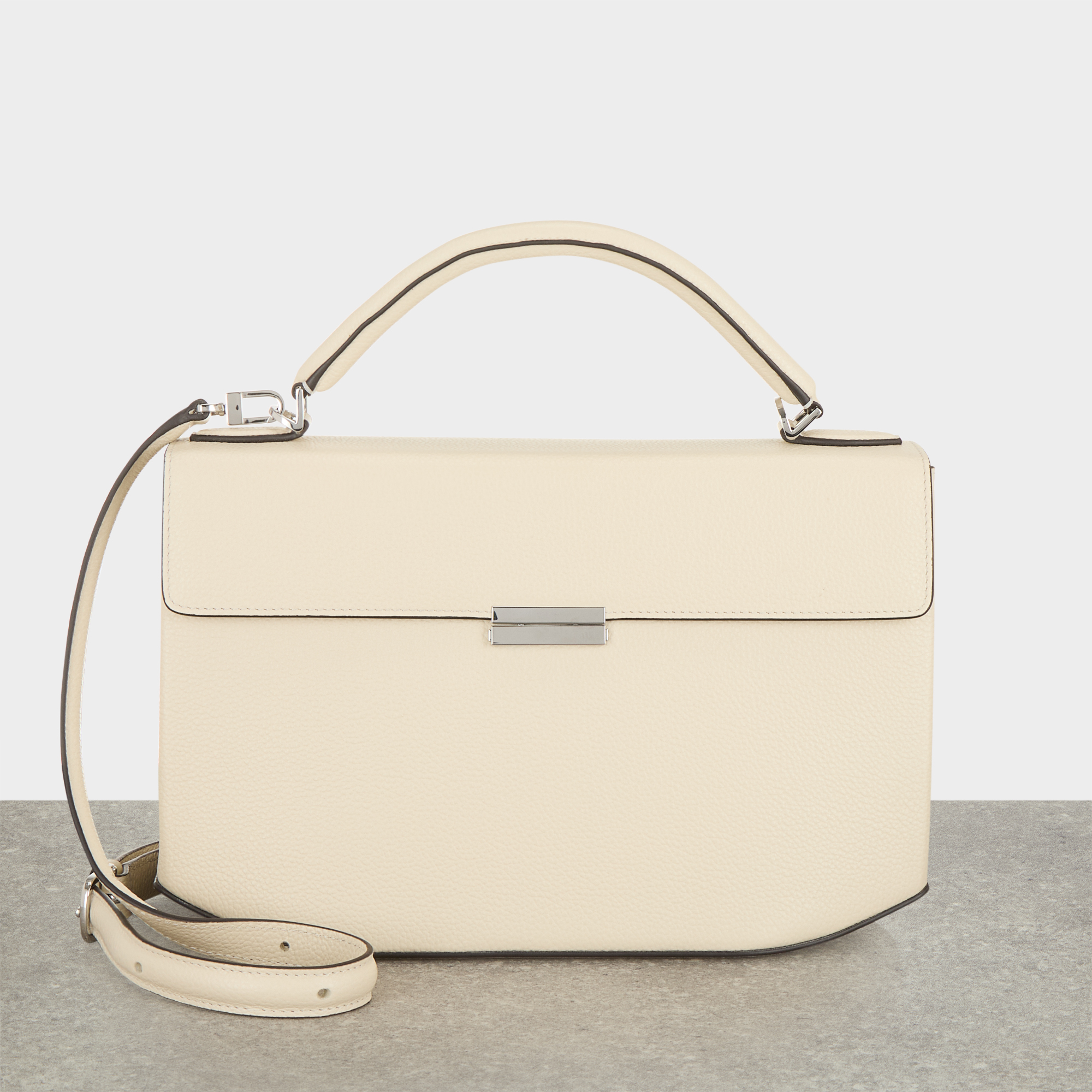 - Top handle, detachable and adjustable crossbody strap, flap closure with clasp fastening, silver-tone hardware, structured silhouette, grained leather finish