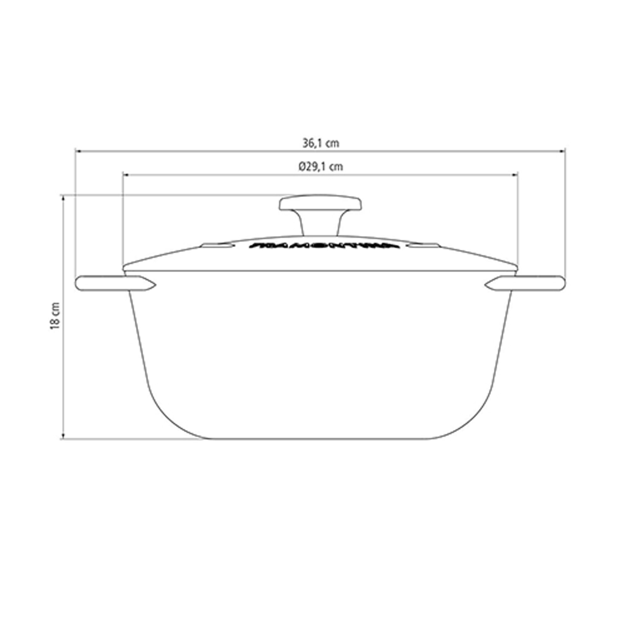 - Dimensions: H 18 x W 29.1 x L36.1cm. Diameter: 28cm. Capacity: 6L