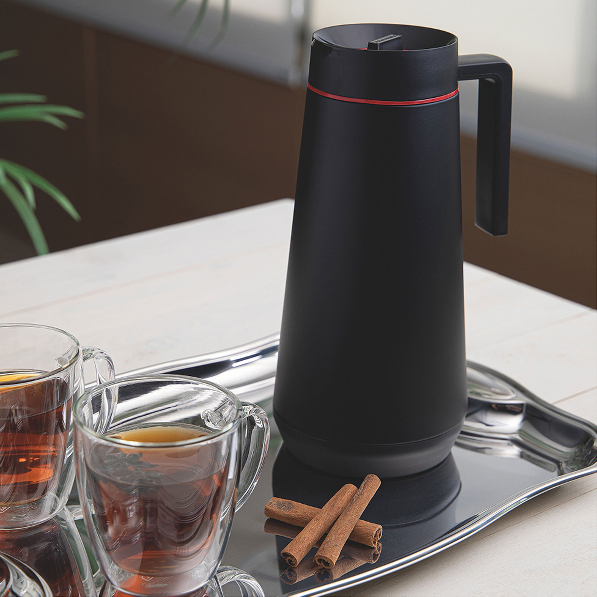 - Thermal flasks, interior glass container, easy open screw top lid, innovative drip-free pour, brushed stainless steel, fingerprint-proof finish, ergonomic handle, BPA free