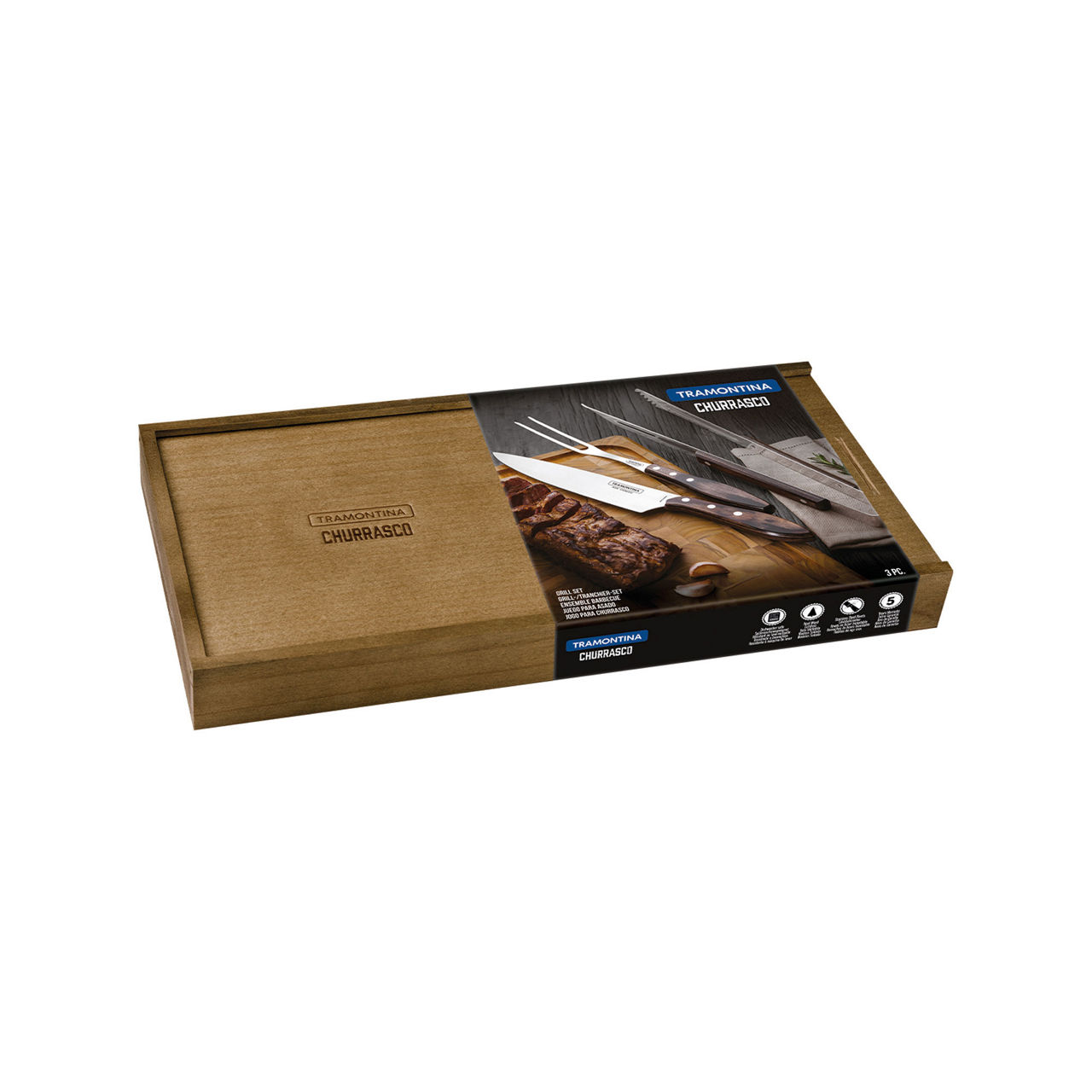 The renowned Pampas region of southern Brazil is the home of the Brazilian barbeque, and it is from here that Tramontina bring their Brazilian hospitality to the global market with their Churrasco collection – a comprehensive range of knives and other essentials for enjoying authentic barbeques. Every expert needs the right tools of the trade and this 3-piece barbeque/carving set is just what is needed to perfect the most authentic barbeque to enjoy with family and friends. The set offers many outstanding features such as a super-sharp stainless steel blade on the meat knife and distinctive stainless-steel rivets which guarantee safety and security as well as a very characteristic appearance. Stylish, sculpted ergonomic handles are made from high quality polywood (real wood) from FSC certified forests which are dishwasher safe, impact and high temperature resistant and, uniquely, come with a 5-year warranty. They are exquisitely presented in a rustic wooden box which is great for storage as well as for gifting. Composition: 1x Meat tongs; 1x 8” meat knife; 1x carving fork About Tramontina: Tramontina manufactures homeware products in Brazil to the highest quality standards, supplying over 120 countries. All products ship from our UK warehouse.