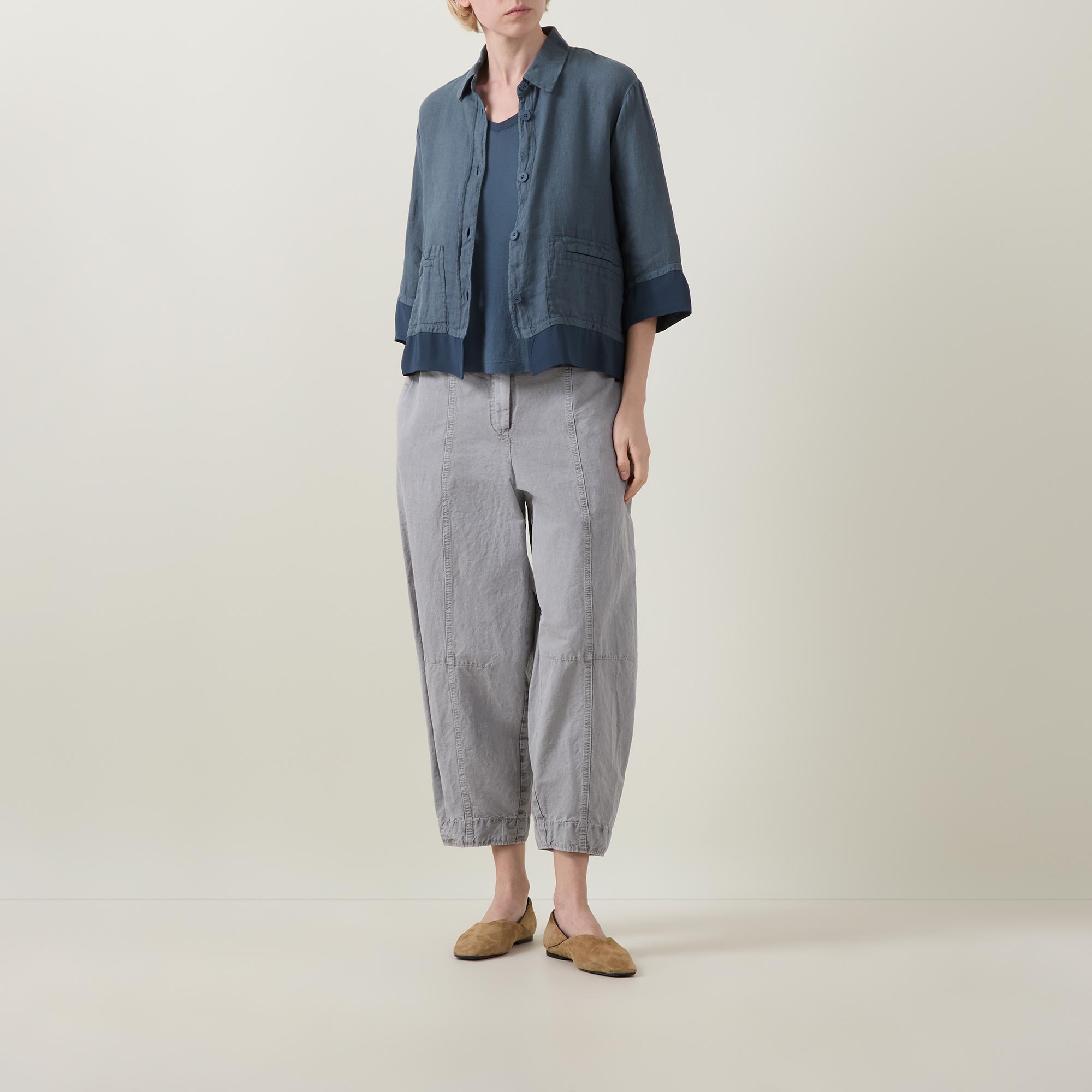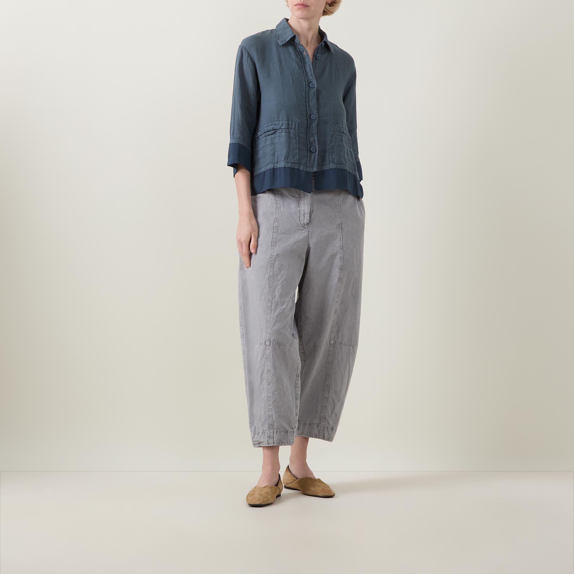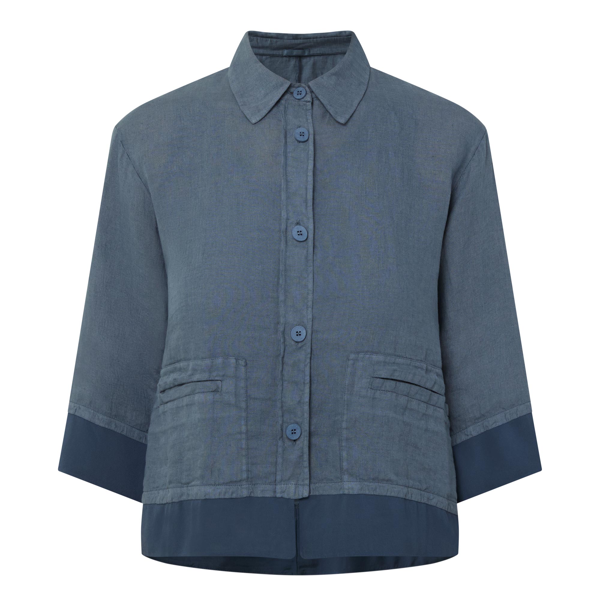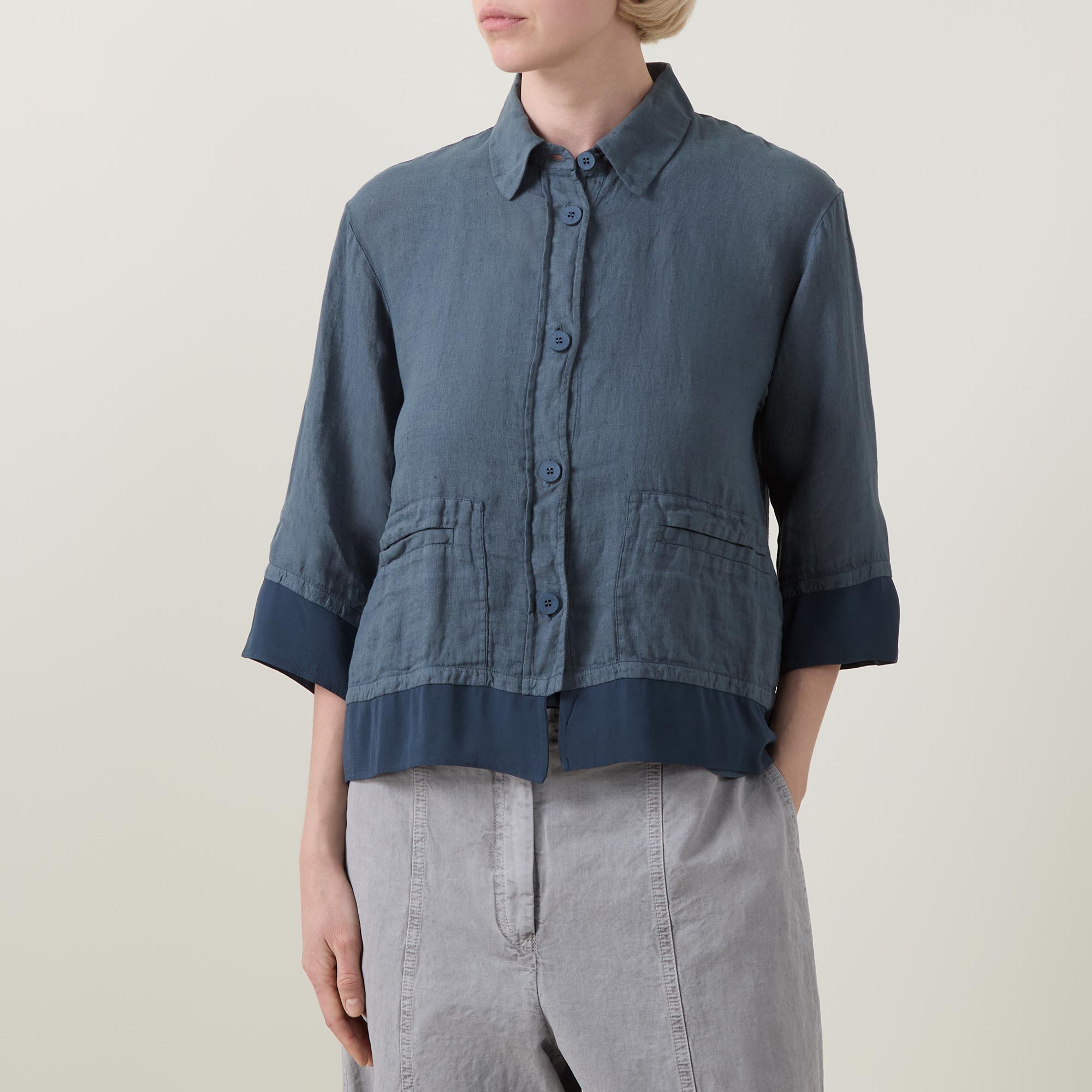 - Point collar, dropped shoulders, three quarter length sleeves, front button fastening, two front welt pockets, straight hem, layered effect, contrasting fabric finish