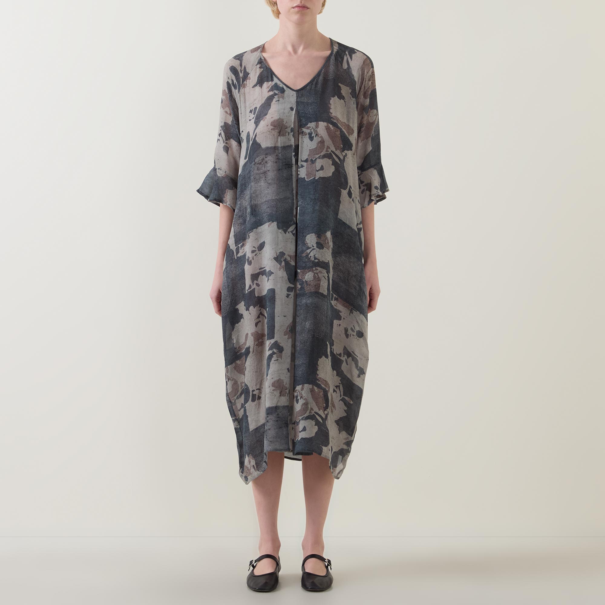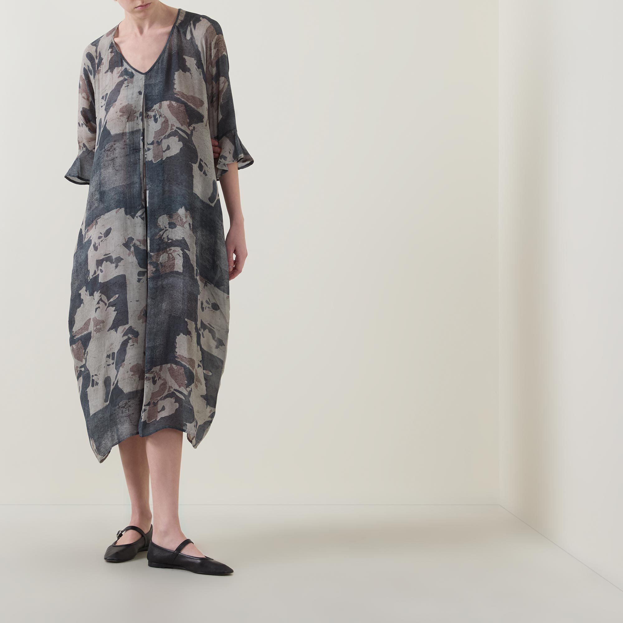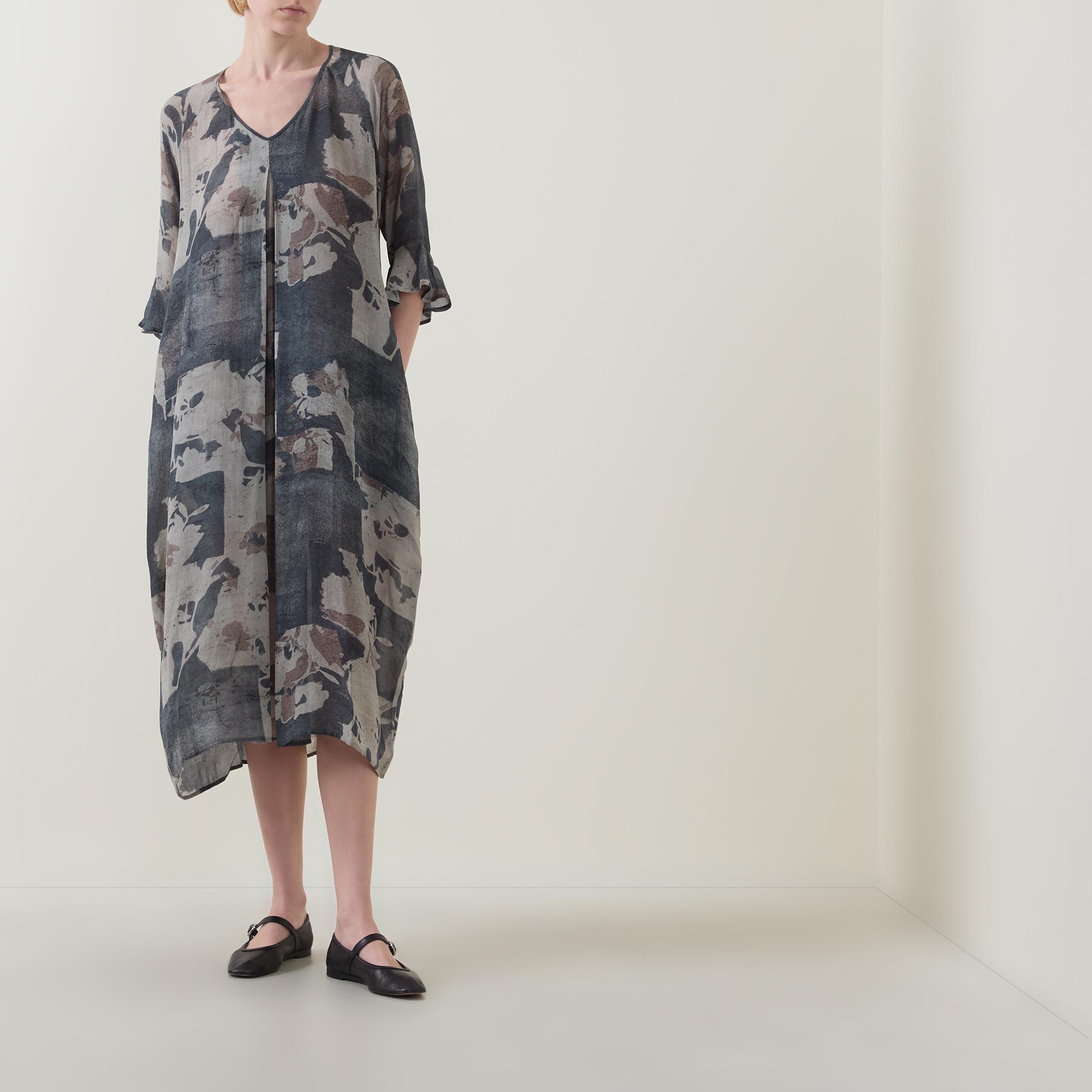 - V-neckline, dropped shoulders, half length sleeves, flared cuffs, front pleat detail, two side in seam pockets, asymmetric hem, all over printed design, midi length
