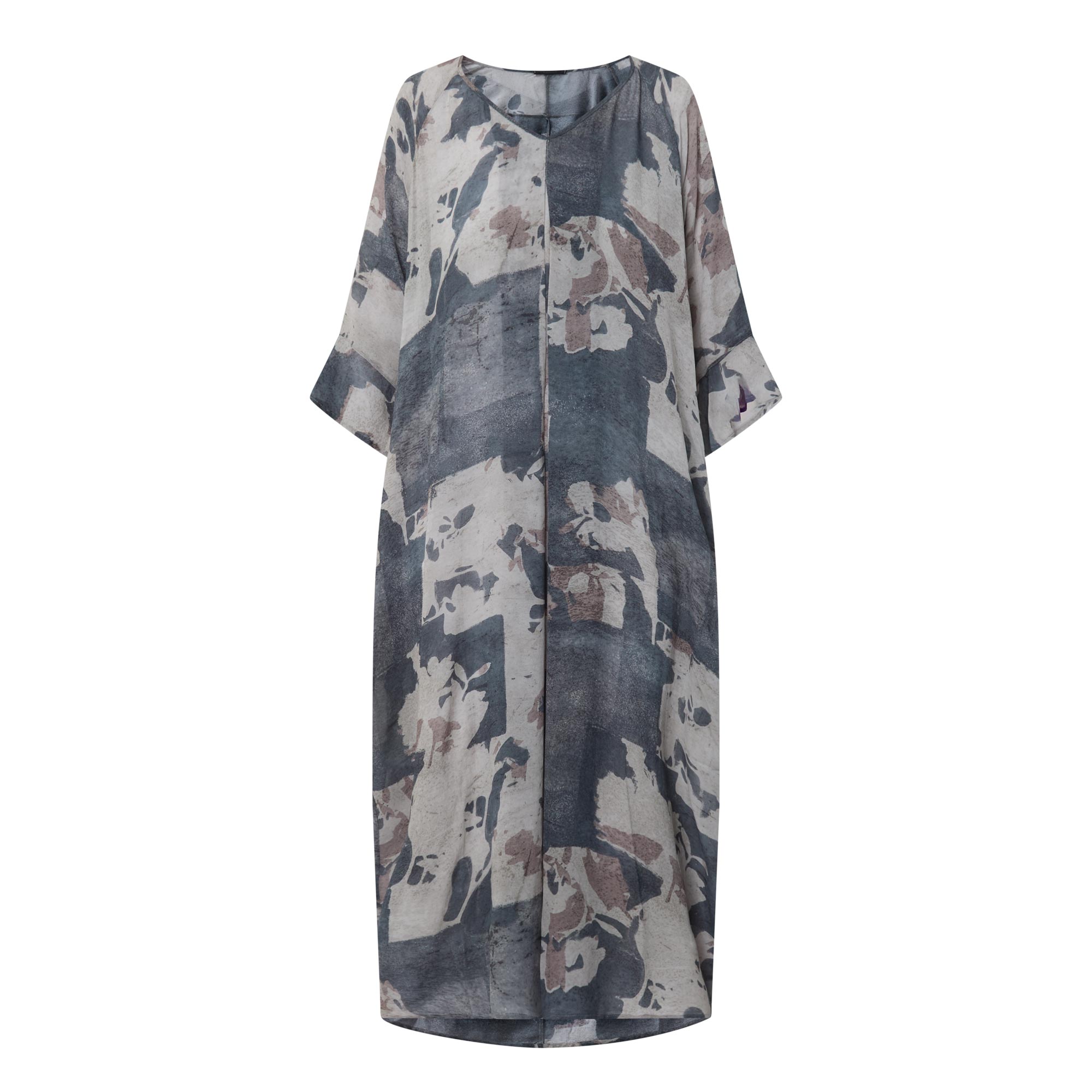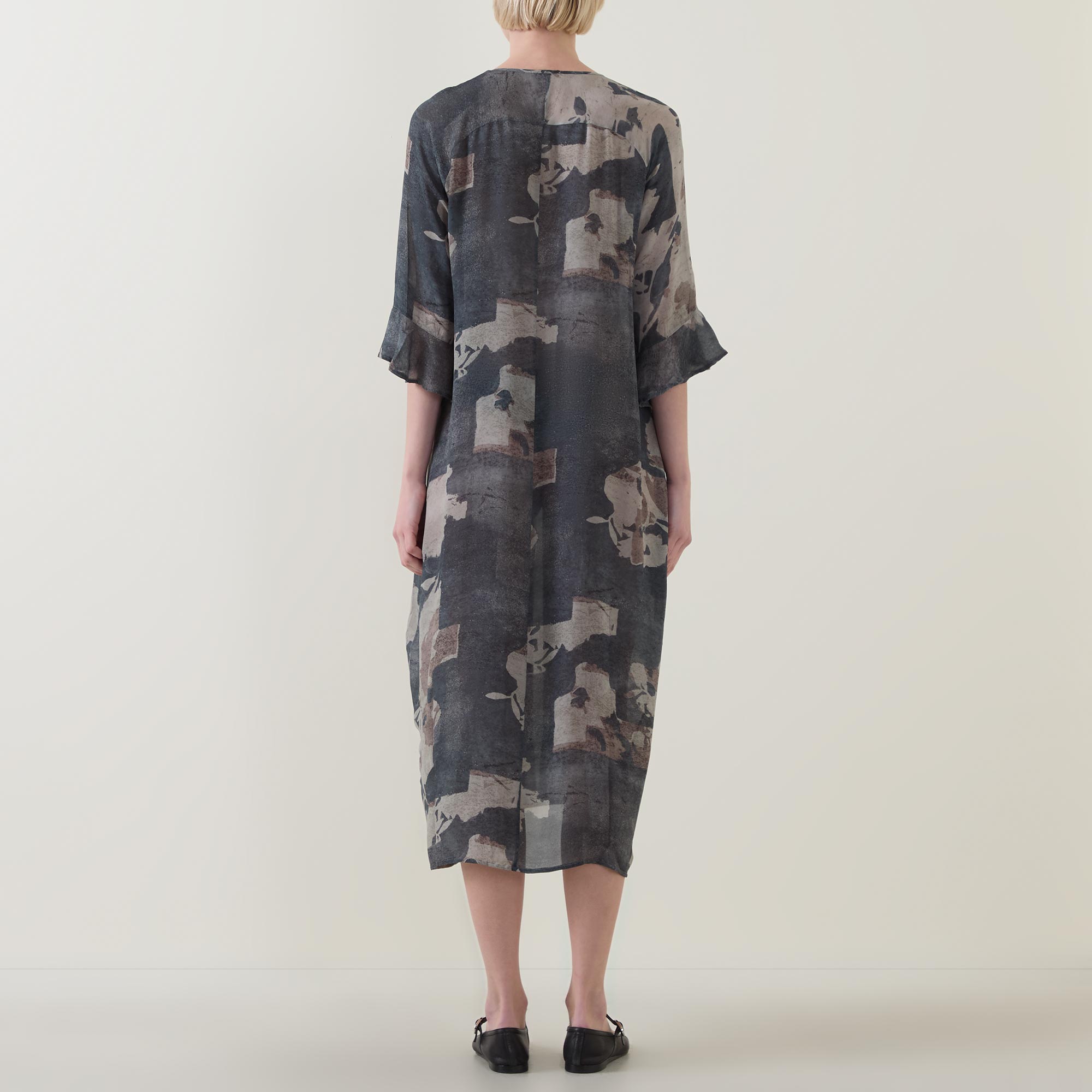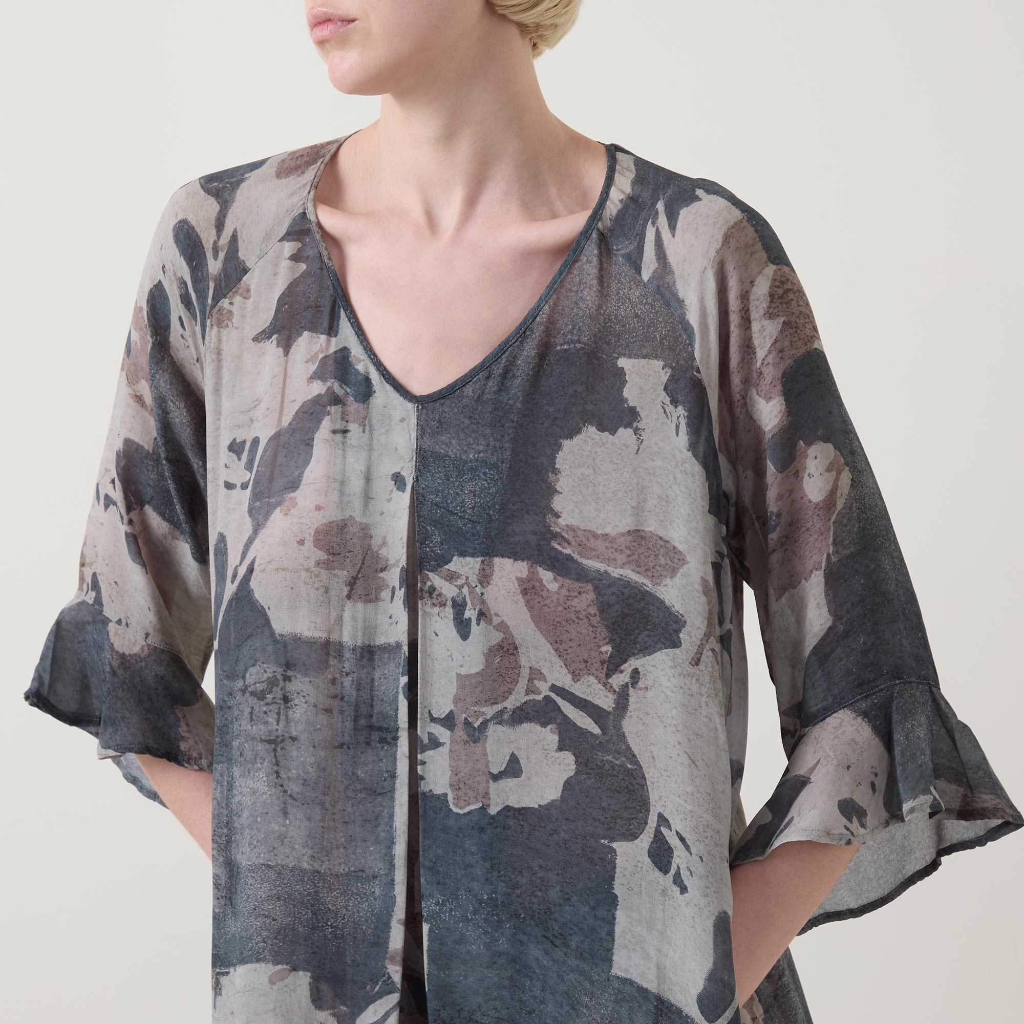 - V-neckline, dropped shoulders, half length sleeves, flared cuffs, front pleat detail, two side in seam pockets, asymmetric hem, all over printed design, midi length