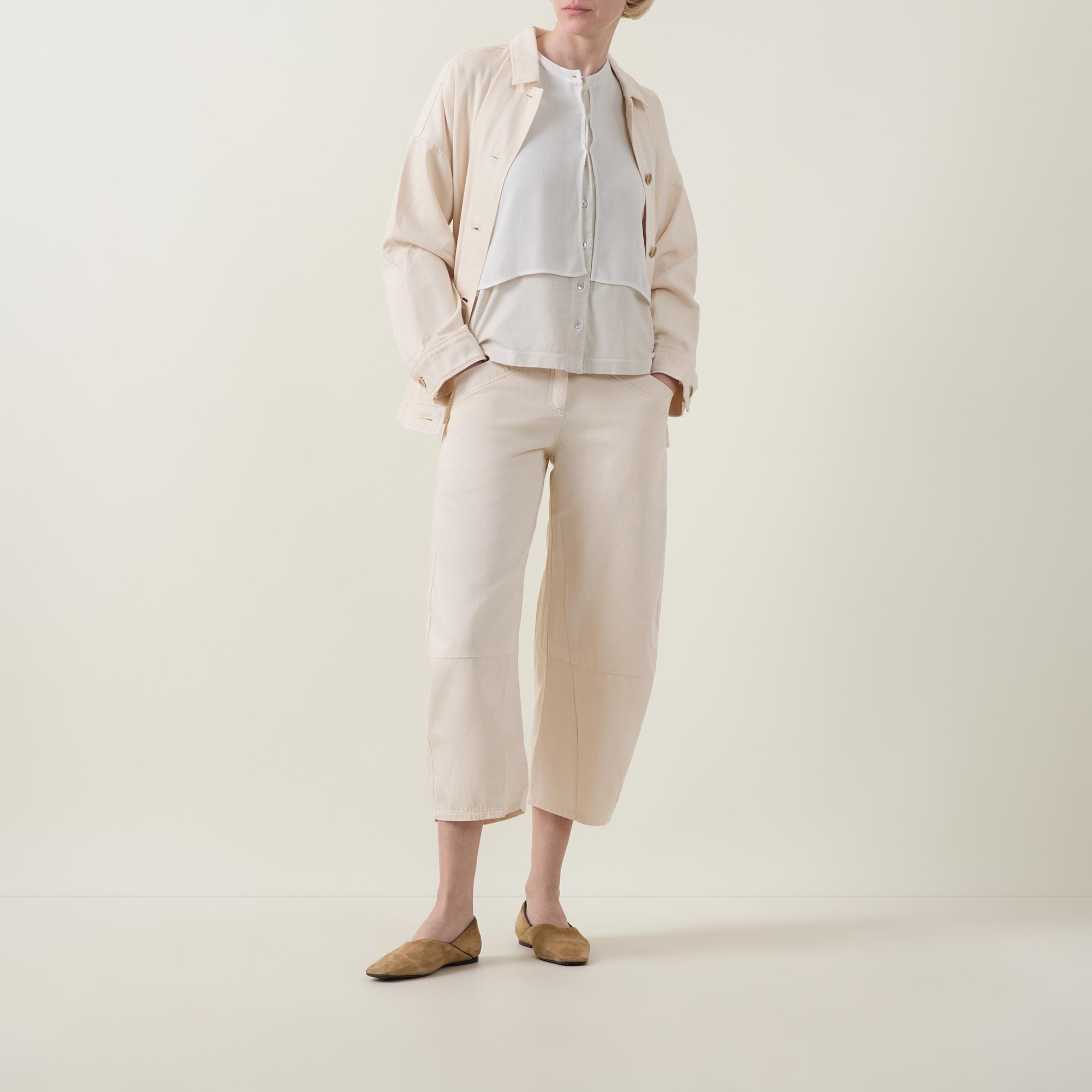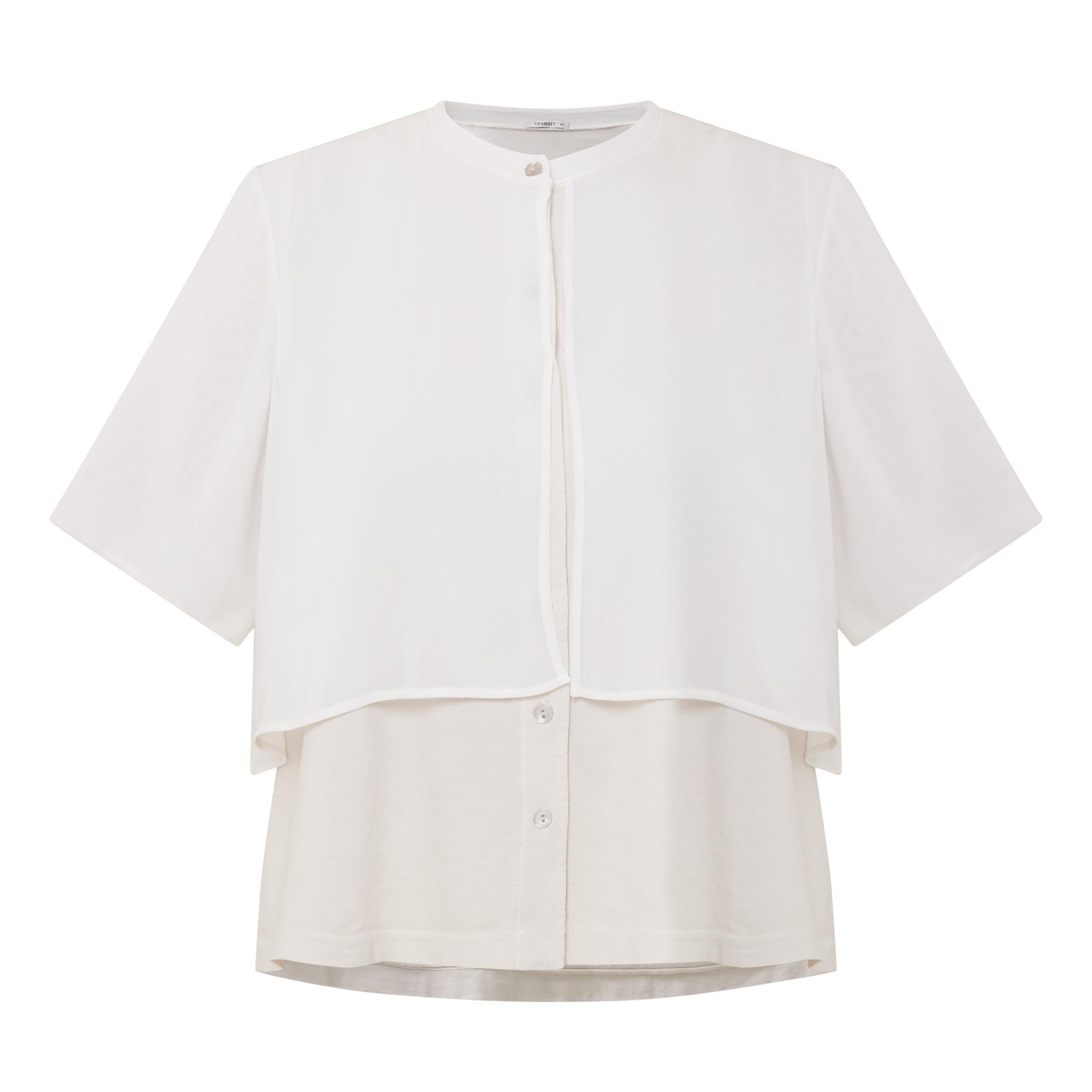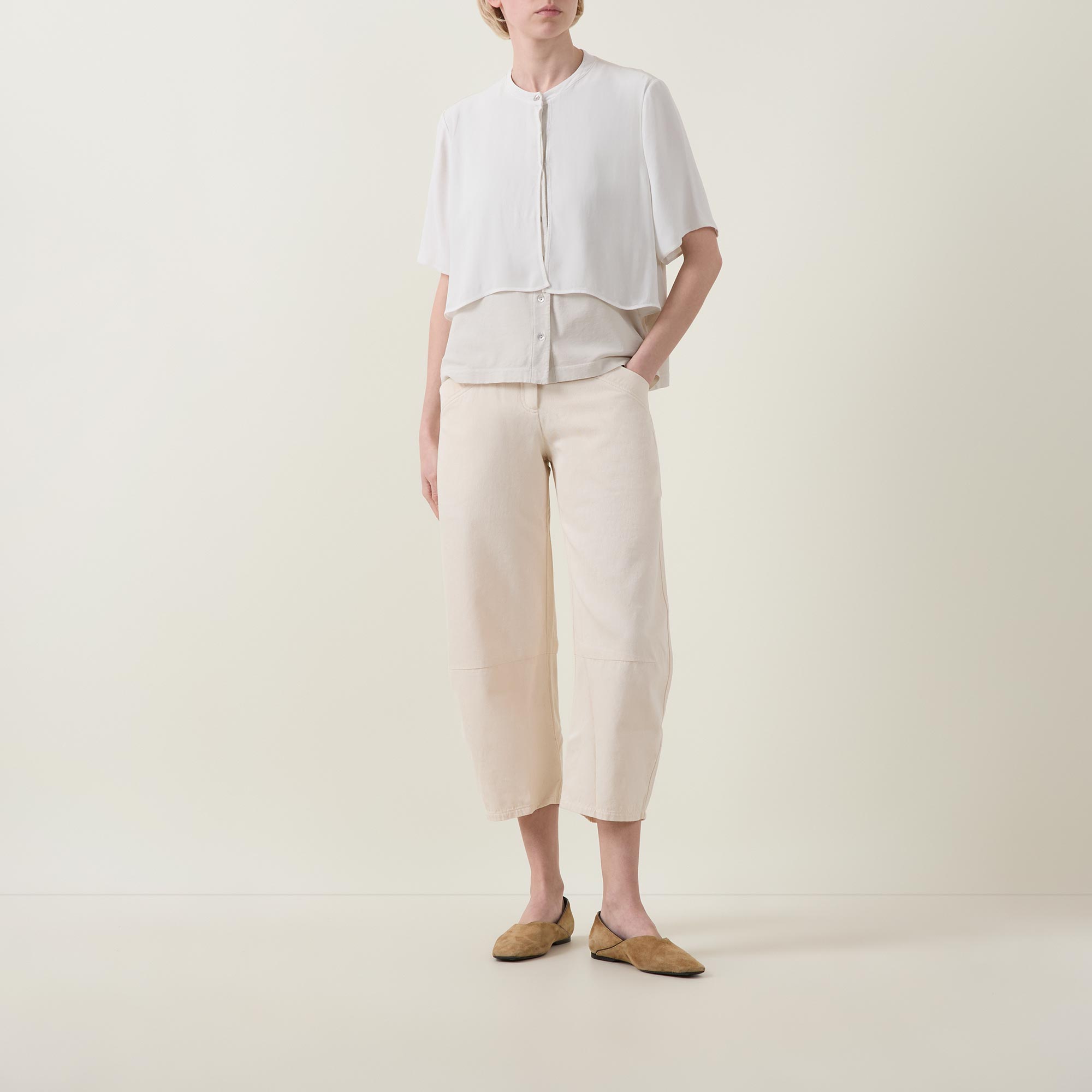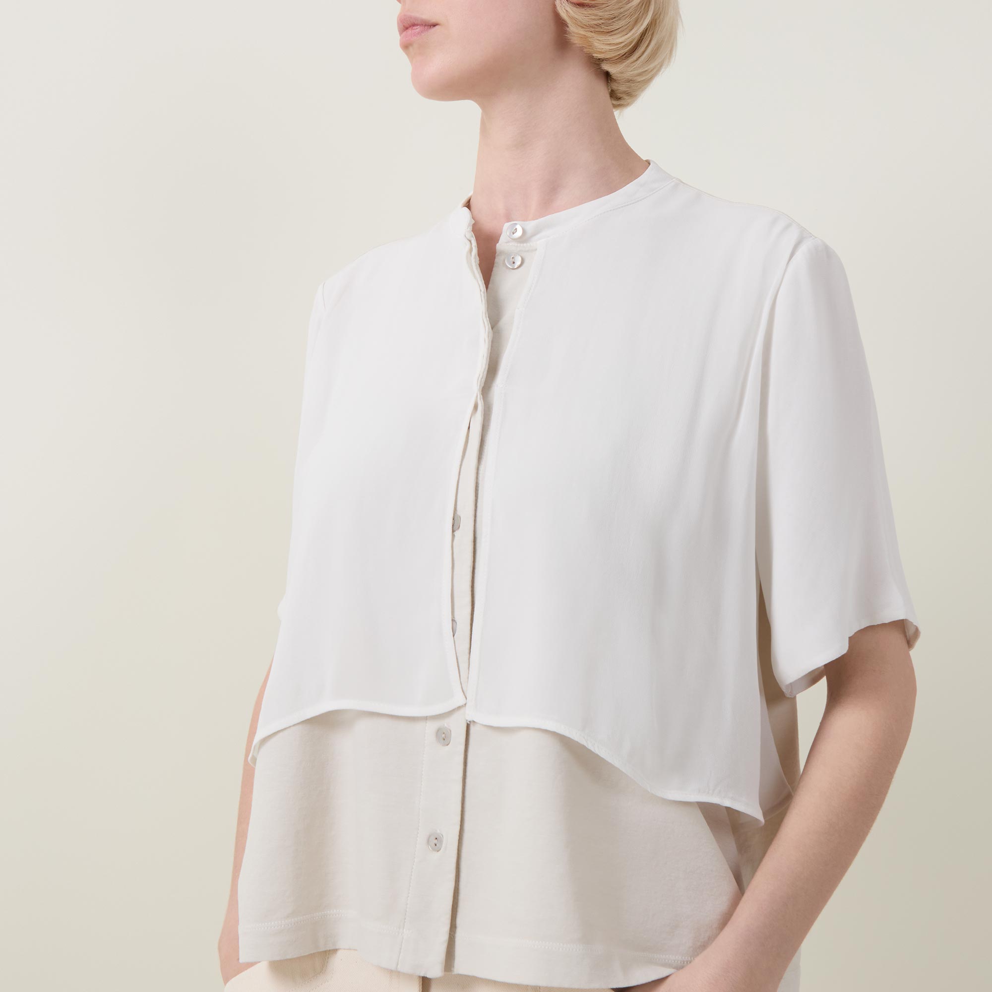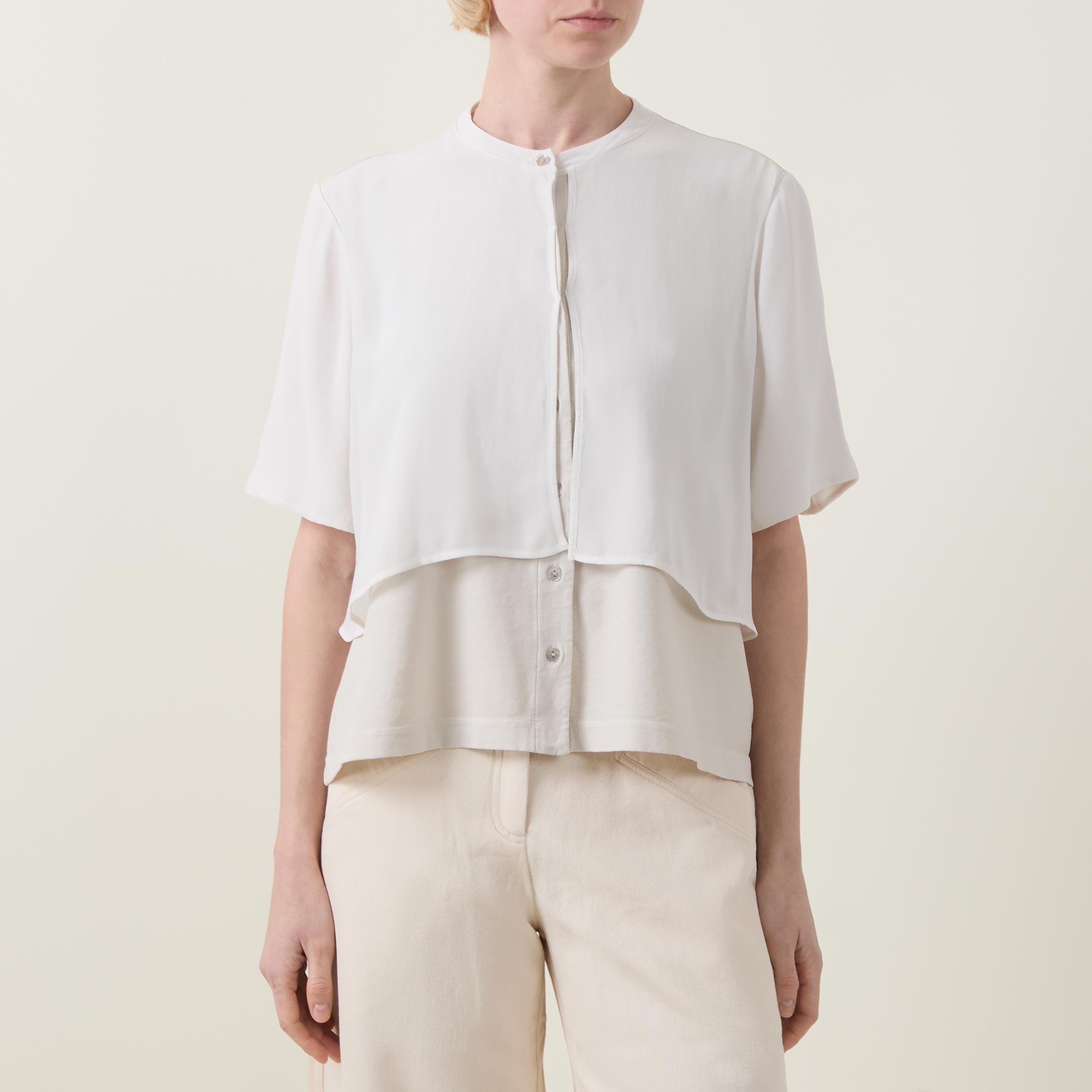 - Round neckline, dropped shoulders, short sleeves, front button fastening, straight hem, layered style, smooth finish