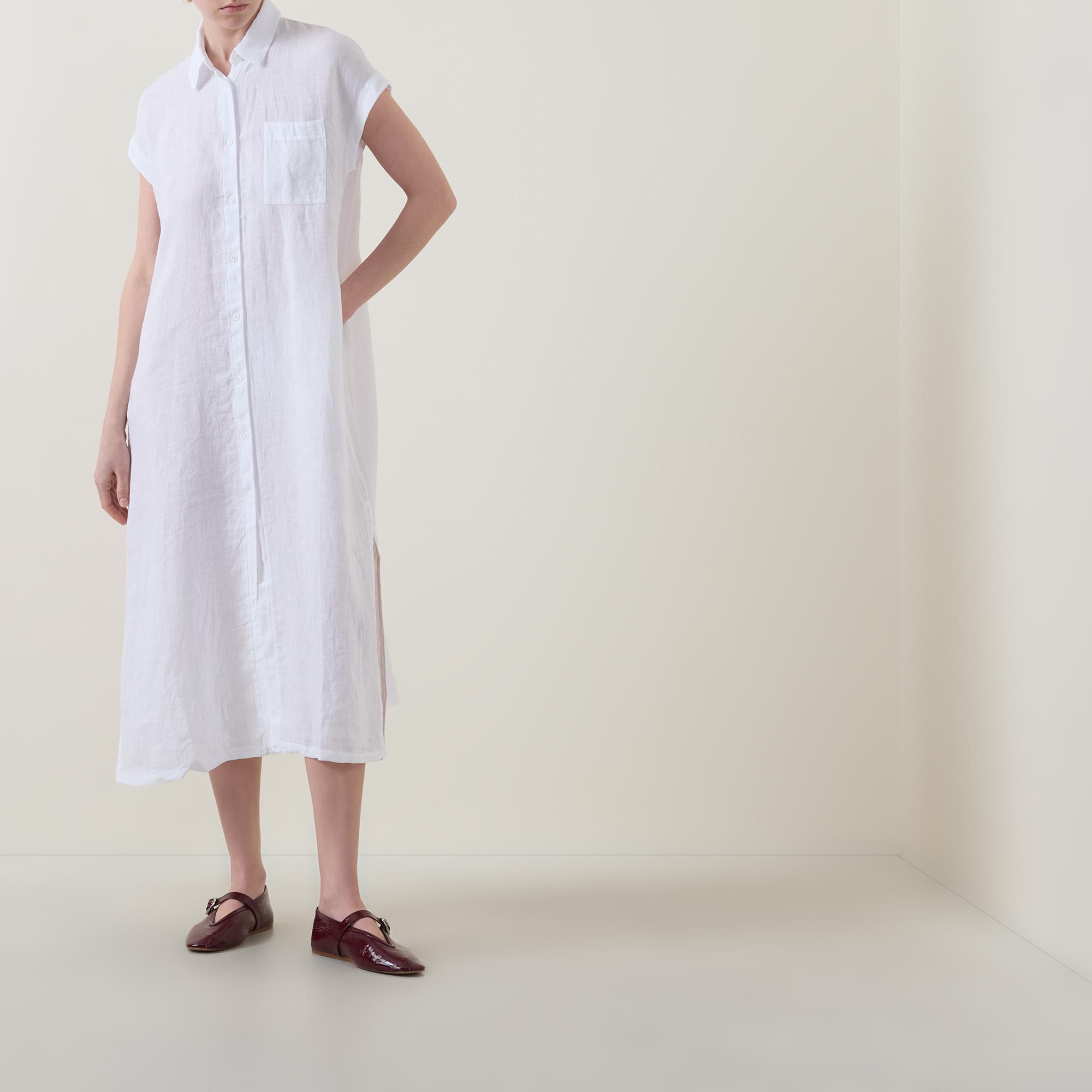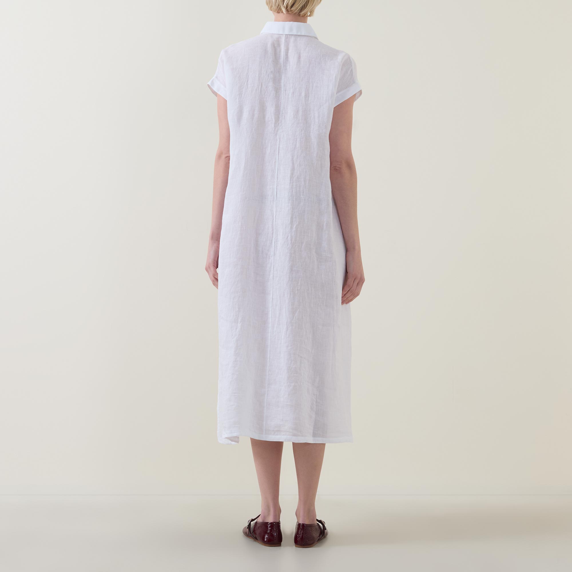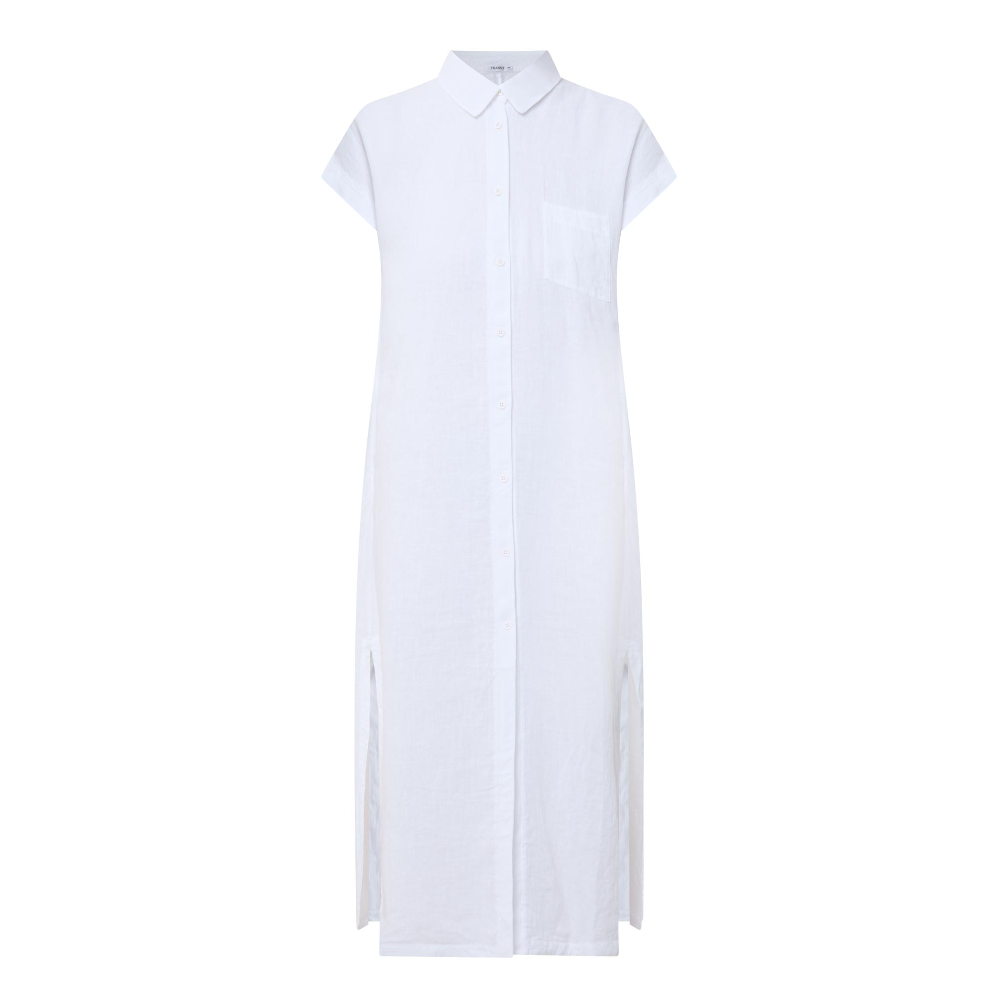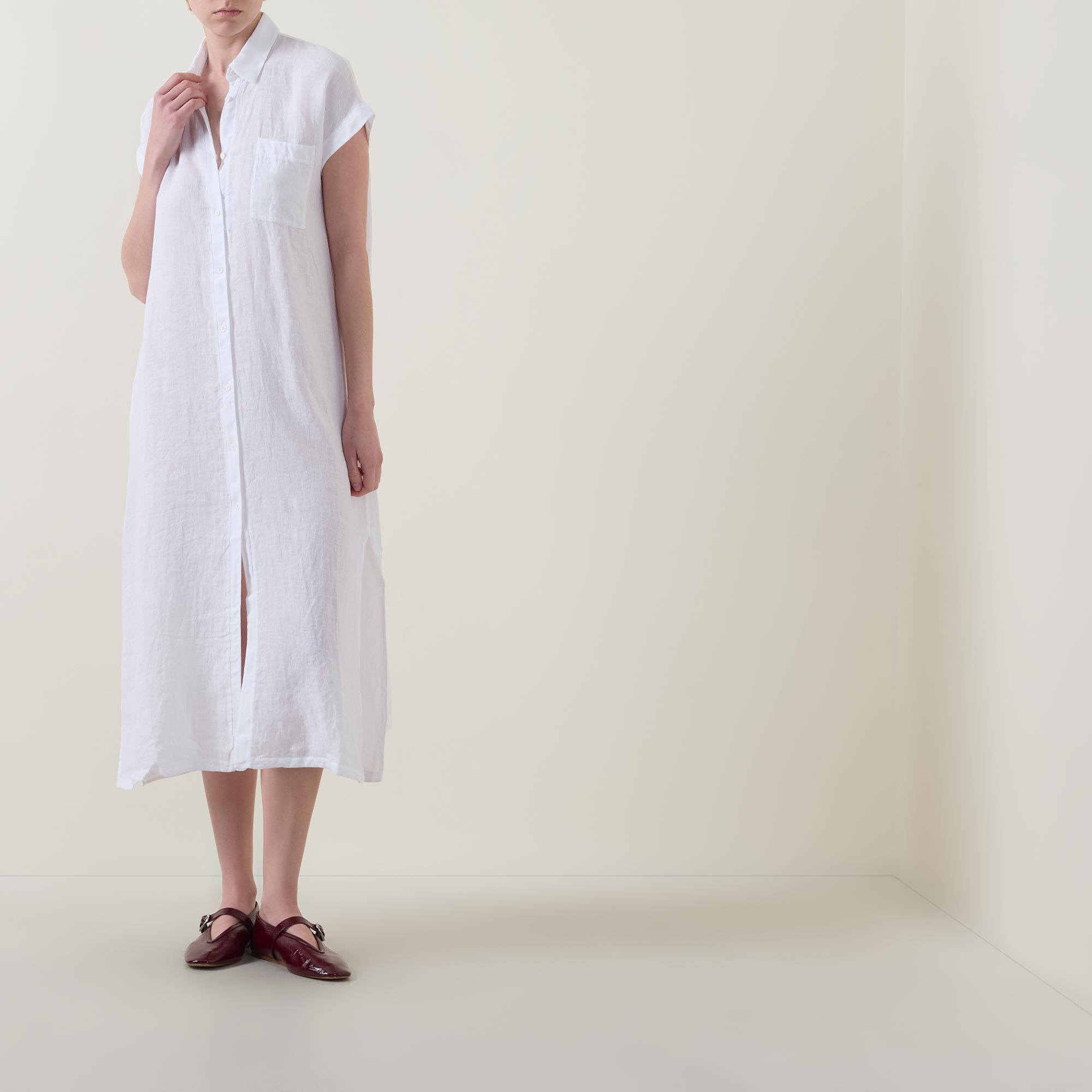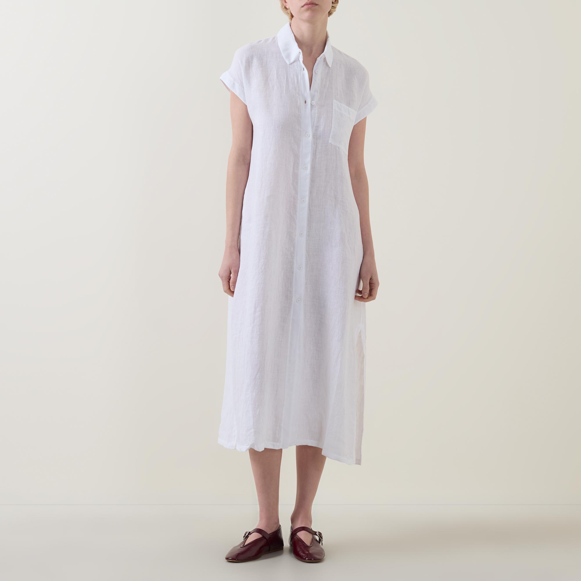 - Point collar, short sleeves, bound cuffs, front button placket, one chest patch pocket, straight hem, side split detailing, midi length