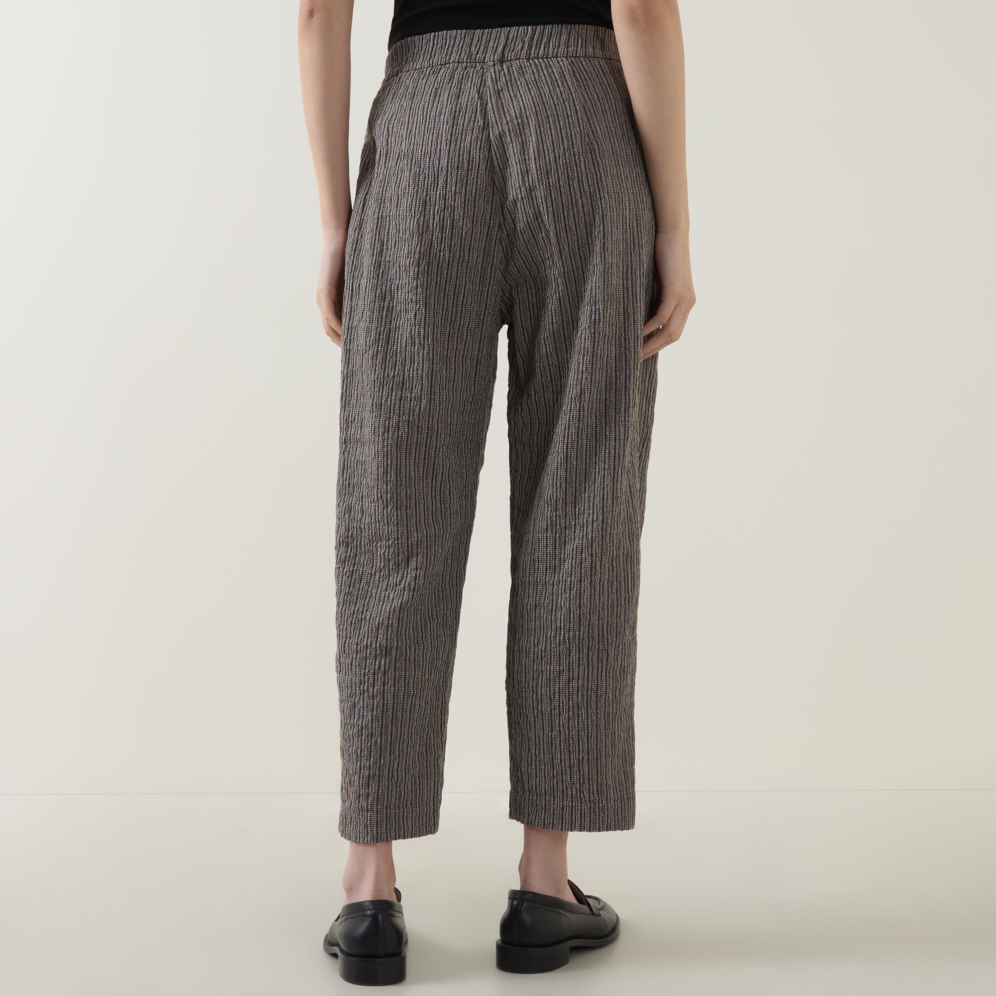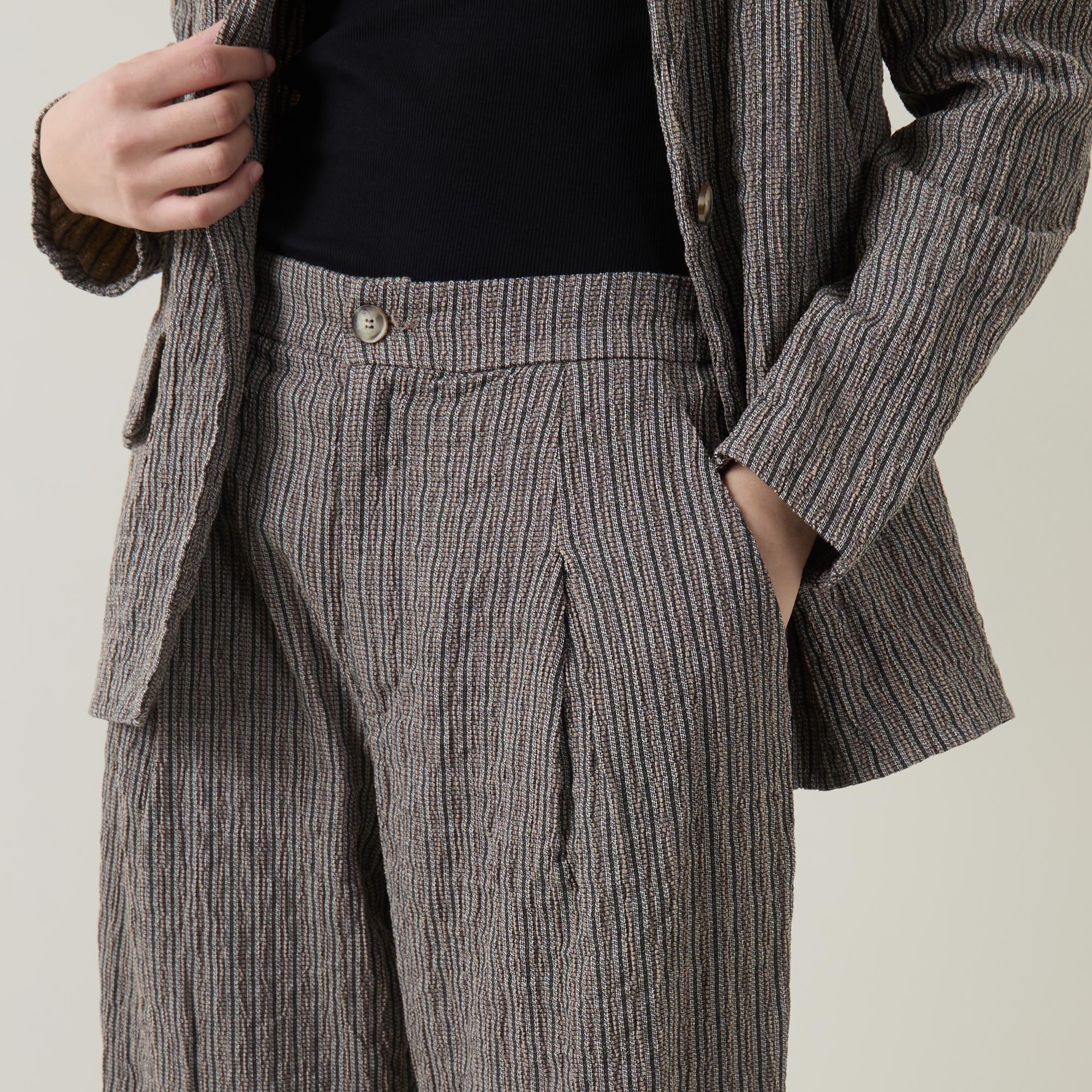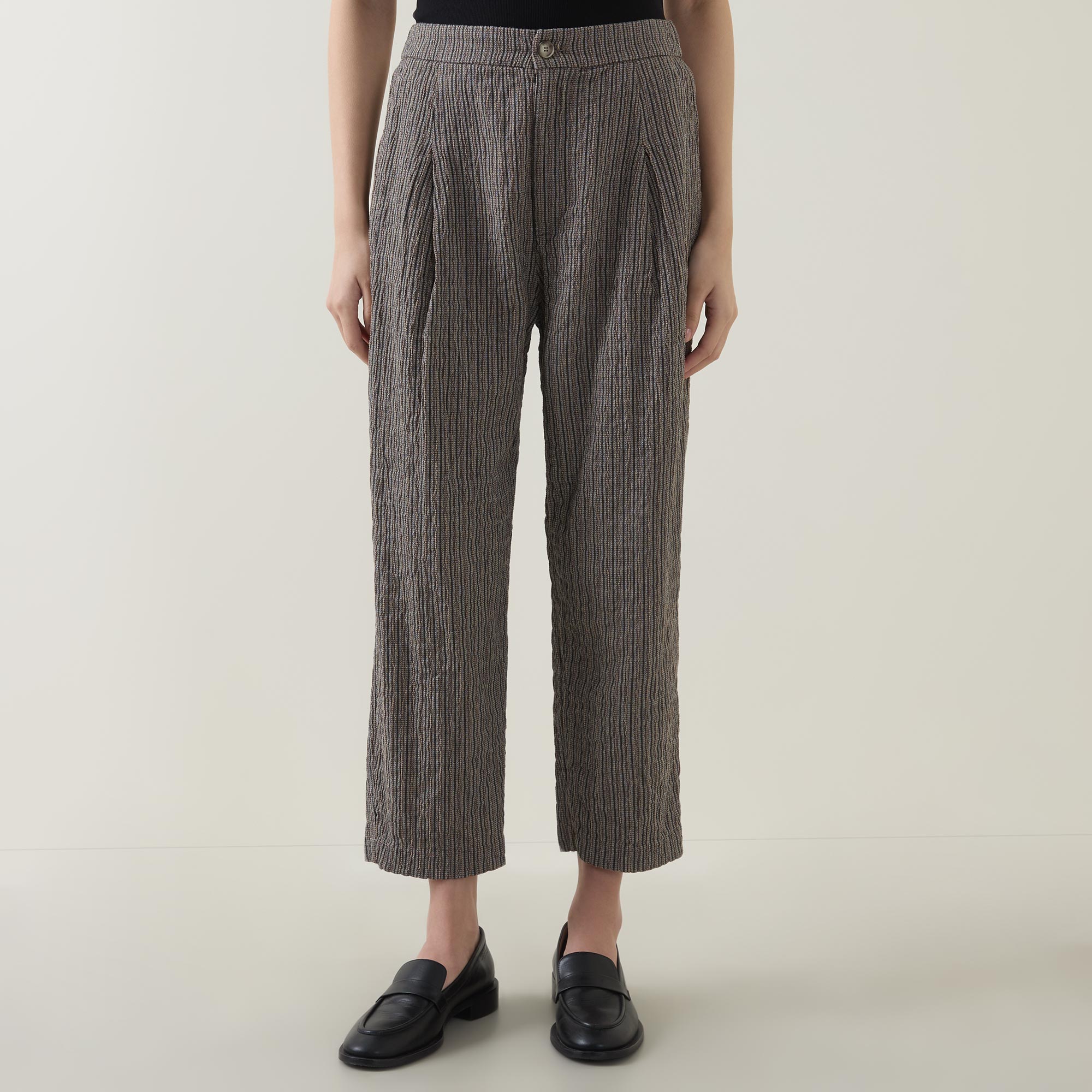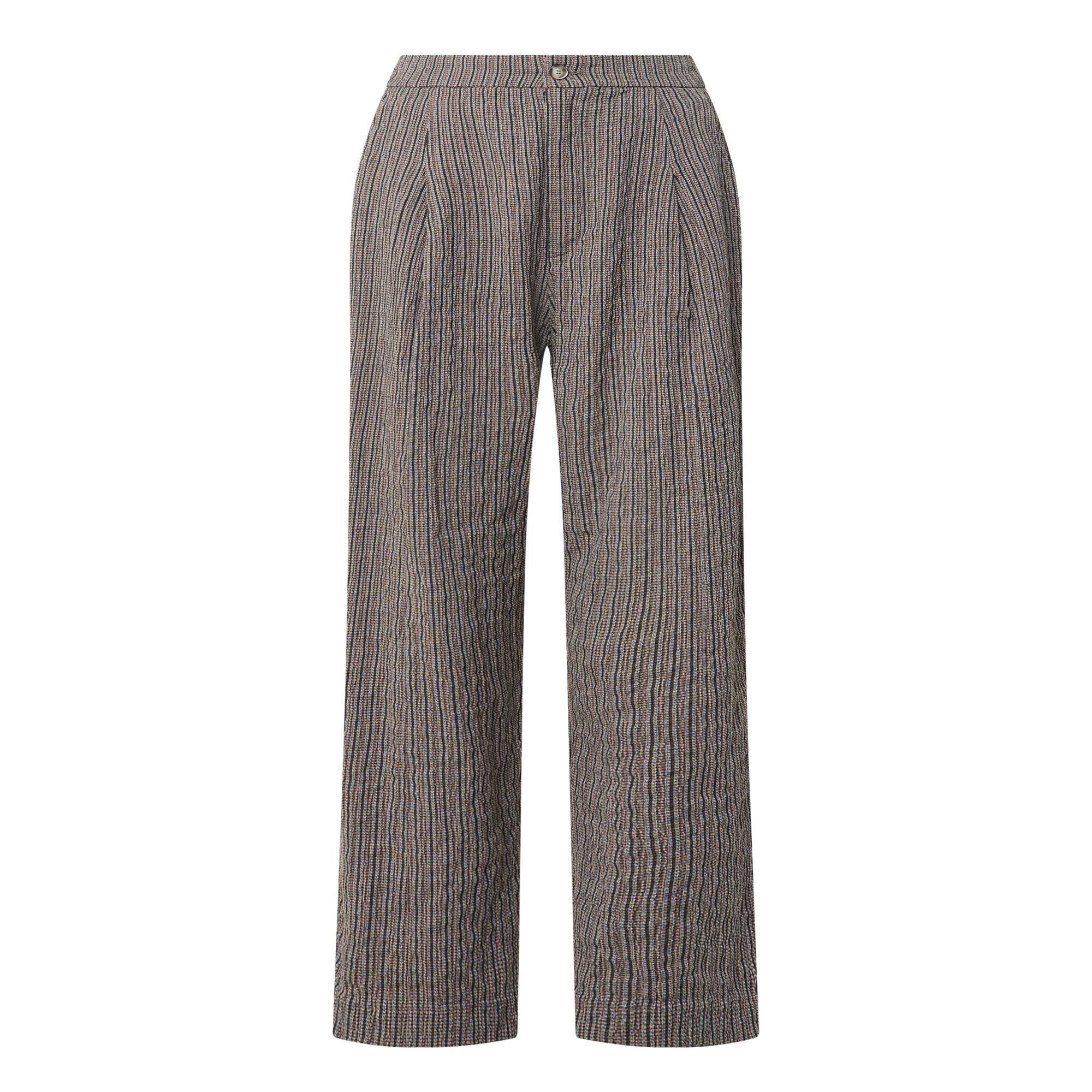 - Button and fly zip fastening, part-elasticated waistband, side-entry pockets, tapered cut, pleated details to the front, textured pinstripe pattern