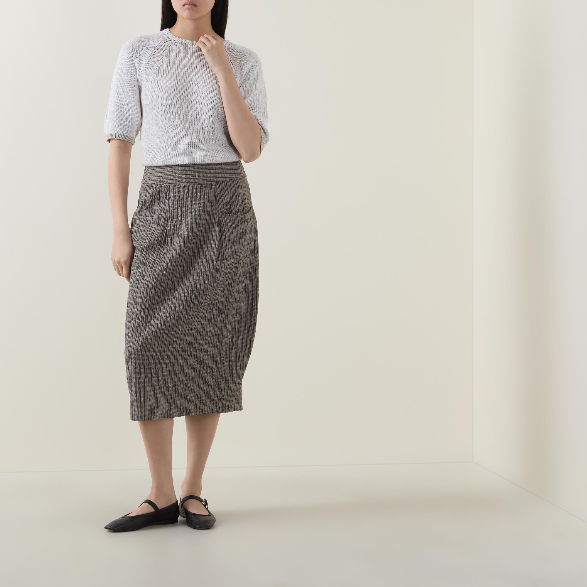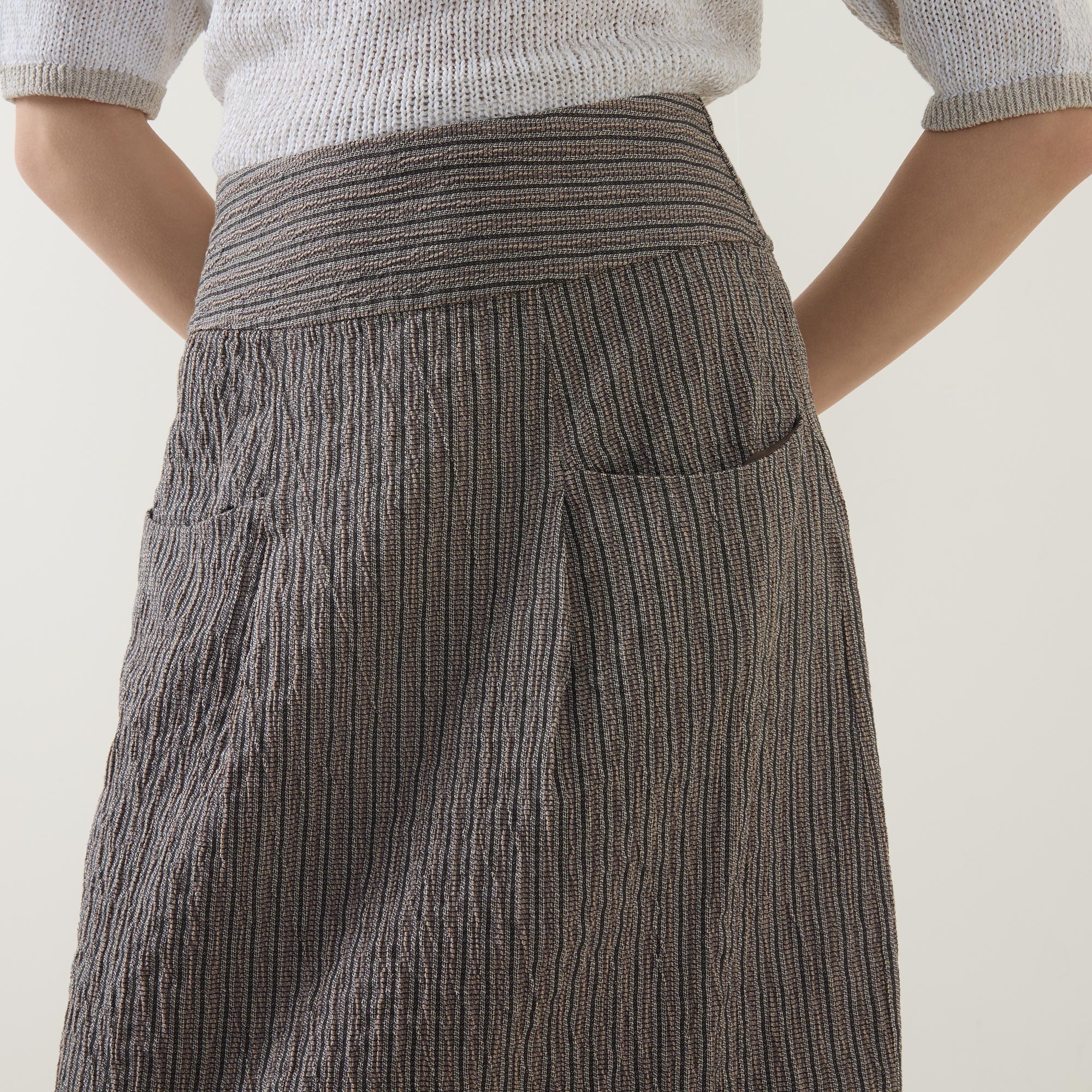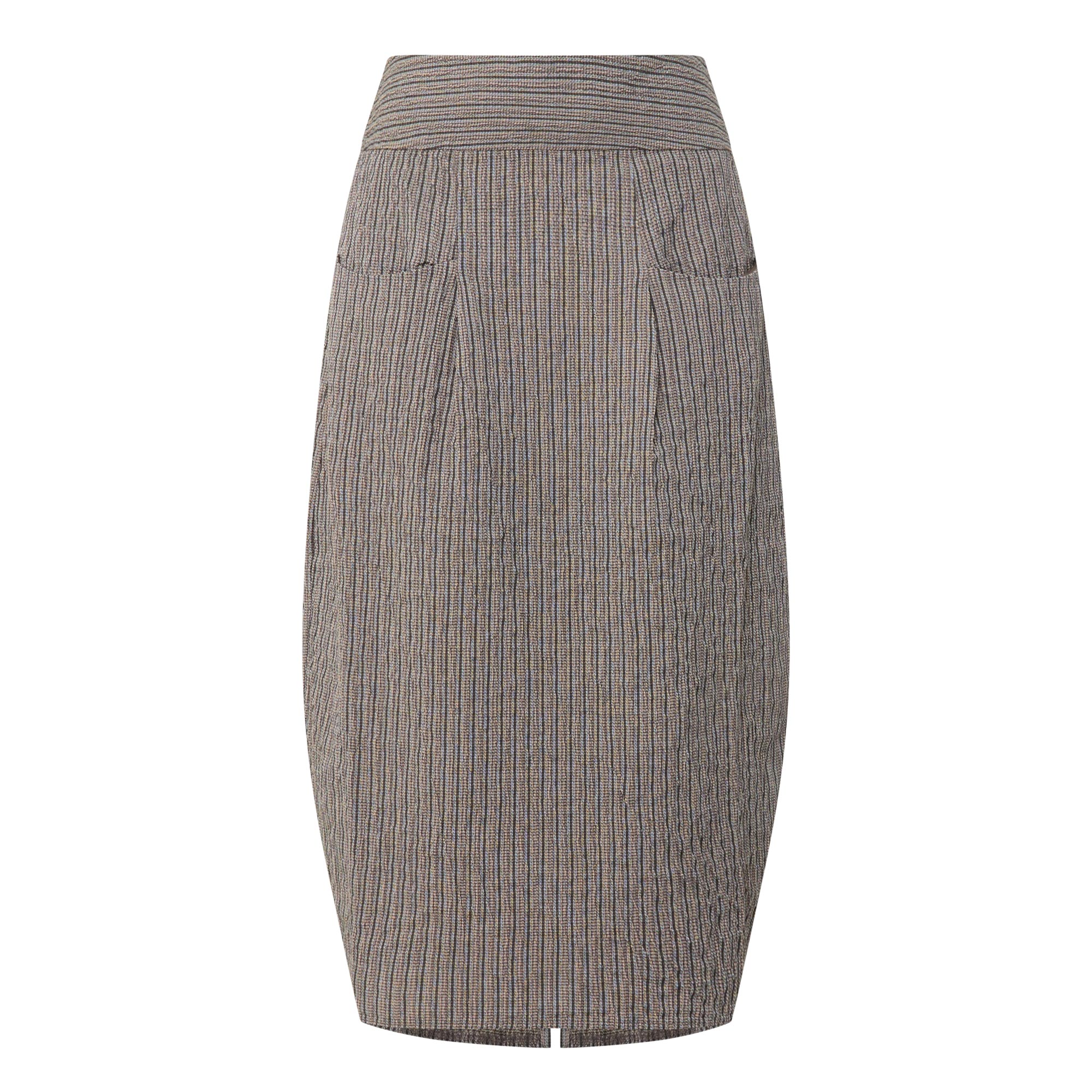 - Wide waistband, zip fastening to the back, midi length, vent to the rear, textured pinstripe pattern, front patch pockets