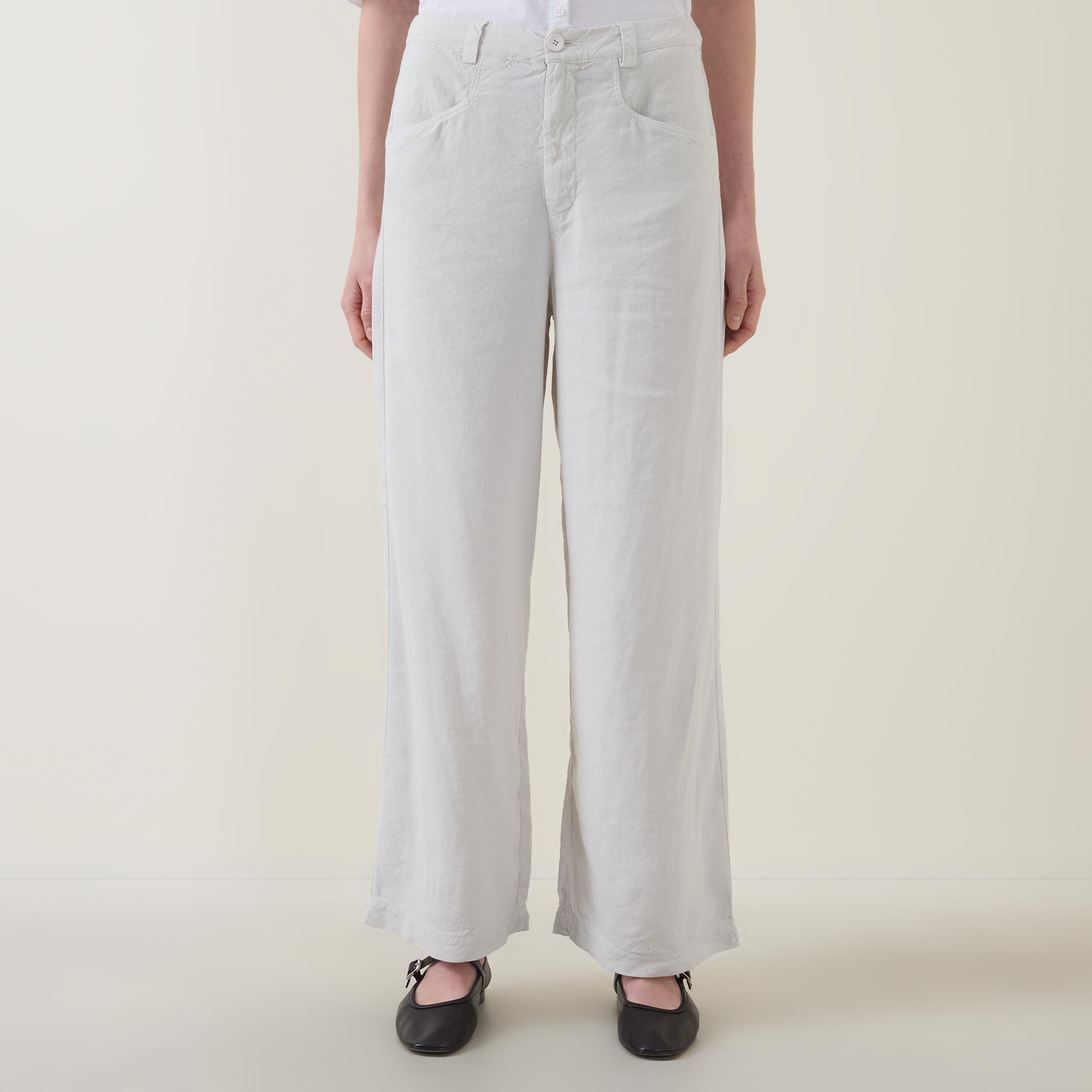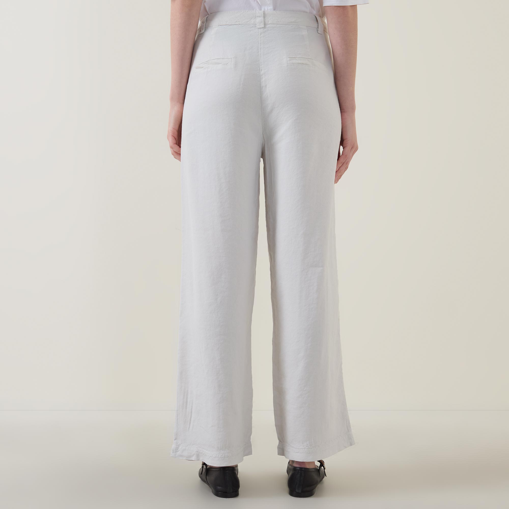 - Mid rise, wide leg, belt loops, concealed fly and button fastening, two front pockets, two rear welt pockets, clean hems, tonal stitching