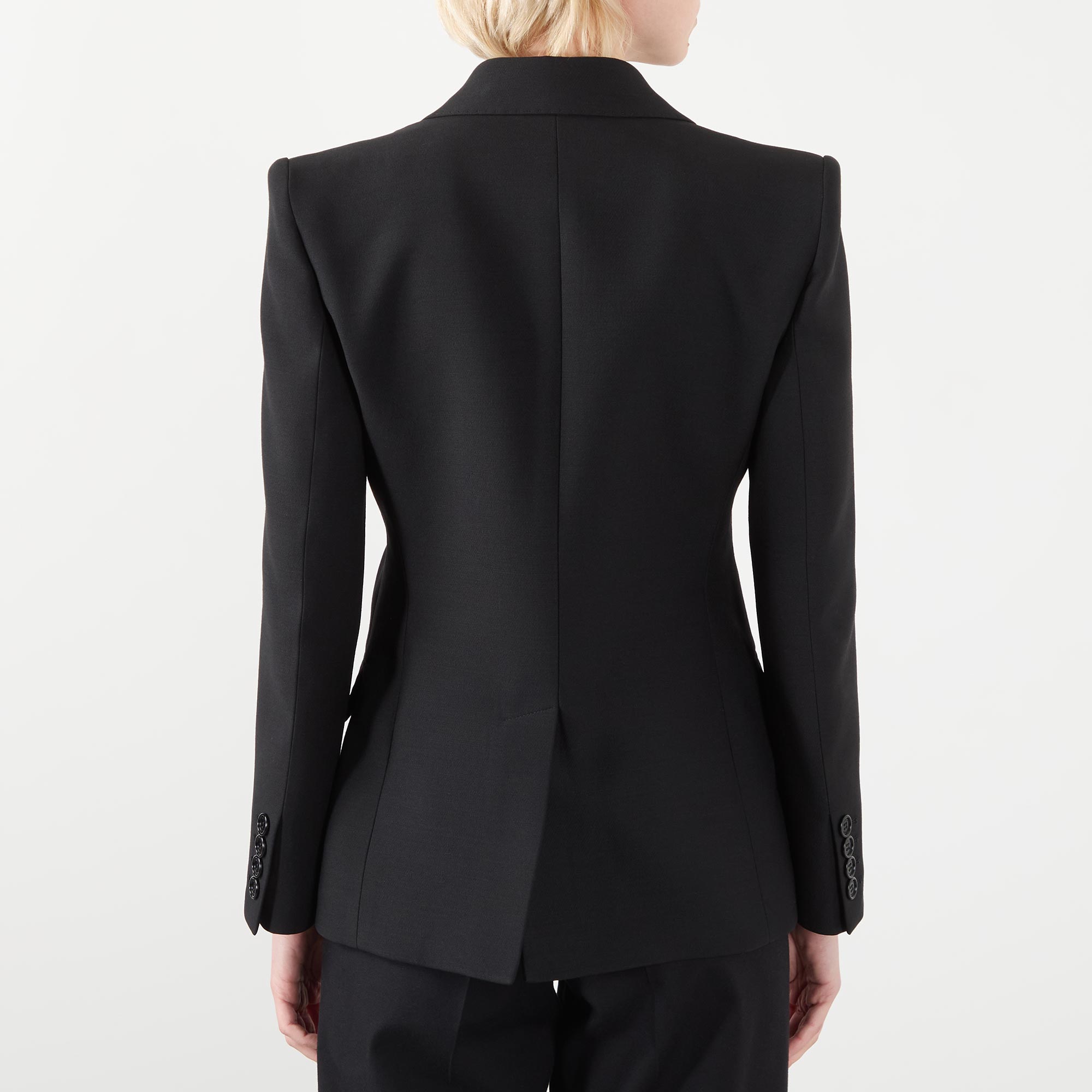 - Single breasted design, peak lapel collar, structured shoulders, long sleeves, buttoned cuffs, front button placket, two hip flap pockets, curved front hem, rear split vent, contrasting bow appliqué, tailored silhouette, lined