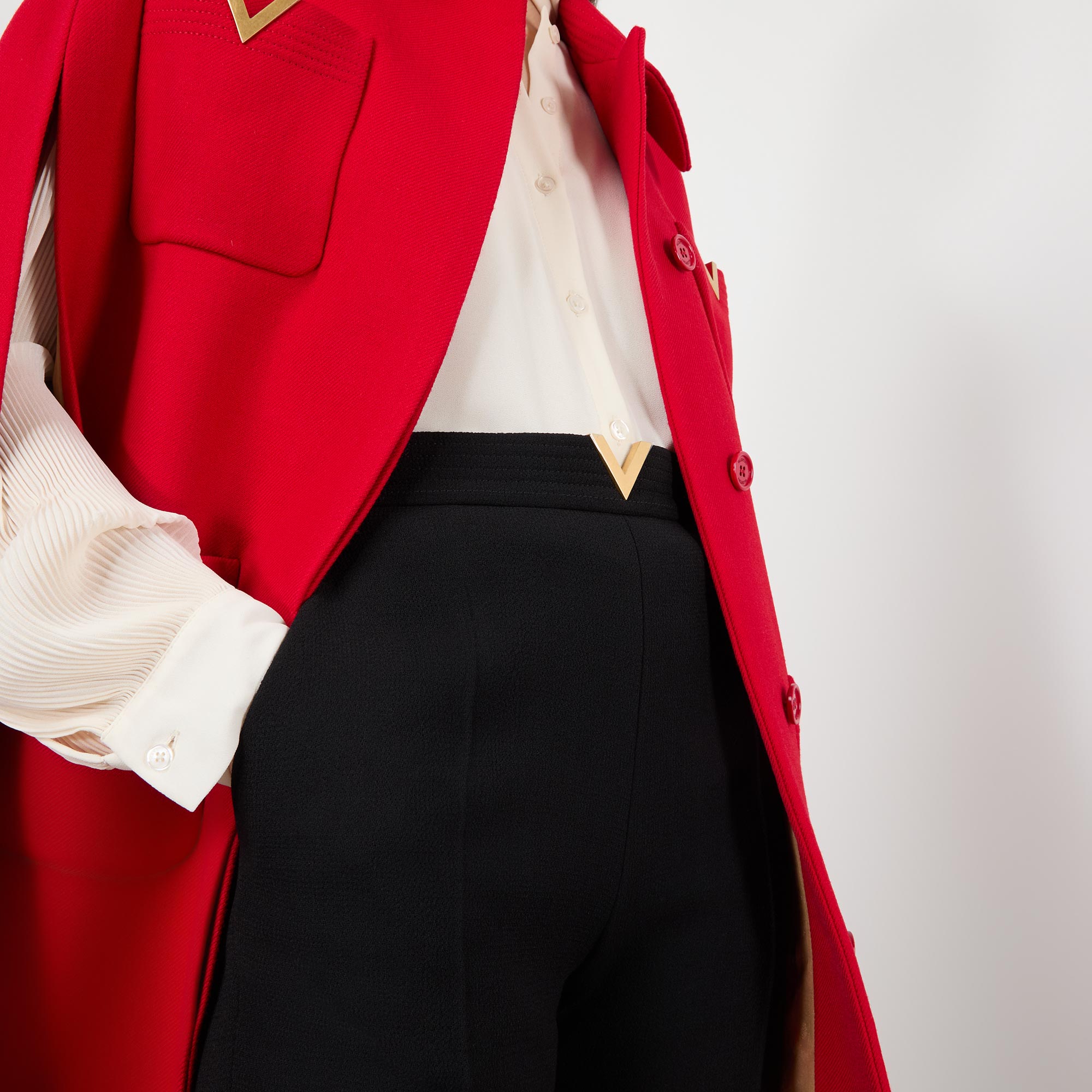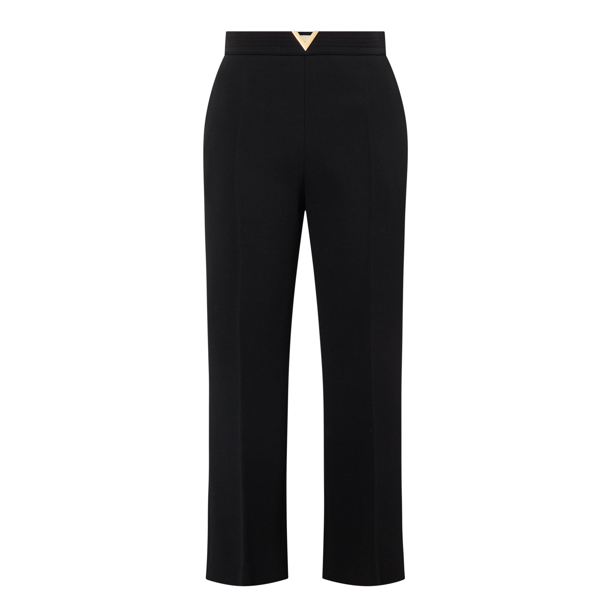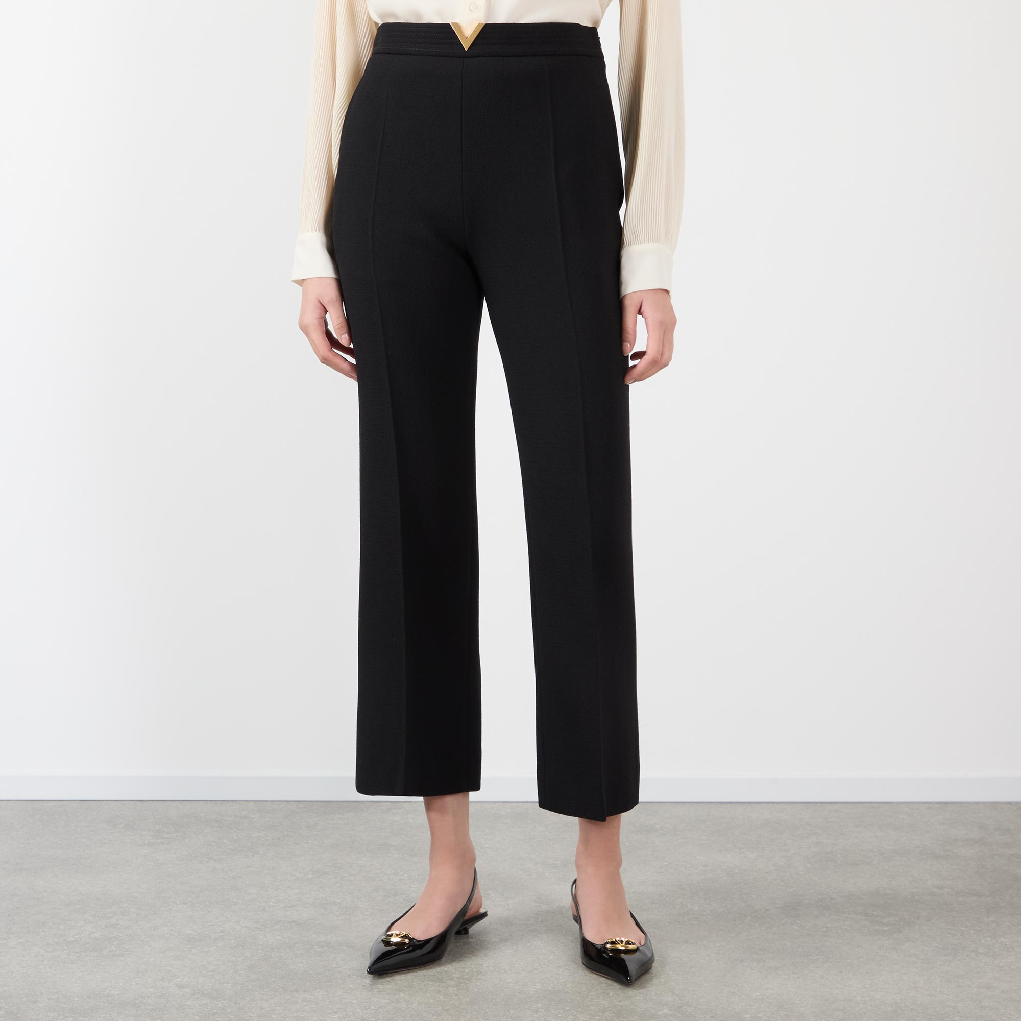 - Concealed zip-fastening closure, wide waistband with gold-tone V logo hardware, two slit pockets, two rear welt pockets, pressed creases, high-rise, straight-cut leg, smooth fabric