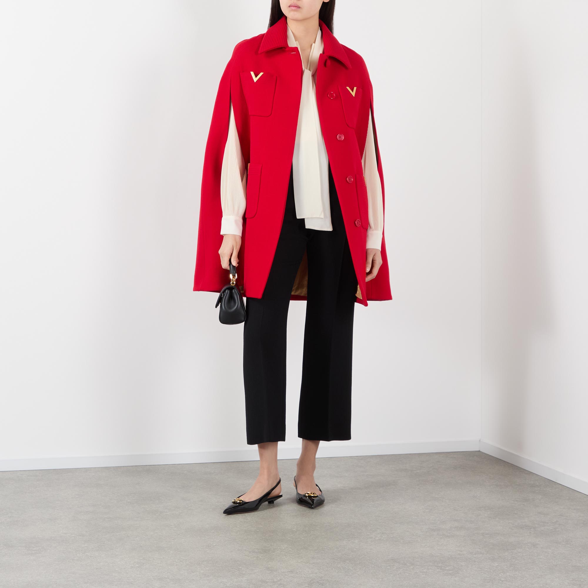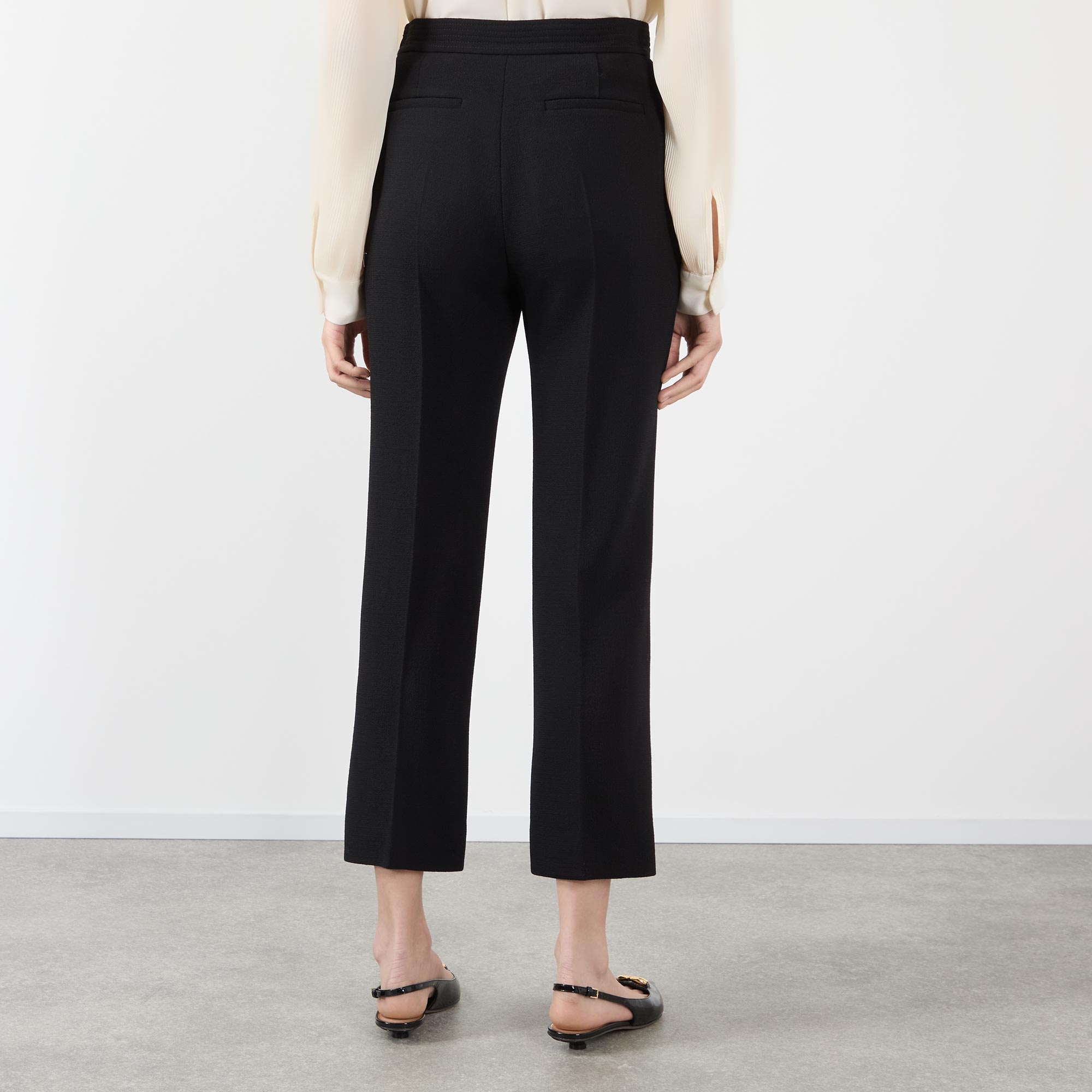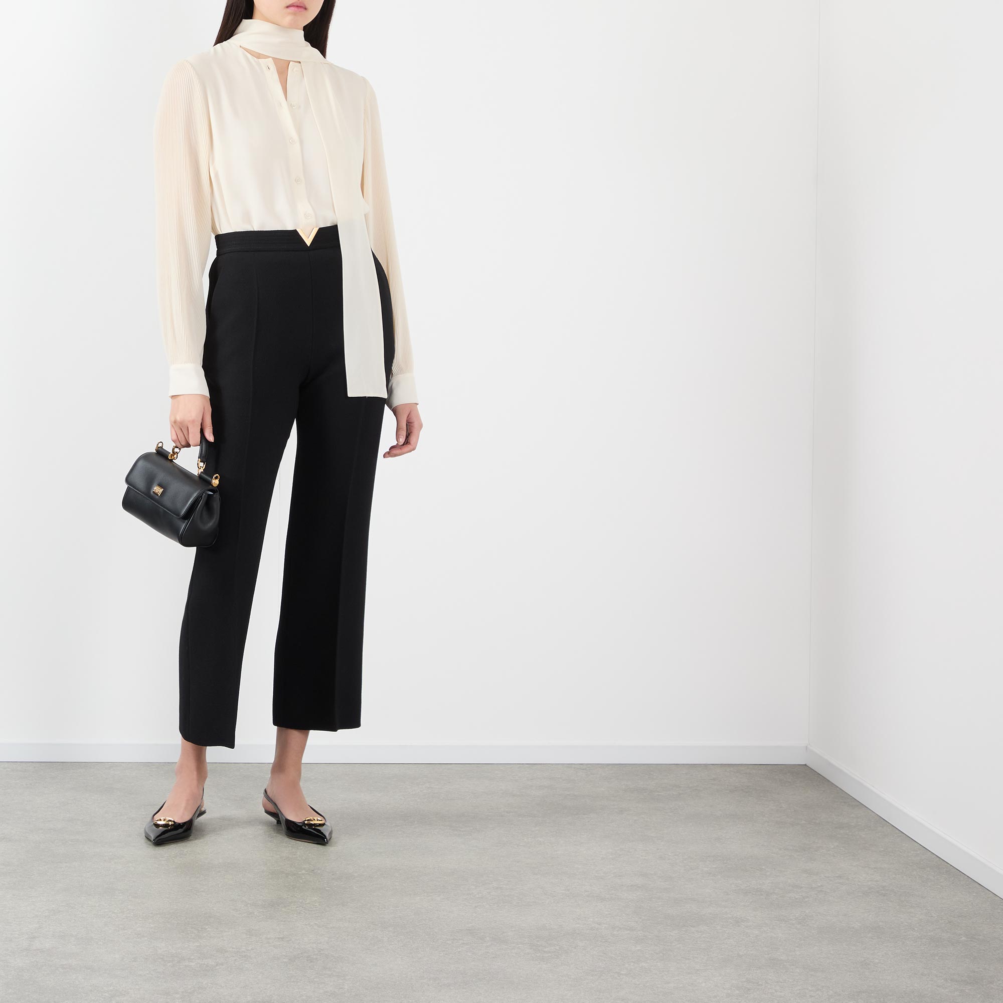 - Concealed zip-fastening closure, wide waistband with gold-tone V logo hardware, two slit pockets, two rear welt pockets, pressed creases, high-rise, straight-cut leg, smooth fabric