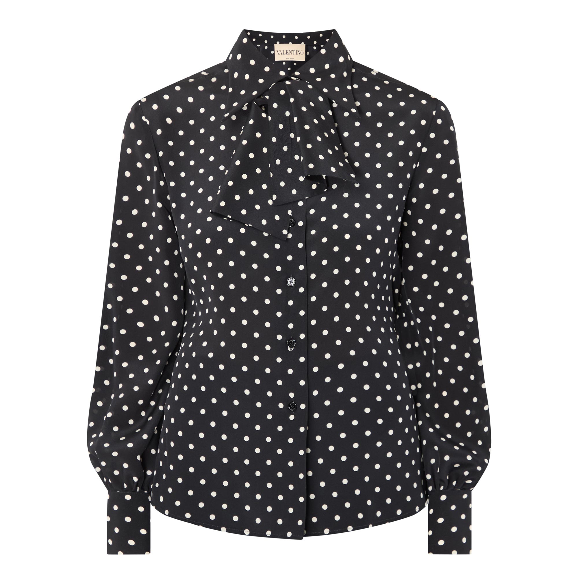 Valentino's SS26 collection is a study in modern romanticism, where fluid elegance and precise tailoring coexist with effortless ease, take this blouse. Spun from pure silk and cut to a tailored silhouette, it's framed by a point collar and matching bow tie fastening, while fastening at the front with a button placket and adorned in an all over polka dot pattern for a feminine finish.