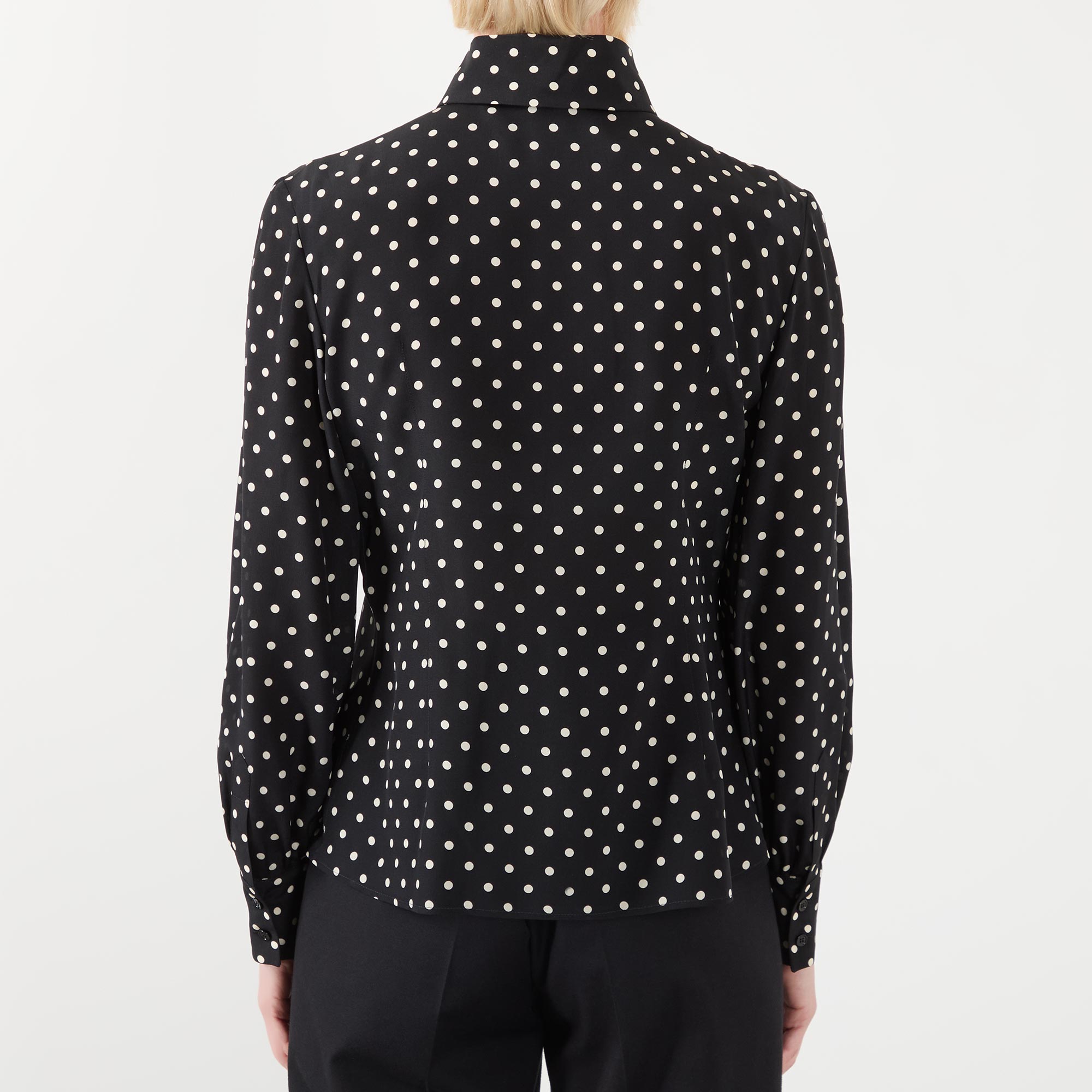 • Point collar, matching bow tie fastening, long sleeves, buttoned cuffs, front button placket, curved hem, tonal stitching, polka dot pattern, smooth finish