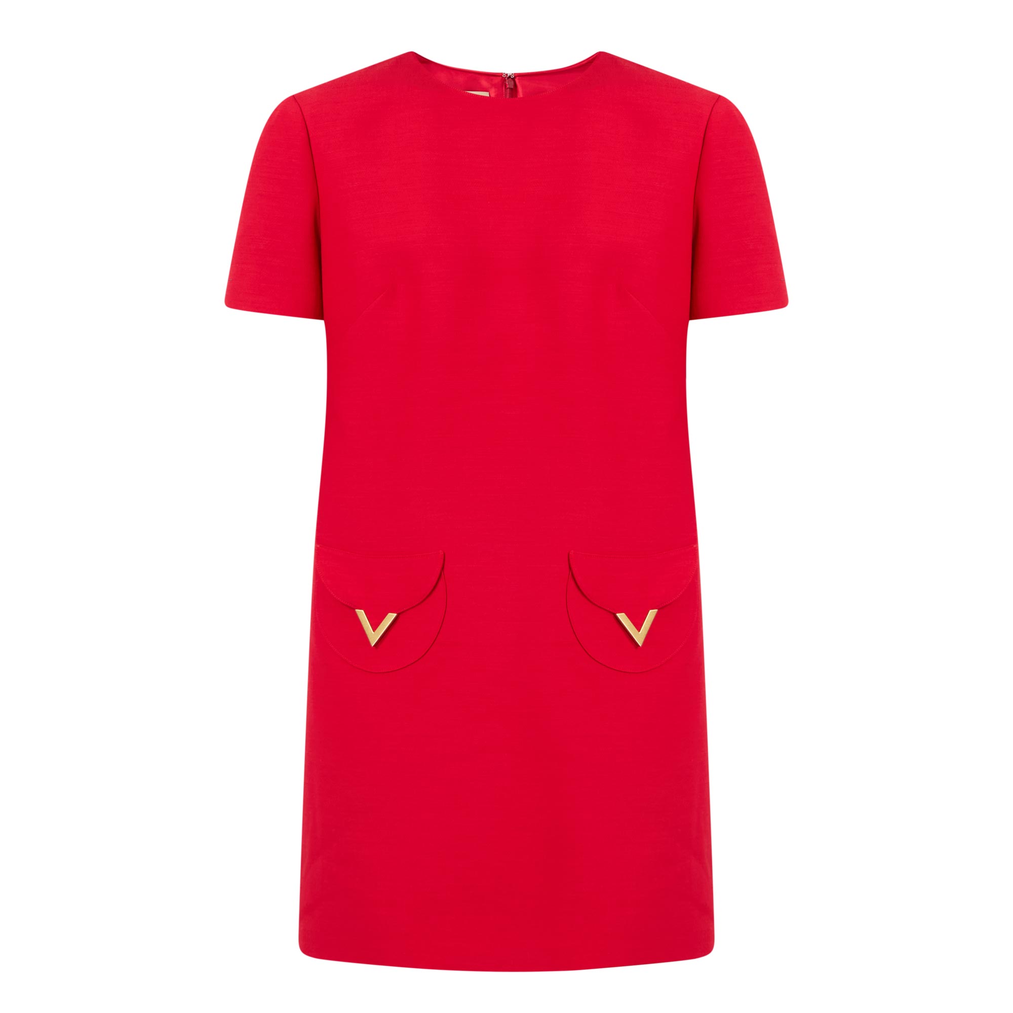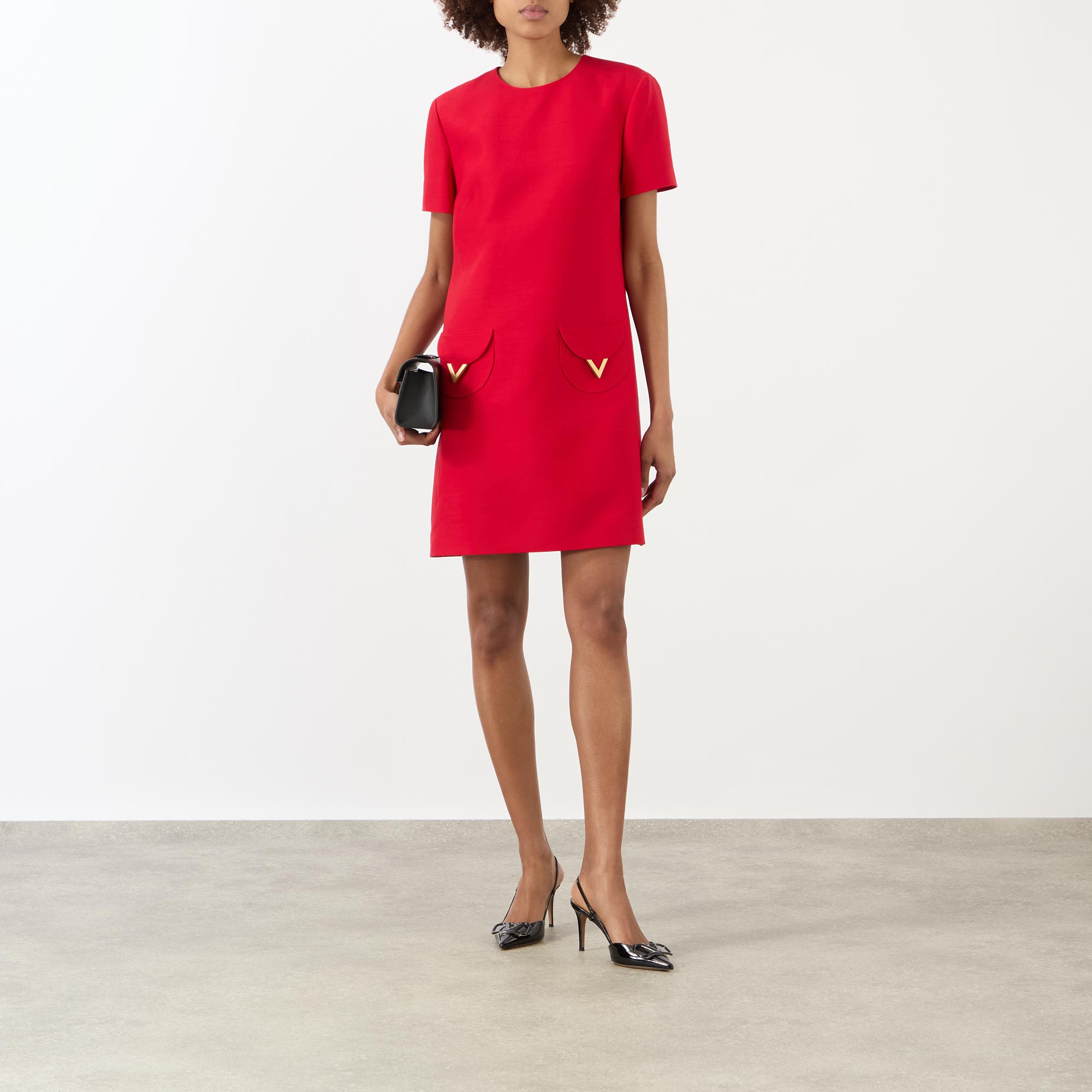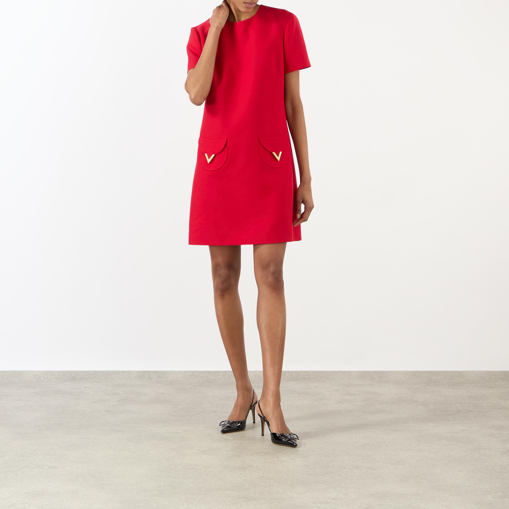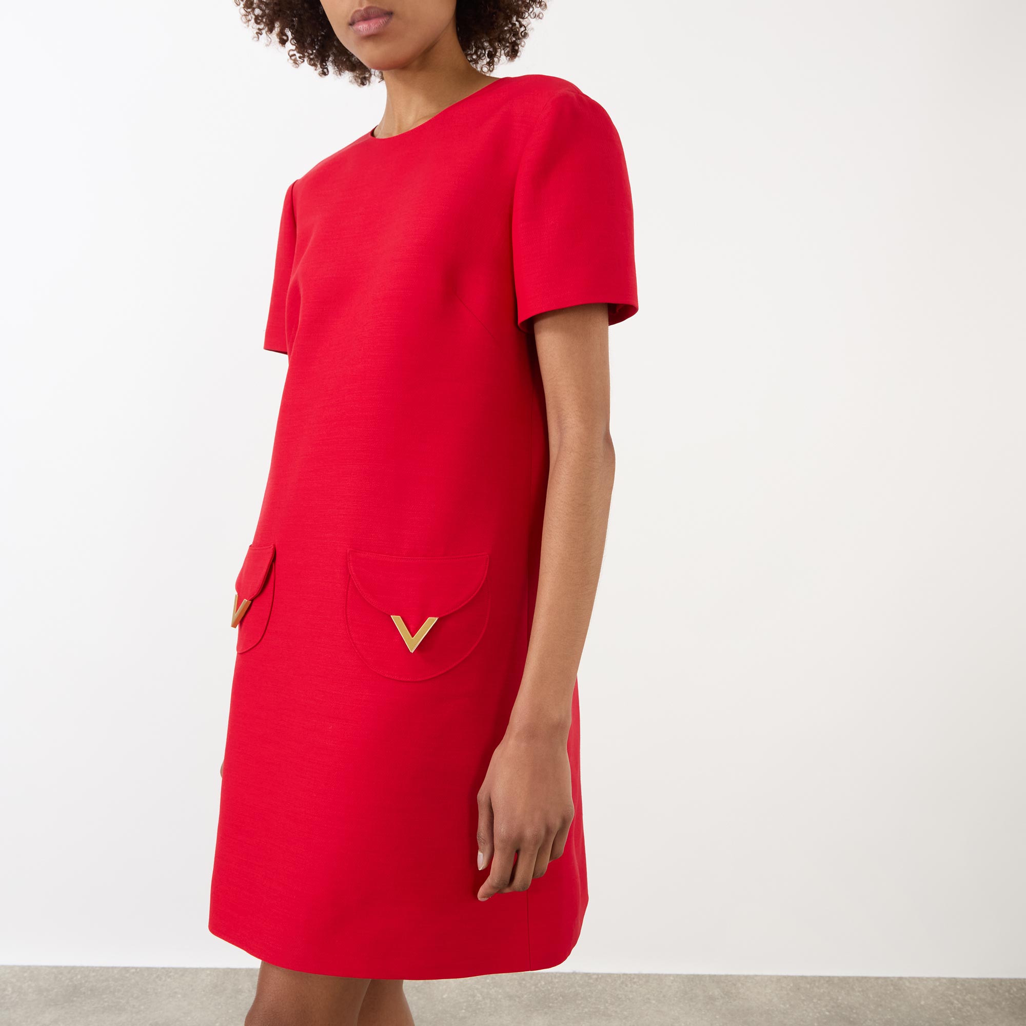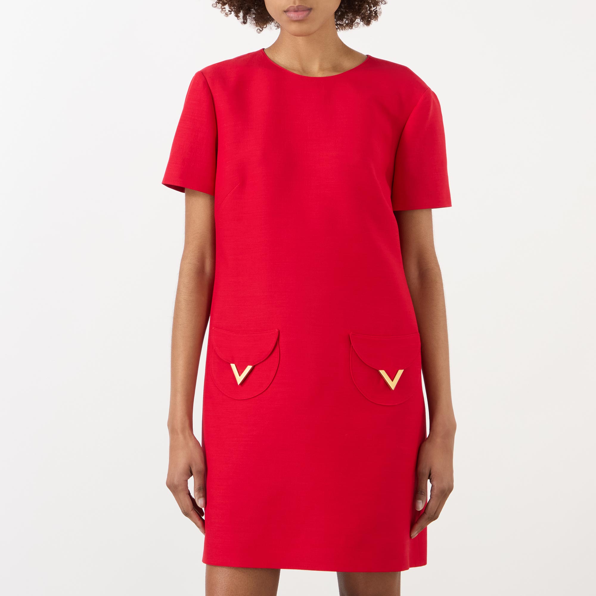 Gleaming gold-tone logo hardware can be seen adorning many styles across the SS26 collection from Valentino, seen in the design of this dress. Cut to a mini length, it features a round neckline, short sleeves and pockets, finished with V-logo embellishments.