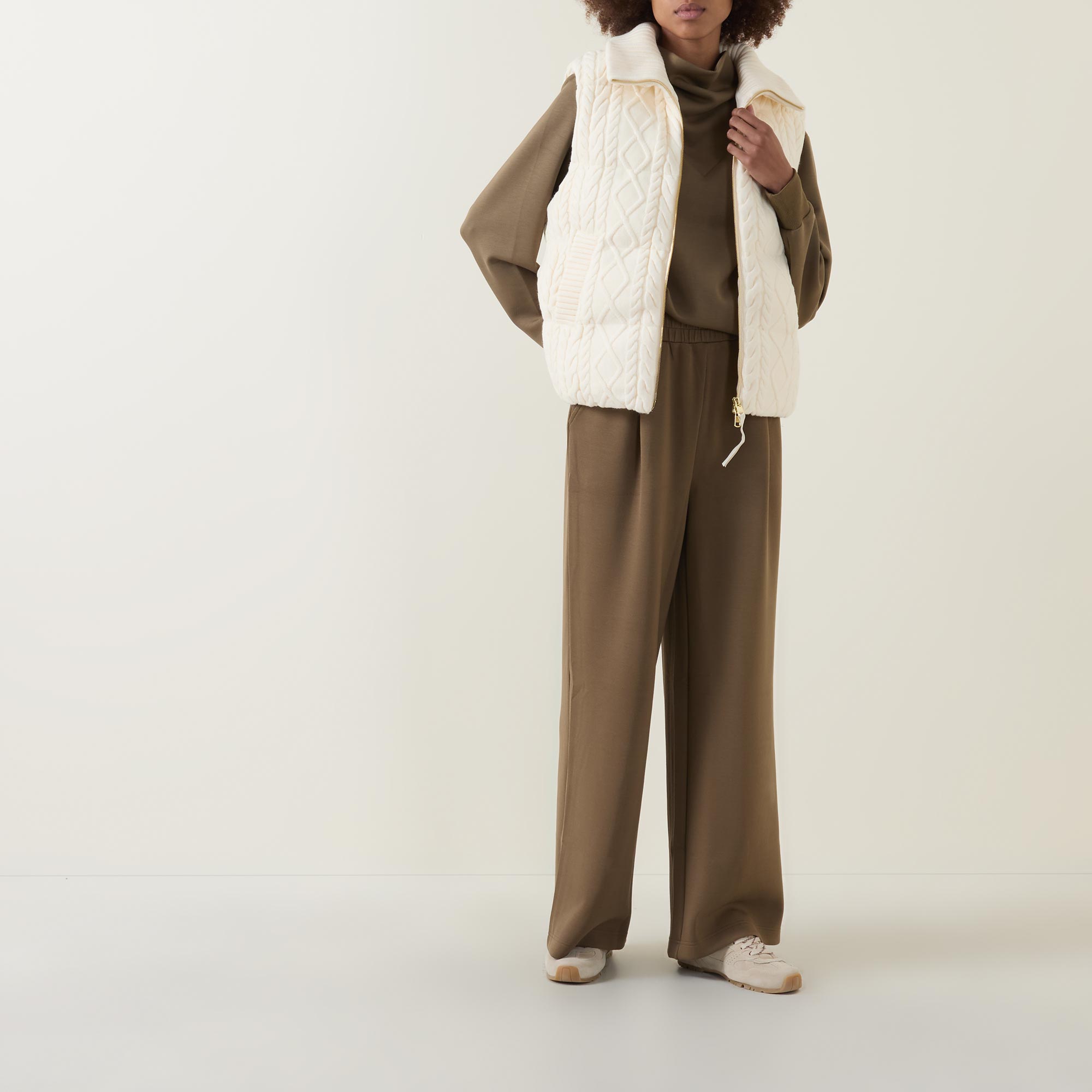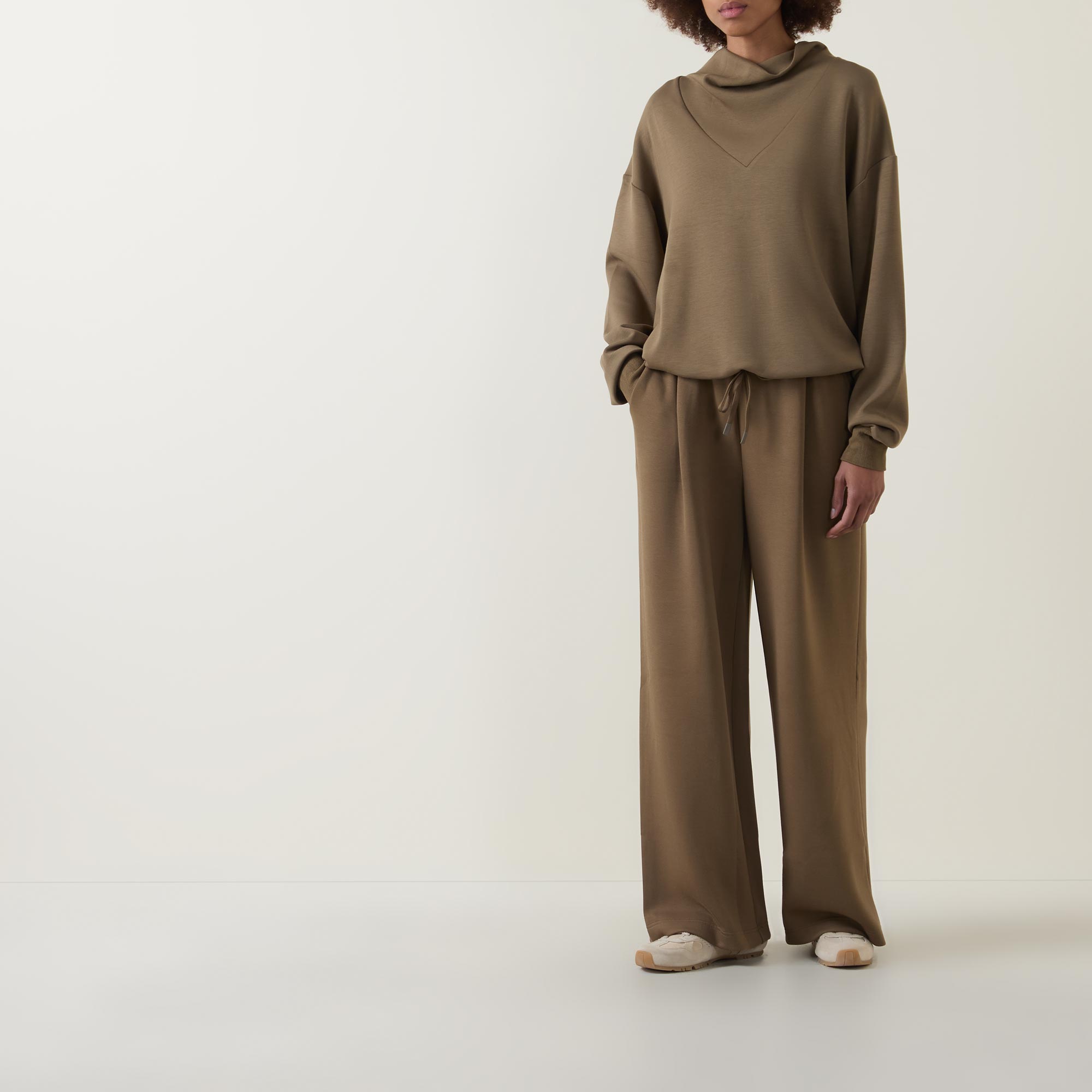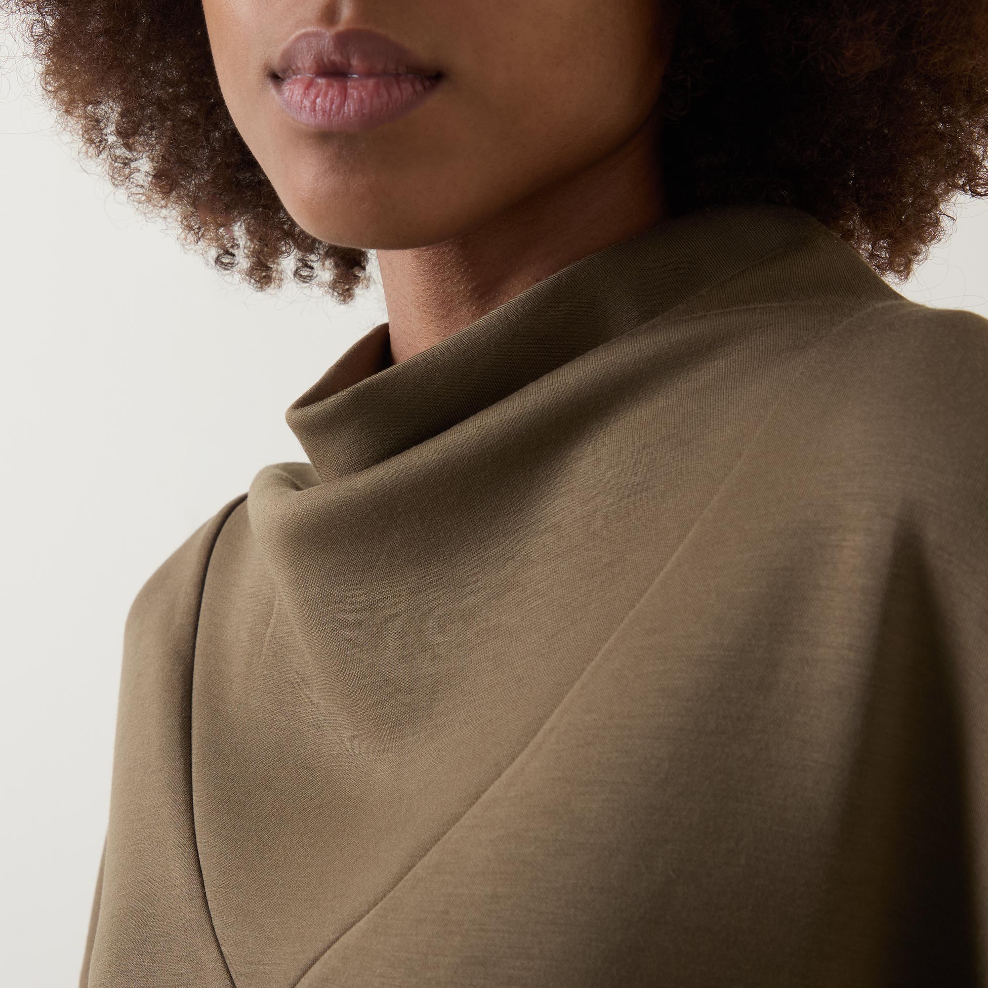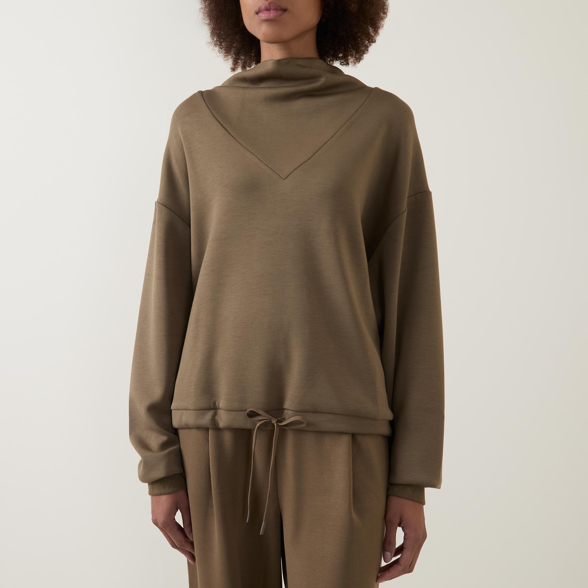 - Cowl neck, V-shaped panel detailing, dropped shoulders, long sleeves, ribbed cuffs, straight hem, smooth finish