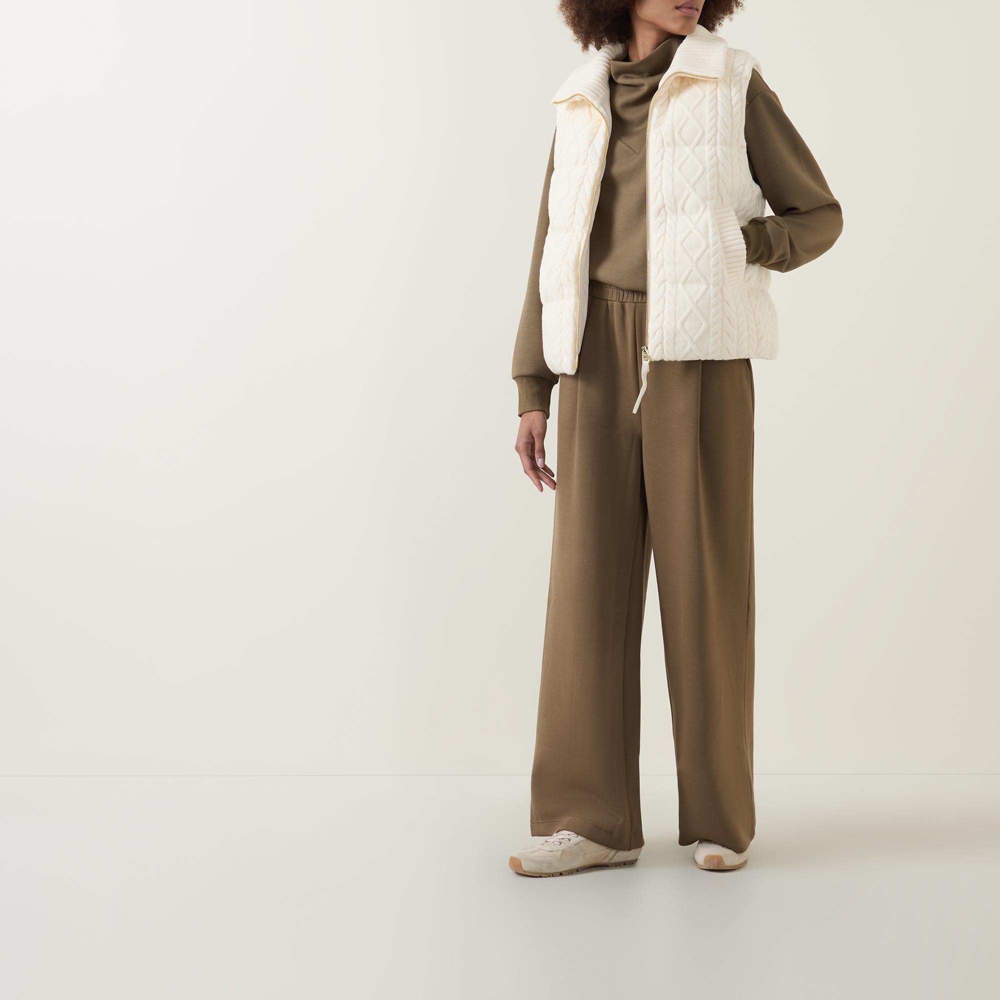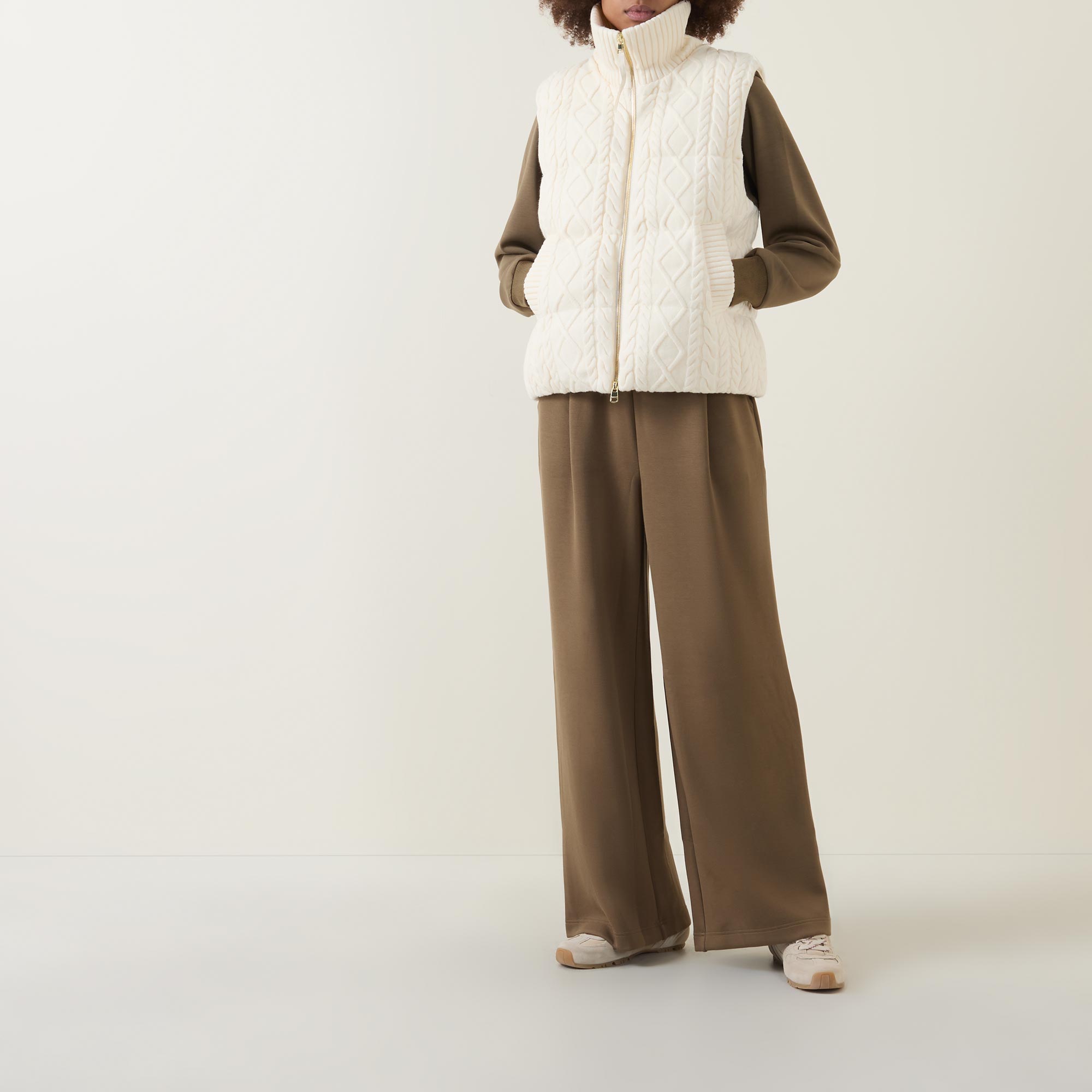 - Fold down collar, sleeveless design, two-way front zip fastening, two angled welt pockets with ribbed trims, straight hem, cable knit design, soft finish