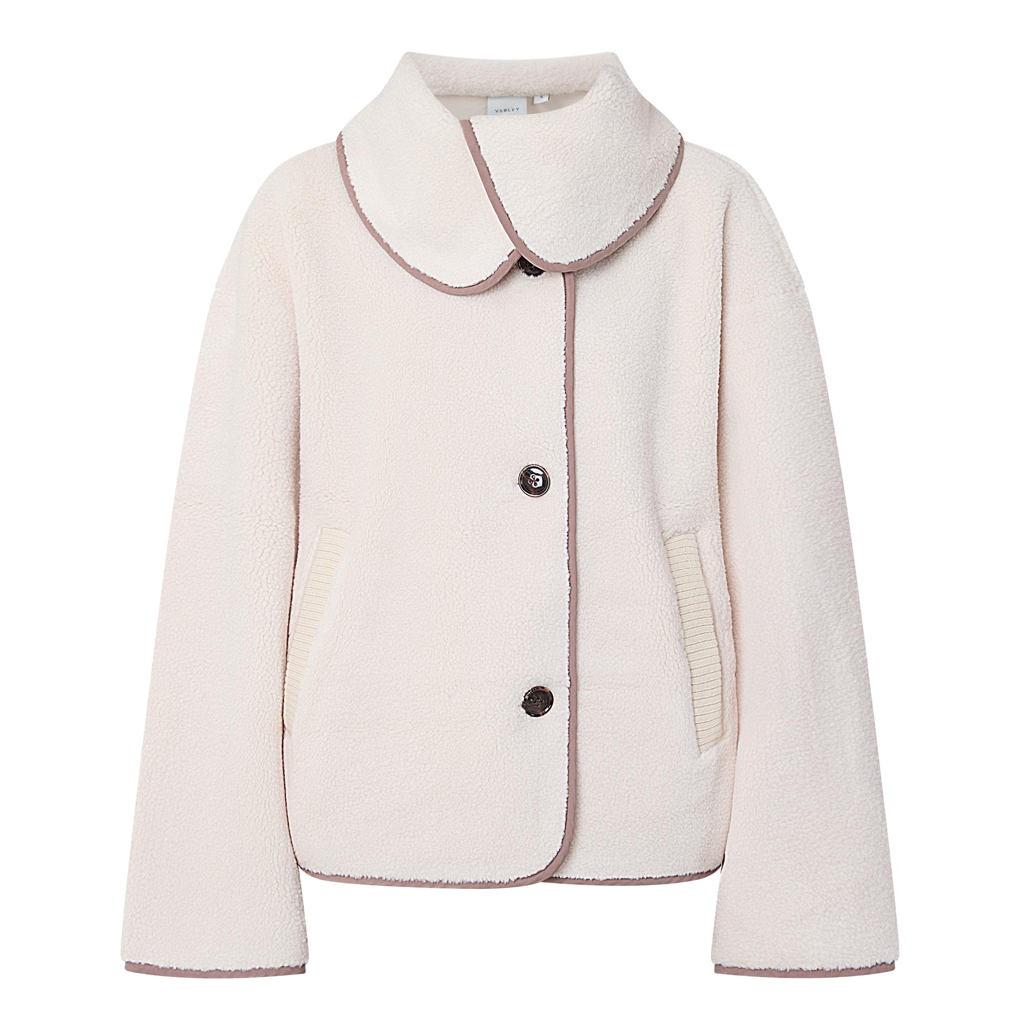 - Fold down collar, rounded shoulders, long sleeves, front button fastening, two angled welt pockets, straight hem, contrast trim detailing, textured finish