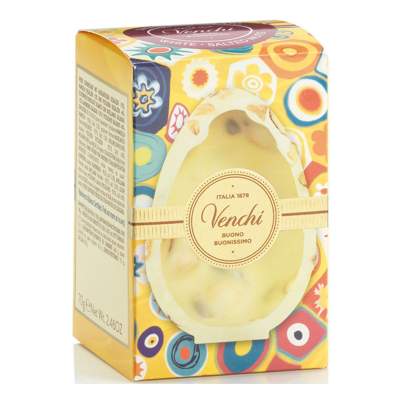 - Delicious white chocolate with roasted, lightly salted and chopped pistachios, almonds and Piedmont Hazelnuts in the form of a mini Easter egg