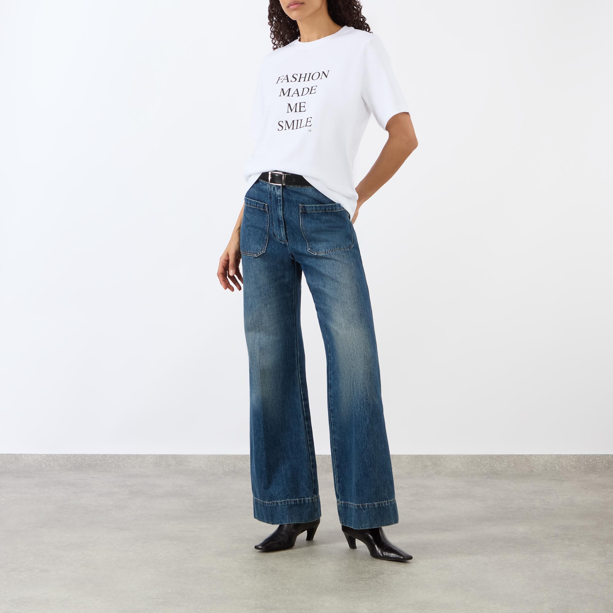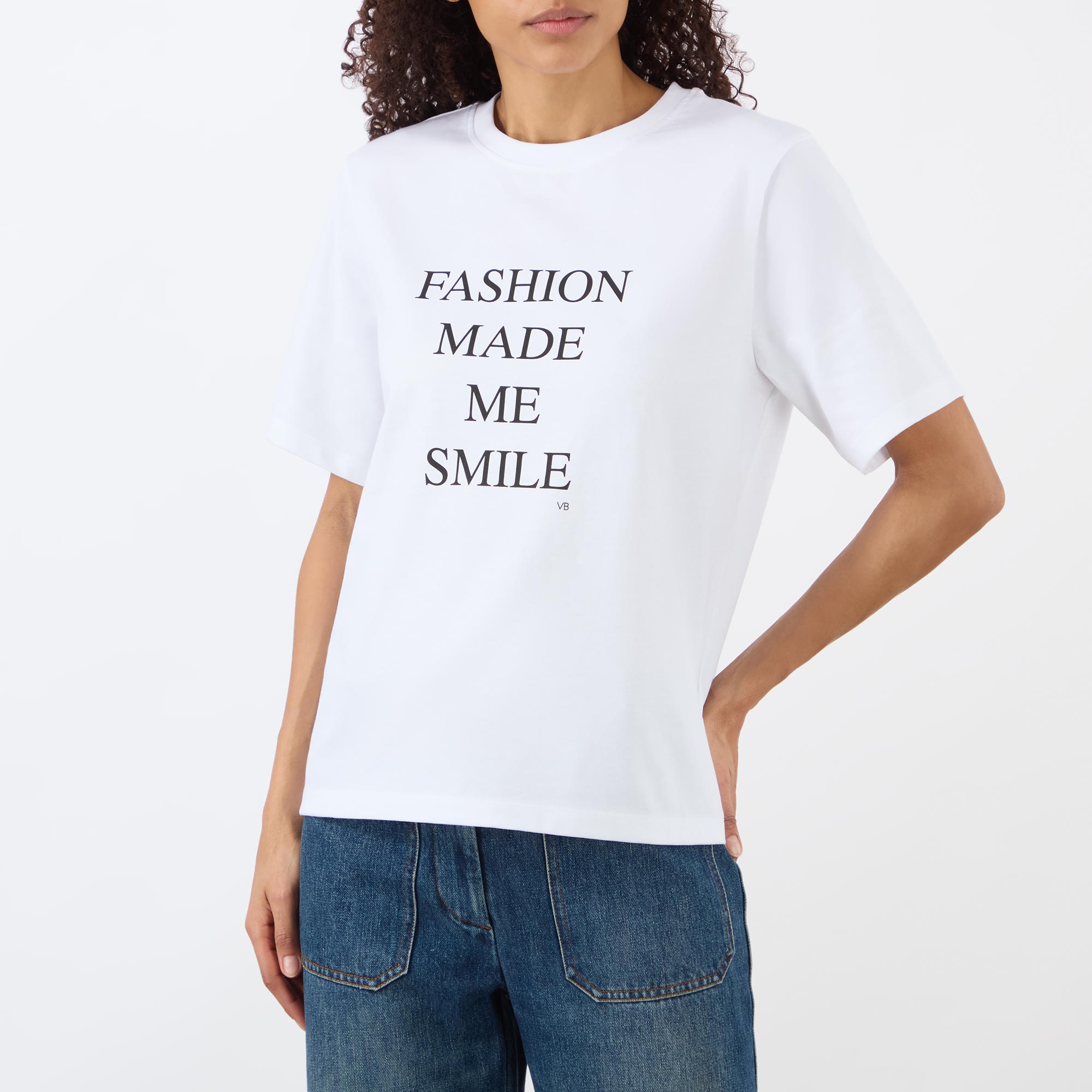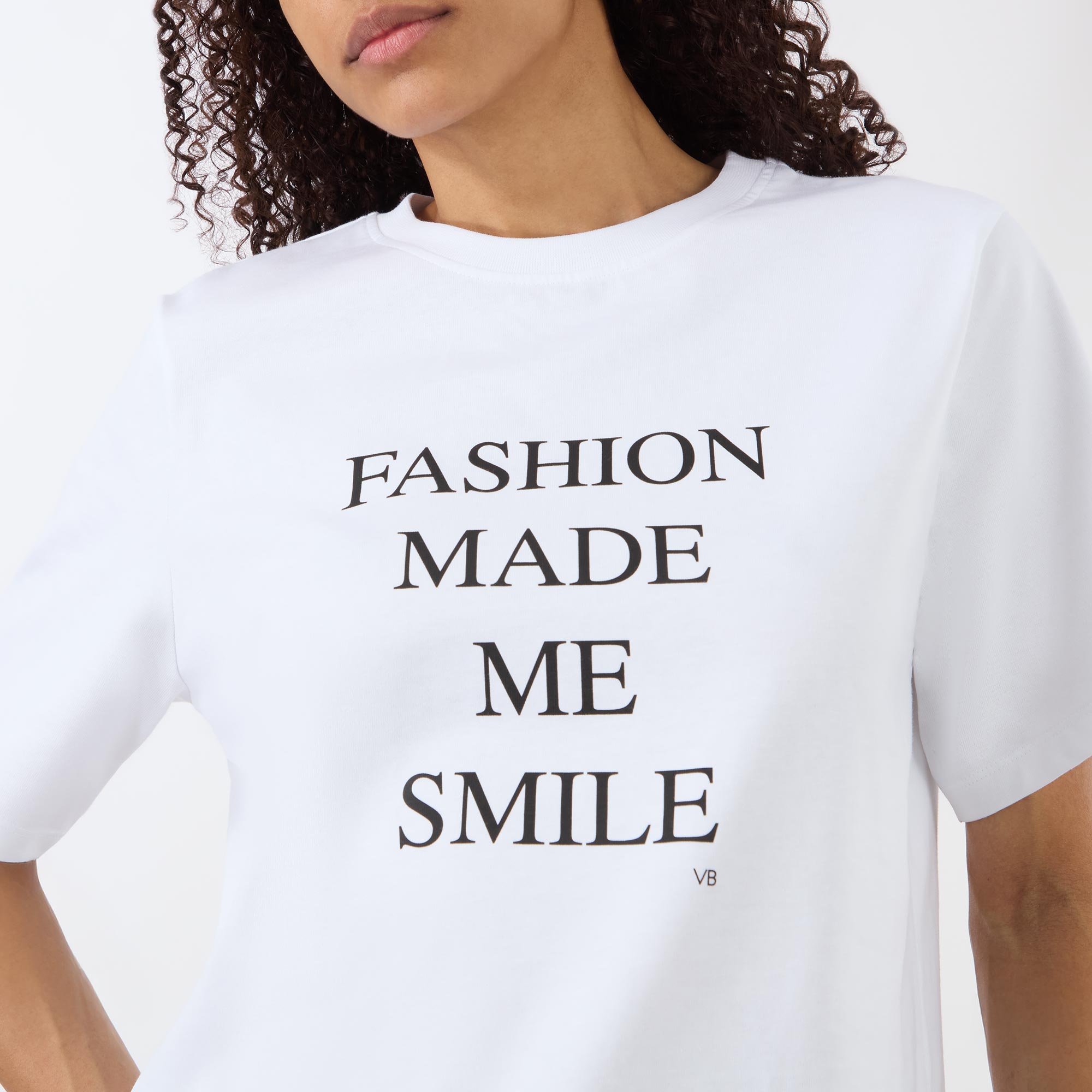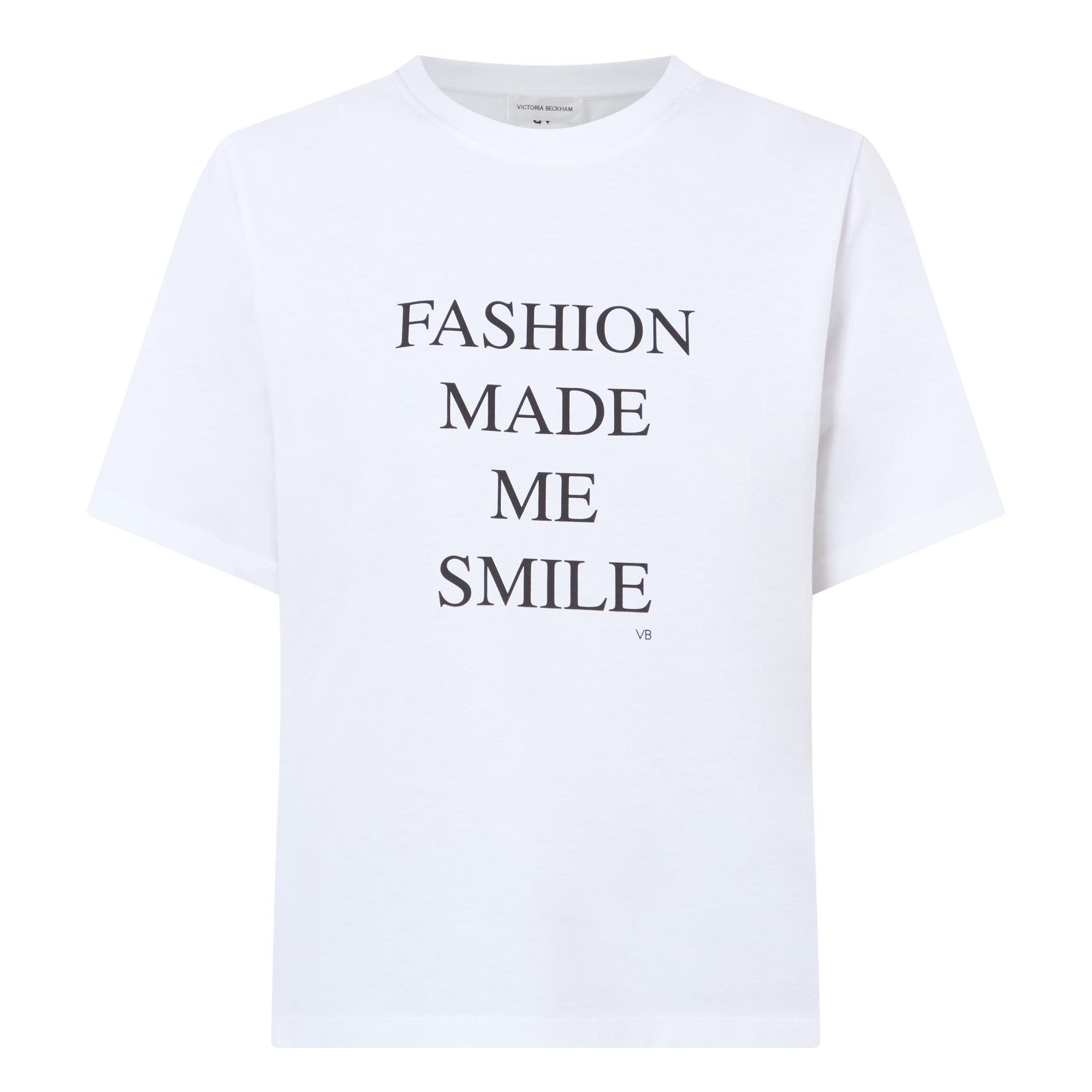 - Crew neck, dropped shoulders, short sleeves, straight hem, contrasting Fashion Made Me Smile slogan on the front, rear logo detail at the back of the neck, tonal stitching, smooth finish
