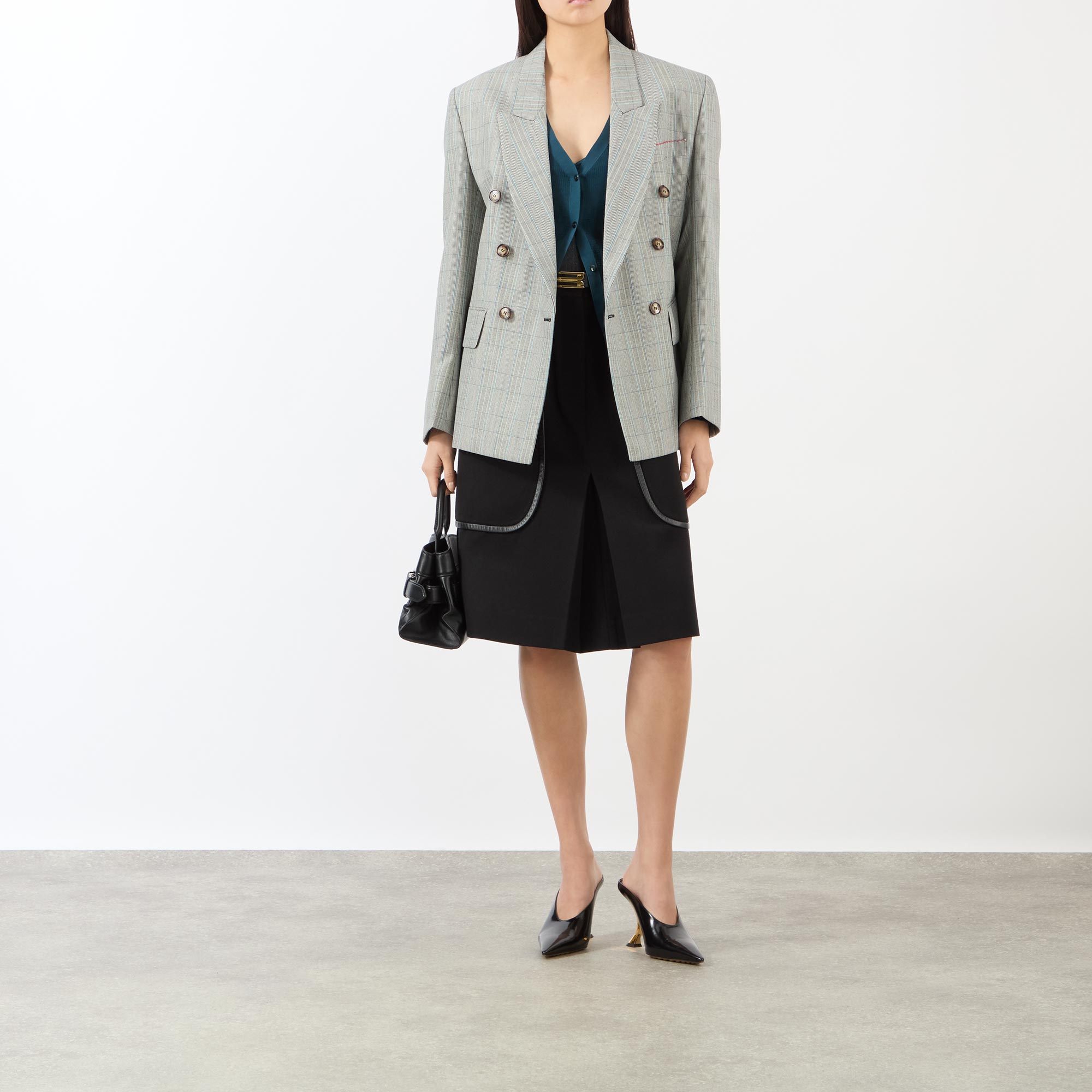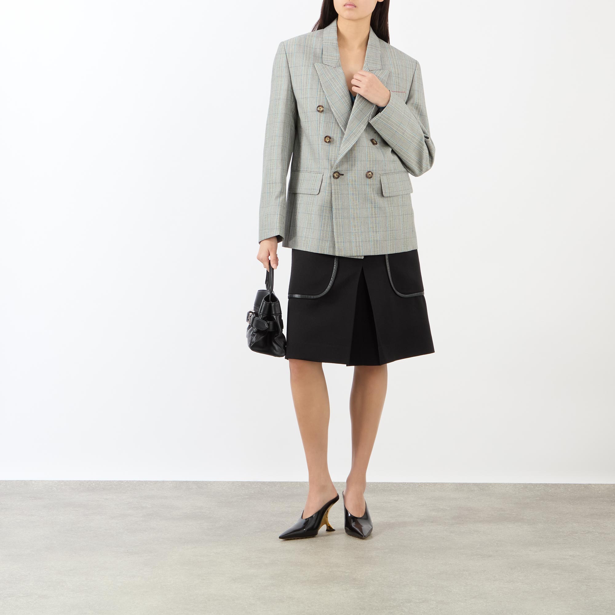 Victoria Beckham’s SS26 collection playfully explores the “happy accidents” of early style experimentation, and this blazer embodies that spirit with its relaxed, oversized silhouette. A double-breasted front is defined by sharp peak lapels and contrasting buttons, lending a sleek, refined edge. Designed with two practical flap pockets, it’s adorned in a bold check pattern and finished with side hem vents to ensure ease of movement.