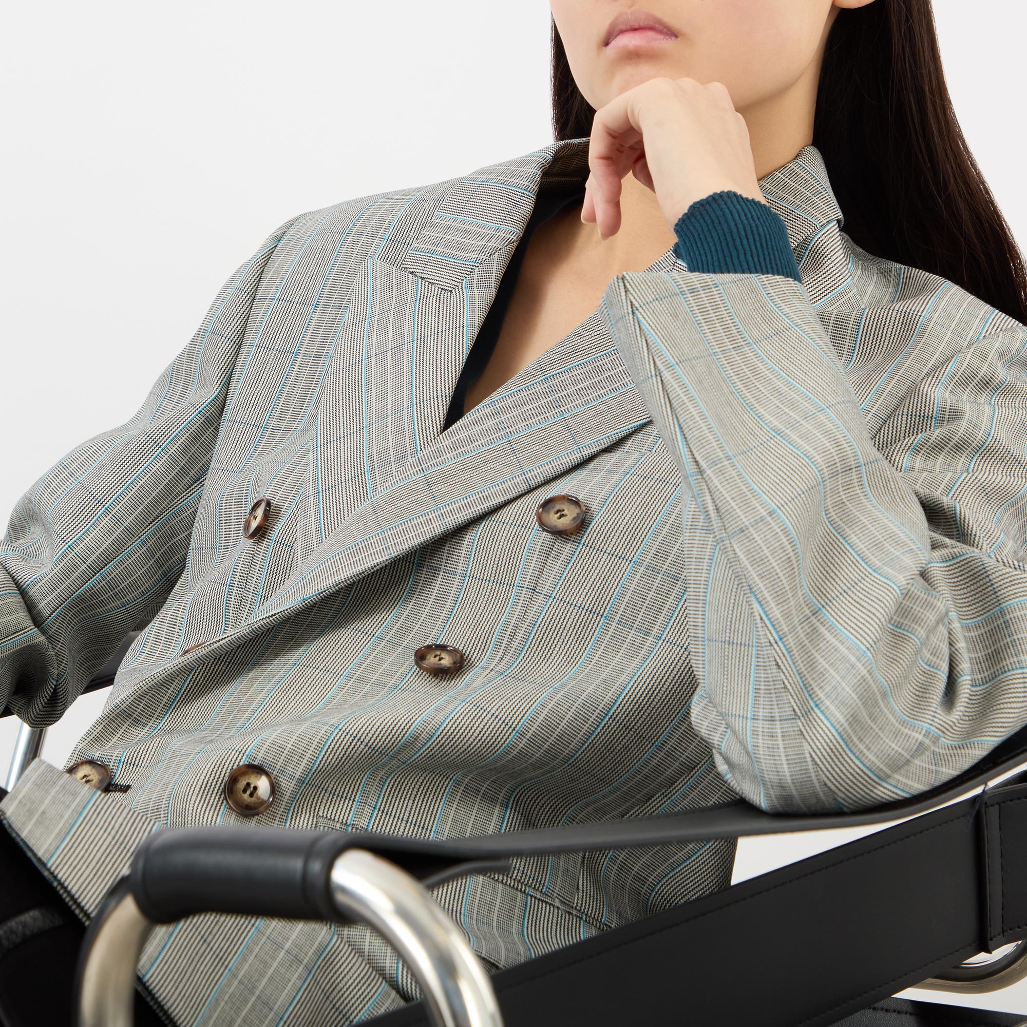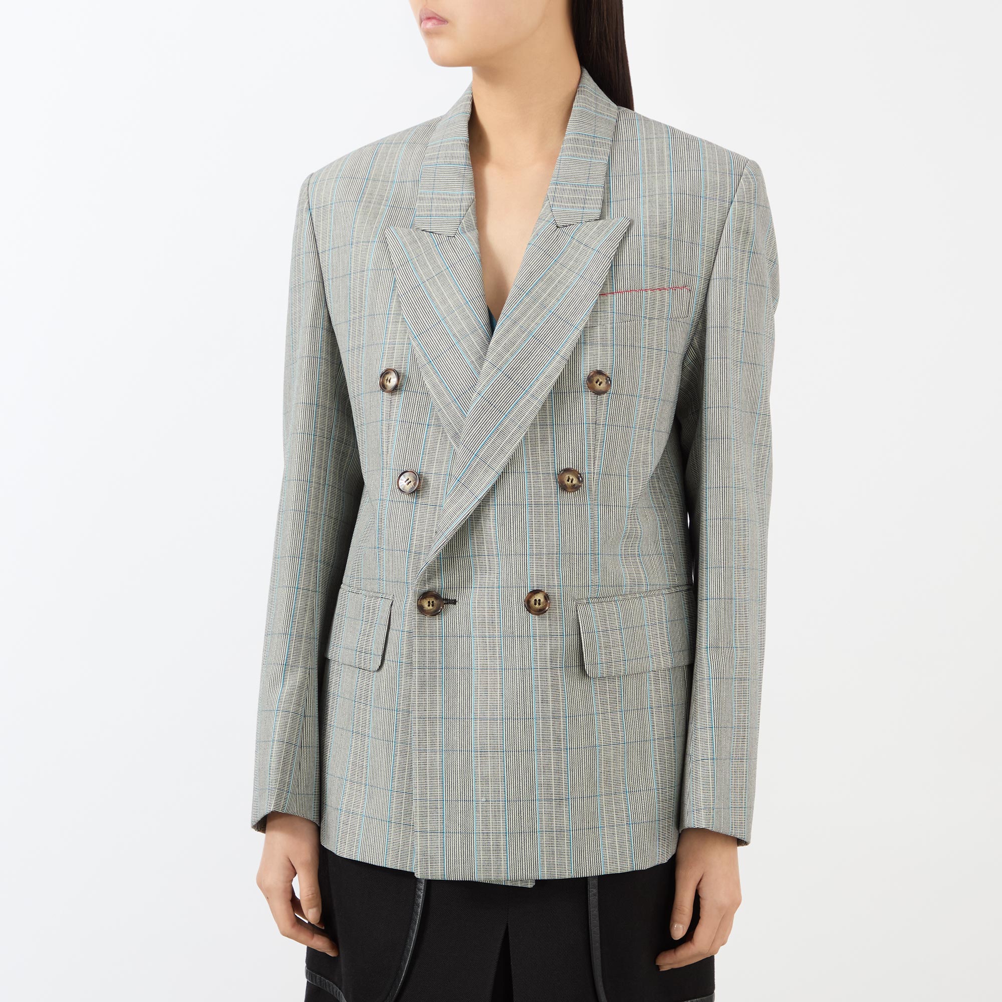 - Double-breasted front, long sleeves, peak-lapel collar, check pattern, button fastenings, chest welt pocket, two side flap pockets, side hem vents, open-slit cuffs, smooth fabric