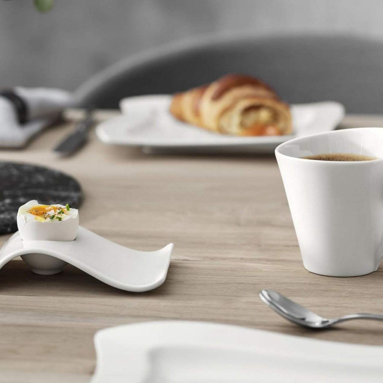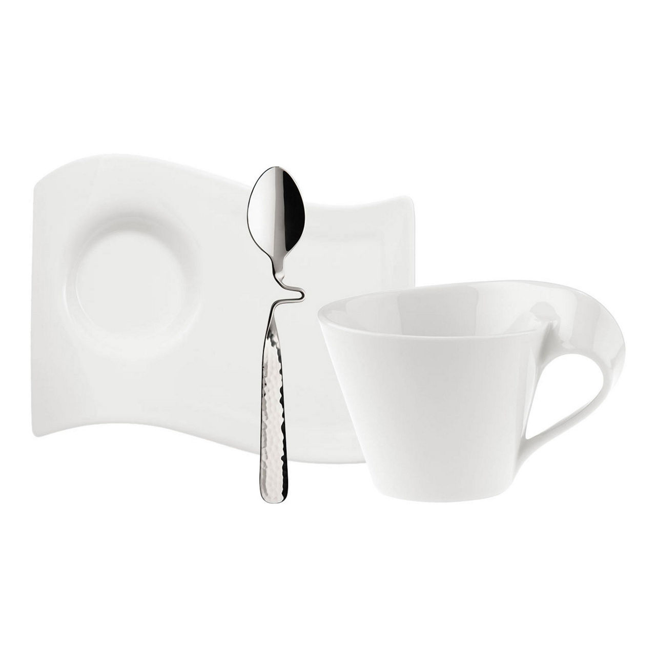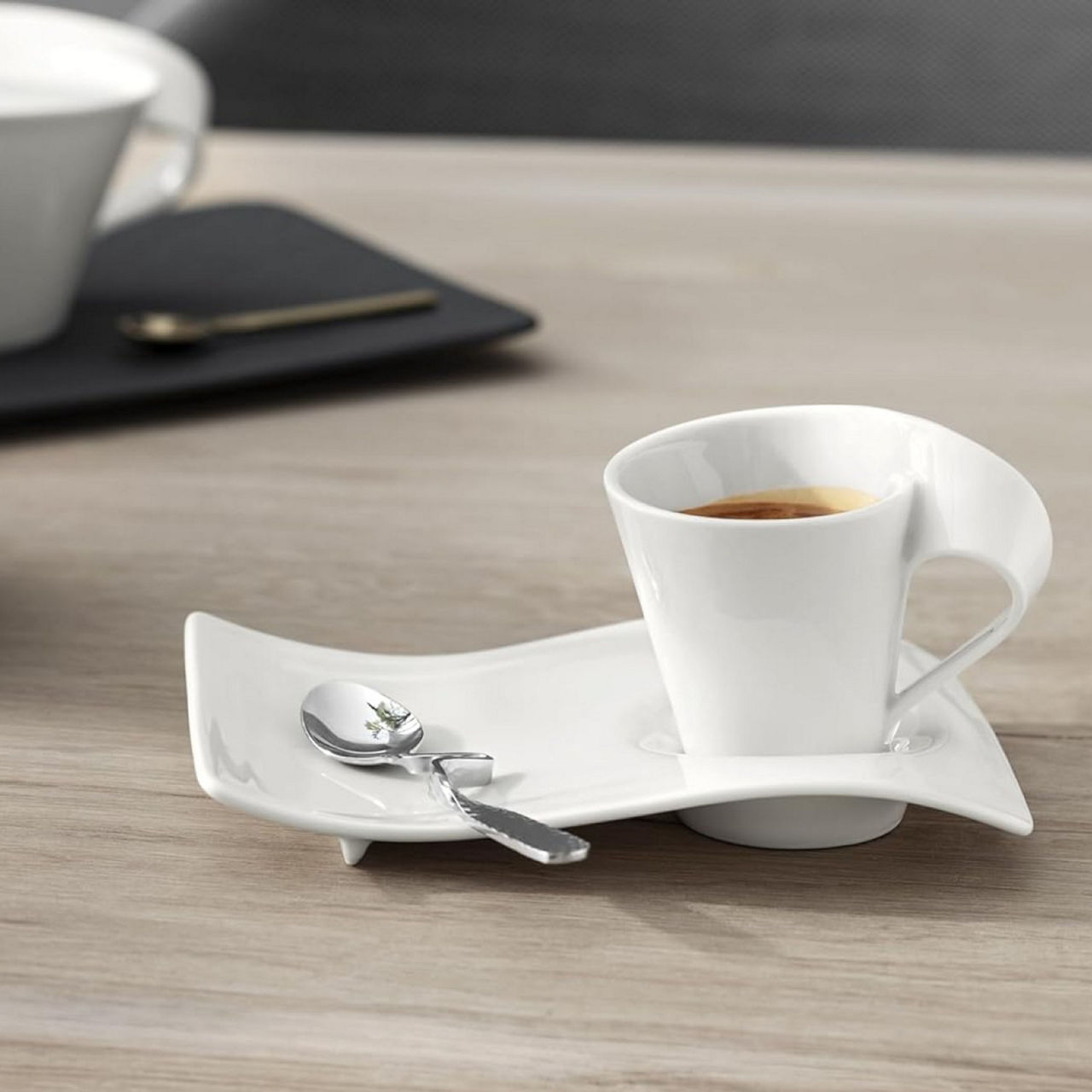 The NewWave Caffè décor from Villeroy & Boch is eye-catching on any coffee table! Tasty treats look twice as appetising, and the elegant wave design looks especially snazzy. This high-quality set made from fine premium porcelain with polished feet is perfect for space-saving and scratch-free stacking. It consists of a cappuccino cup, saucer, and a practically designed spoon. You can serve pastries with coffee on the accompanying saucer plate in style.