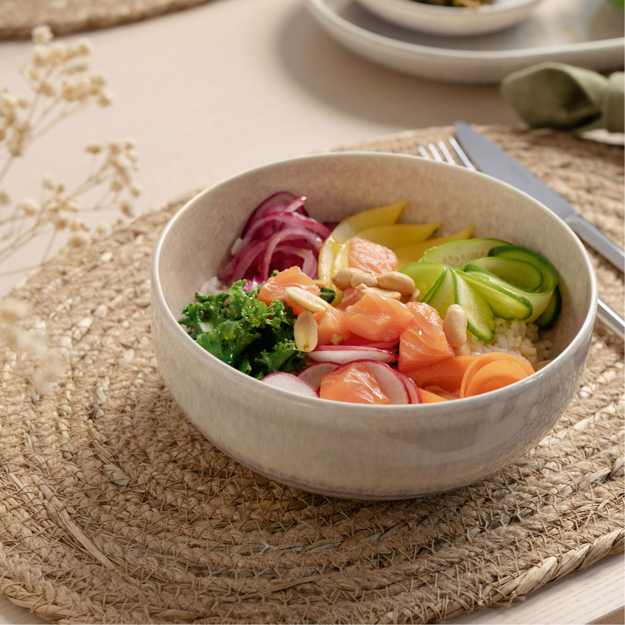 The like. by Villeroy & Boch Perlemor Sand poke bowl combines Scandinavian clarity with a practical design for everyday life. The deep shape is ideal for bowl meals, salads or pasta. Perfect for combining, collecting and for modern table concepts with a natural look.