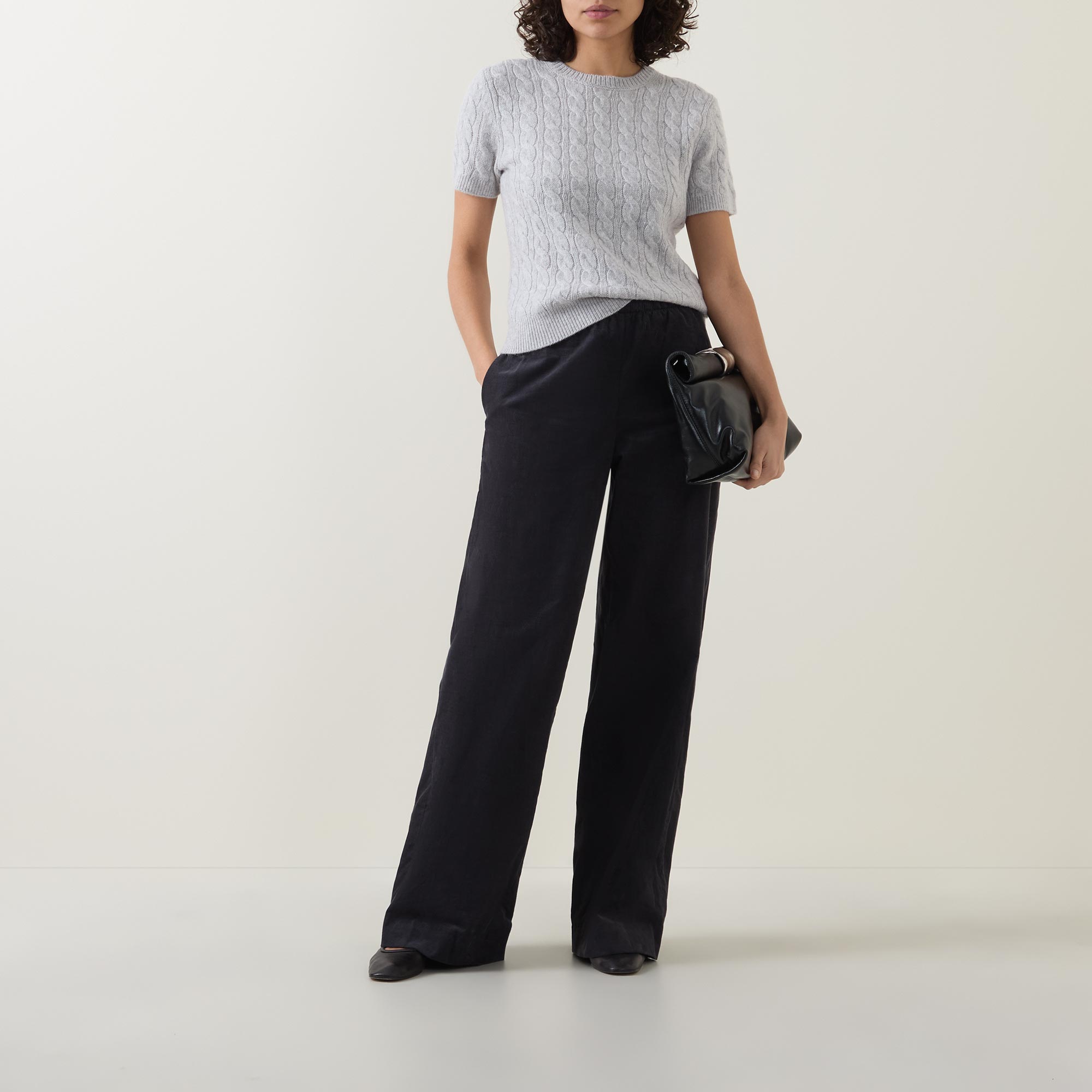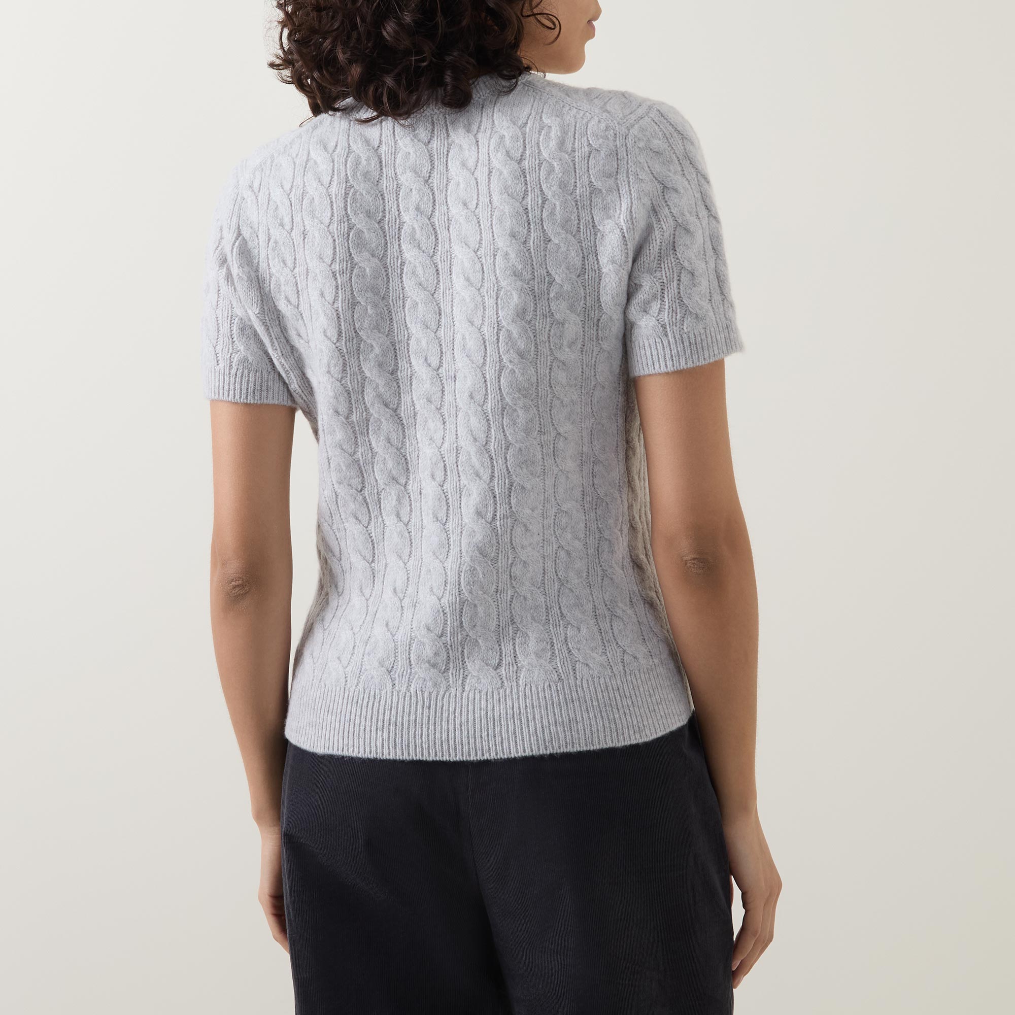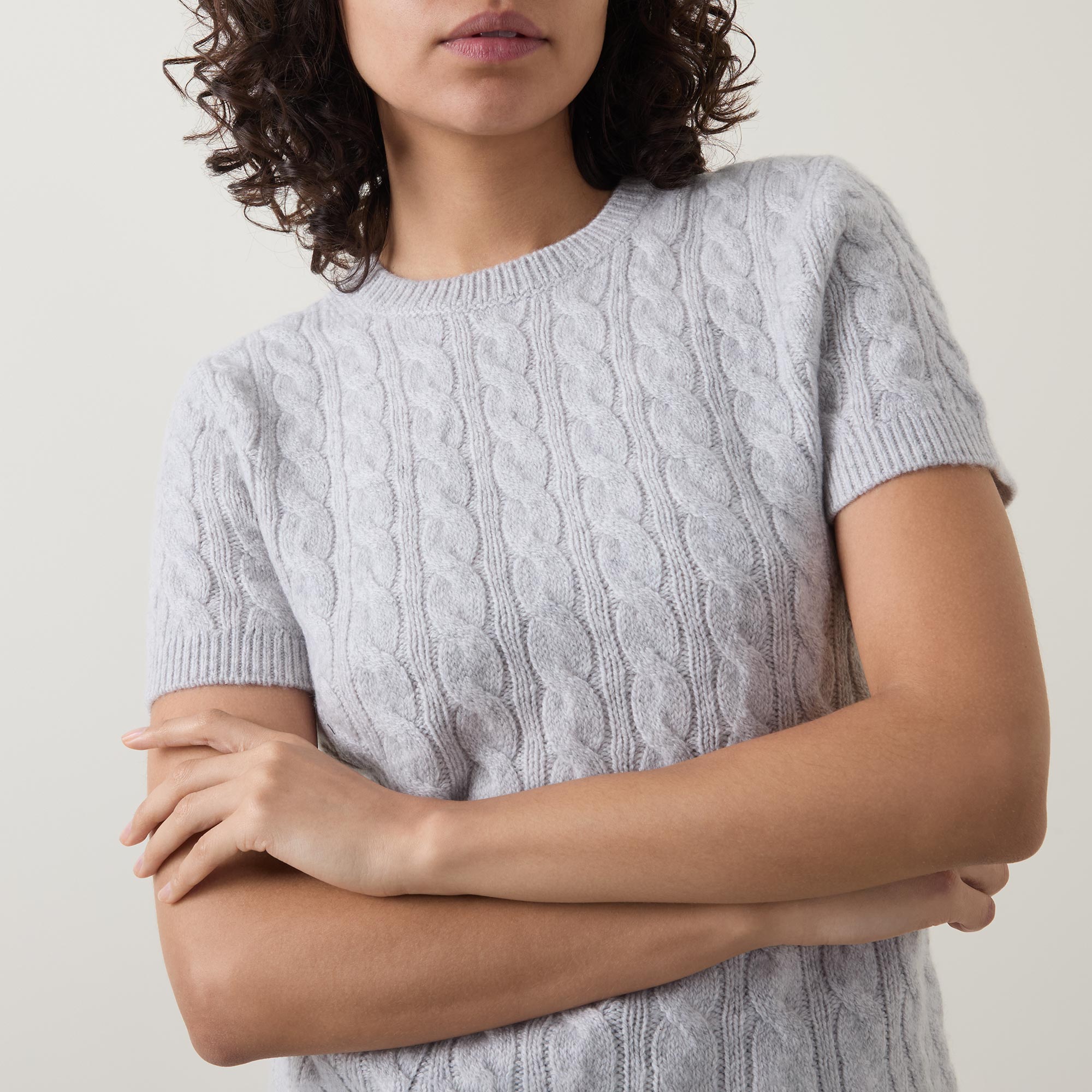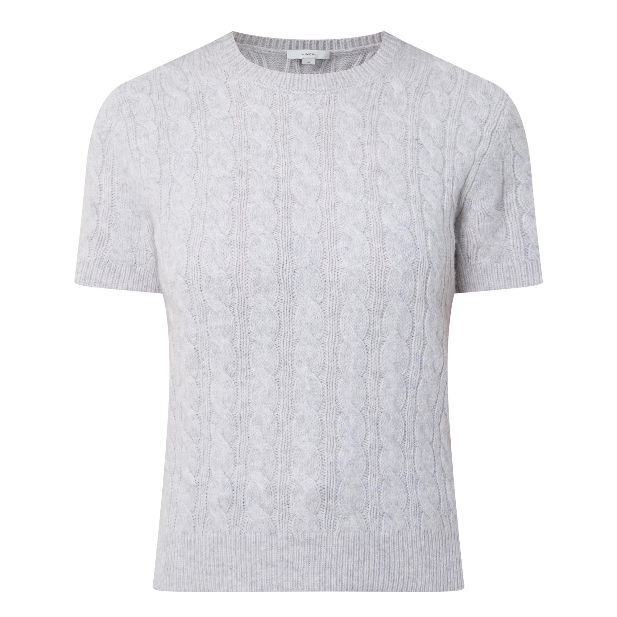 - Crew neckline, short sleeves, ribbed trims, pullover style, cable-knit finish