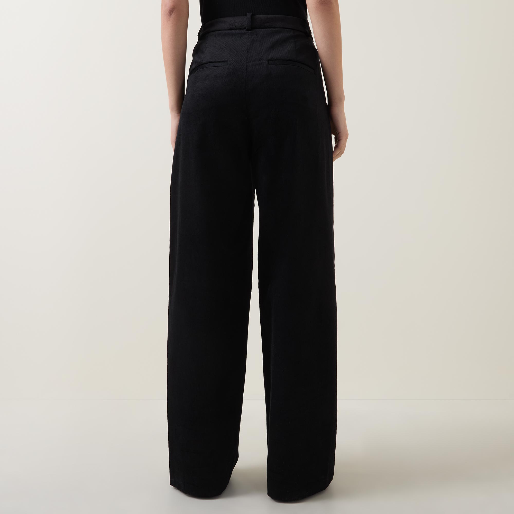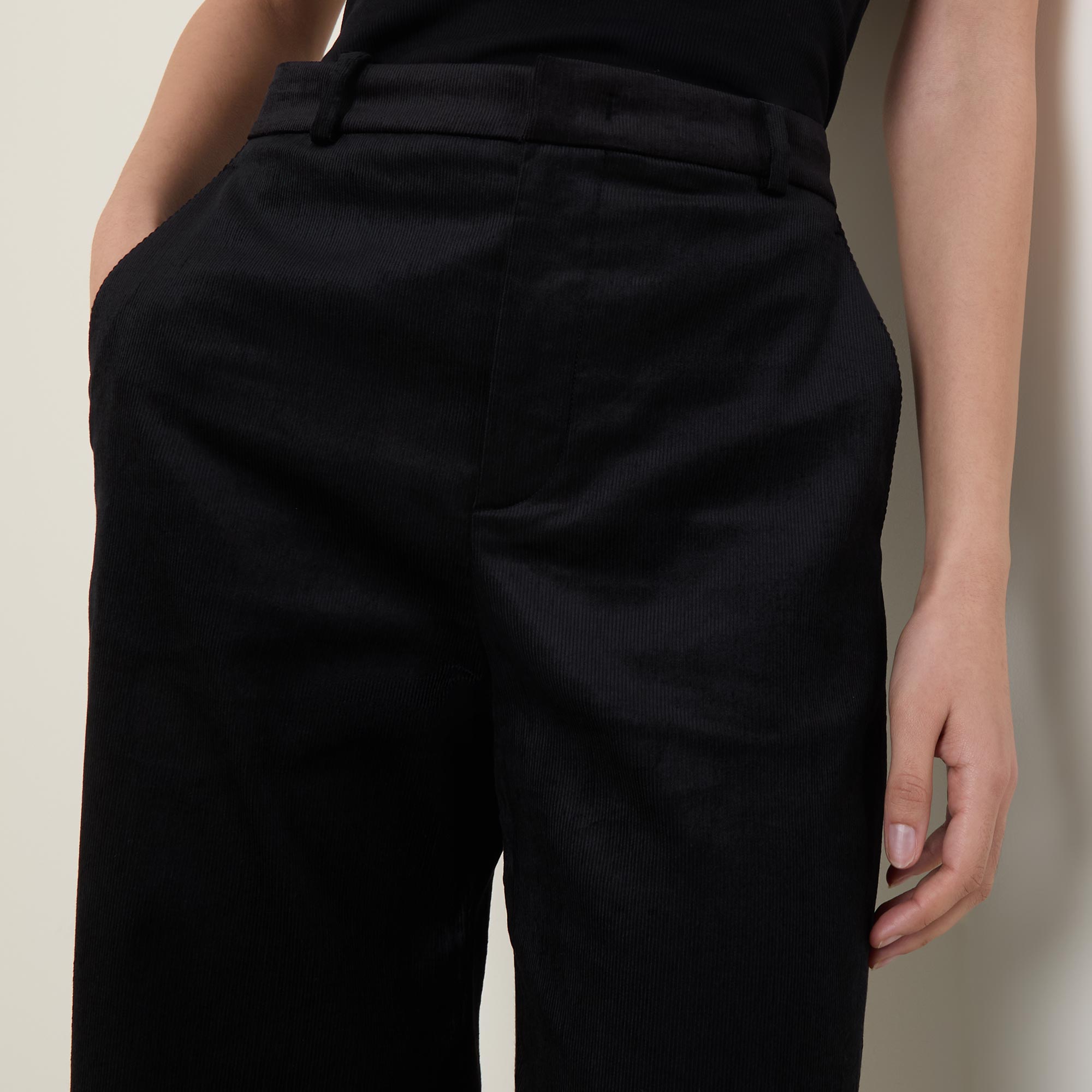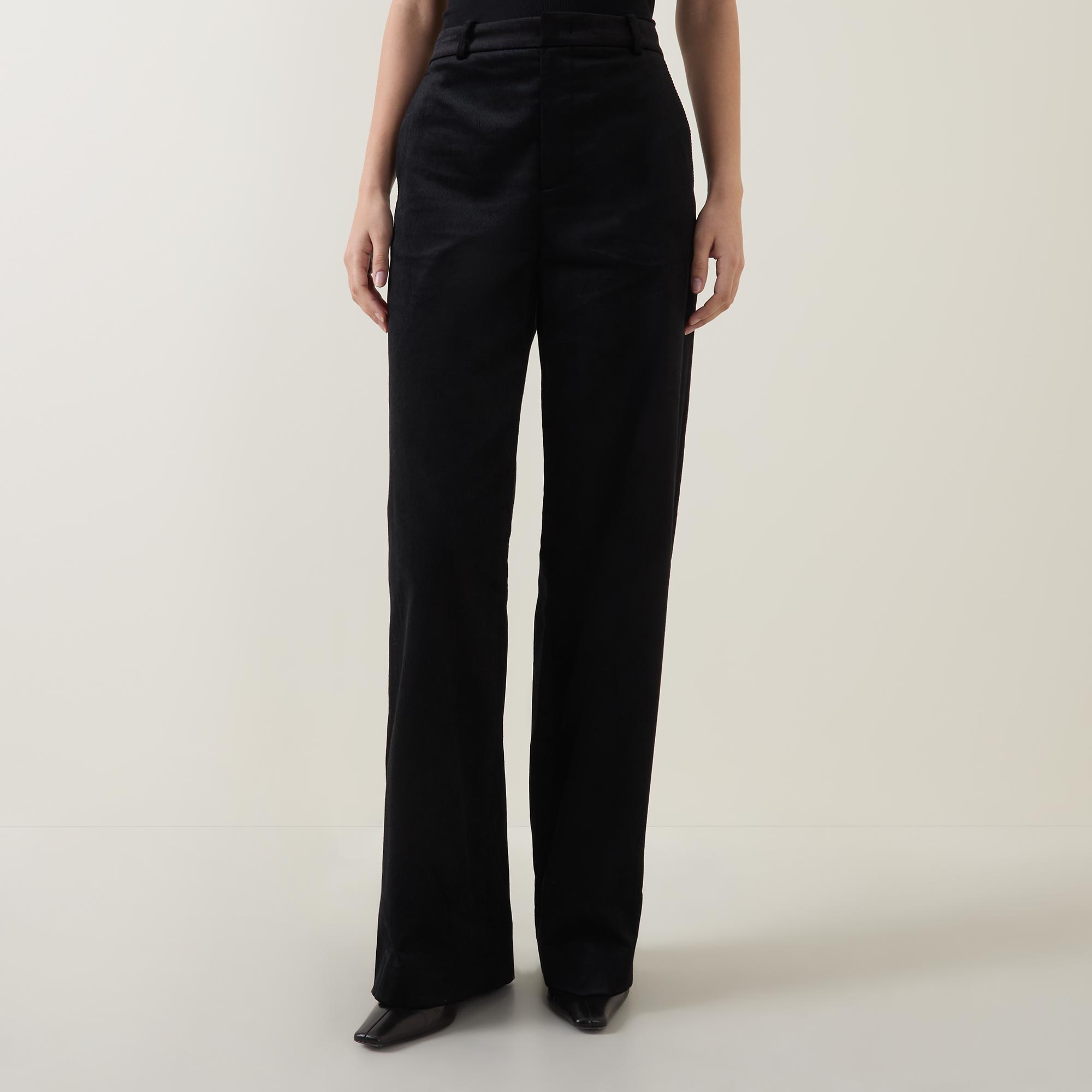 • High waist, wide leg, velvet fabrication, concealed fastening, belt loops, side slip pockets, back welt pockets