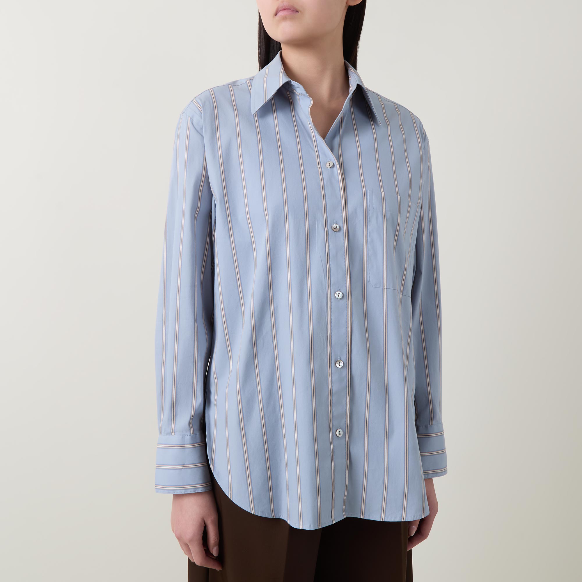 • Elongated pointed collar, button fastening, long sleeves, single-cuffs, curved hemline, striped pattern, chest patch pocket, shoulder yoke and pleats to the back