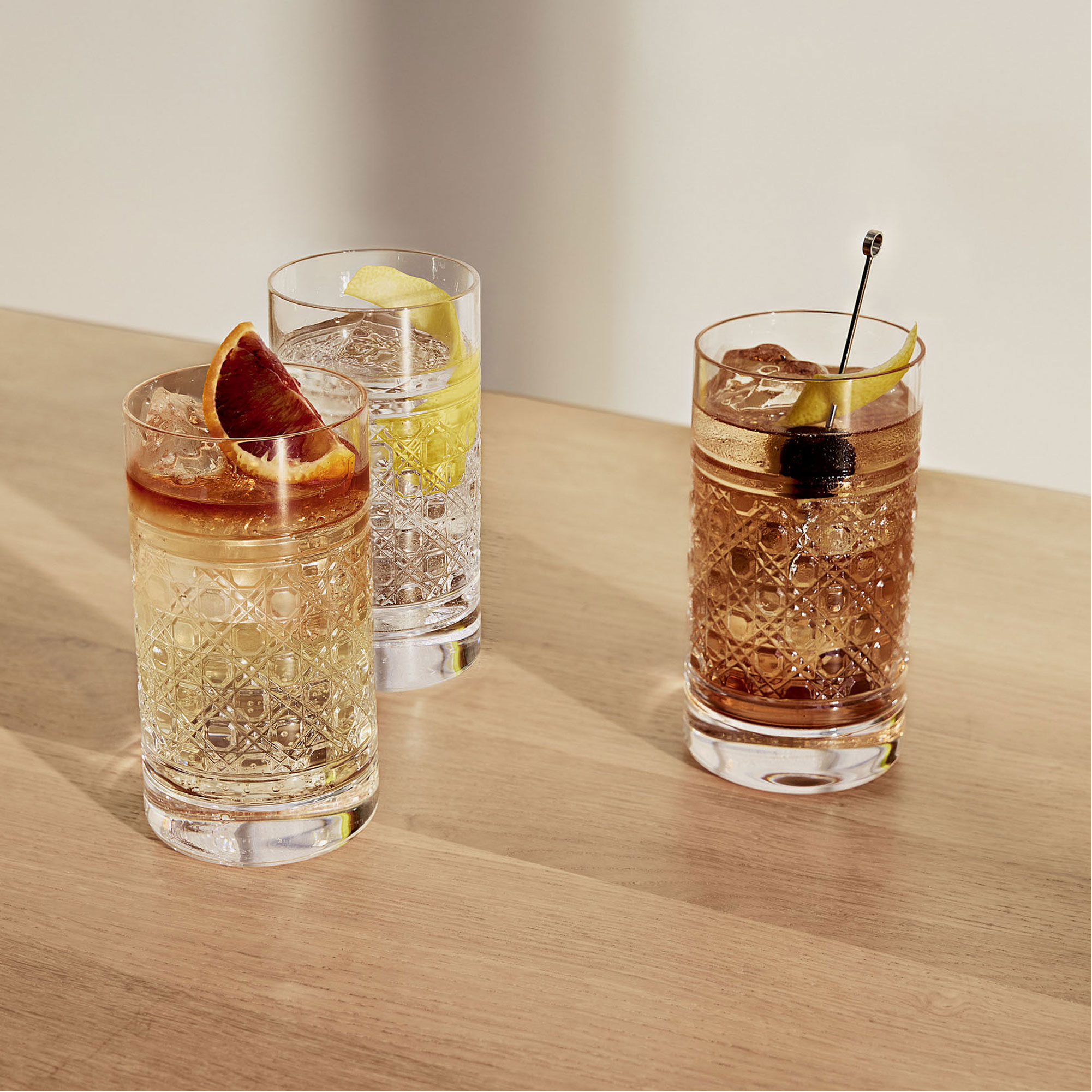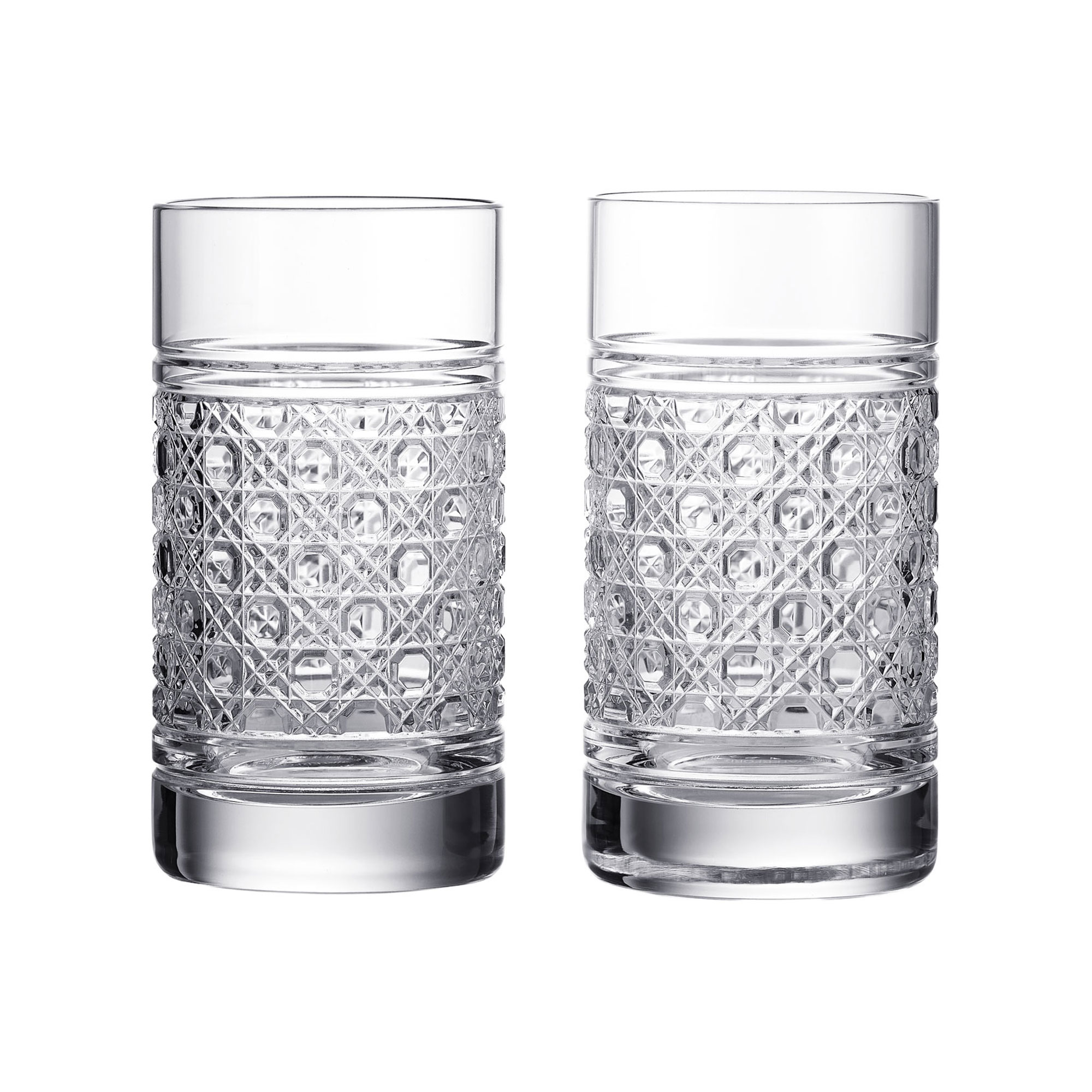 - Two glasses, highball style, lead-free crystal, signature packaging