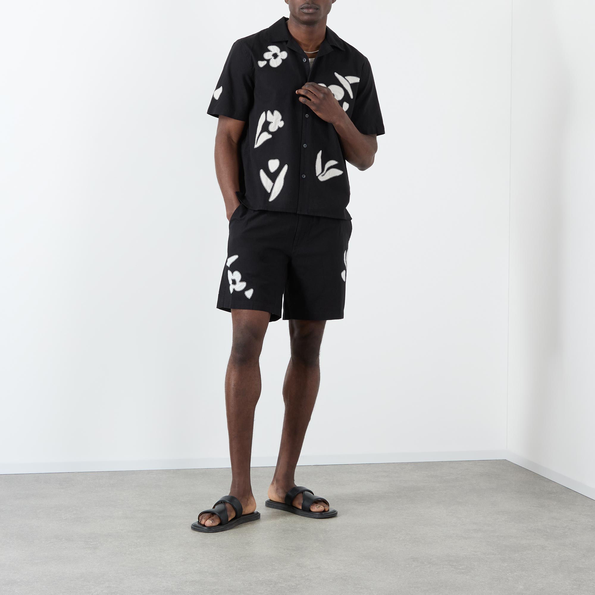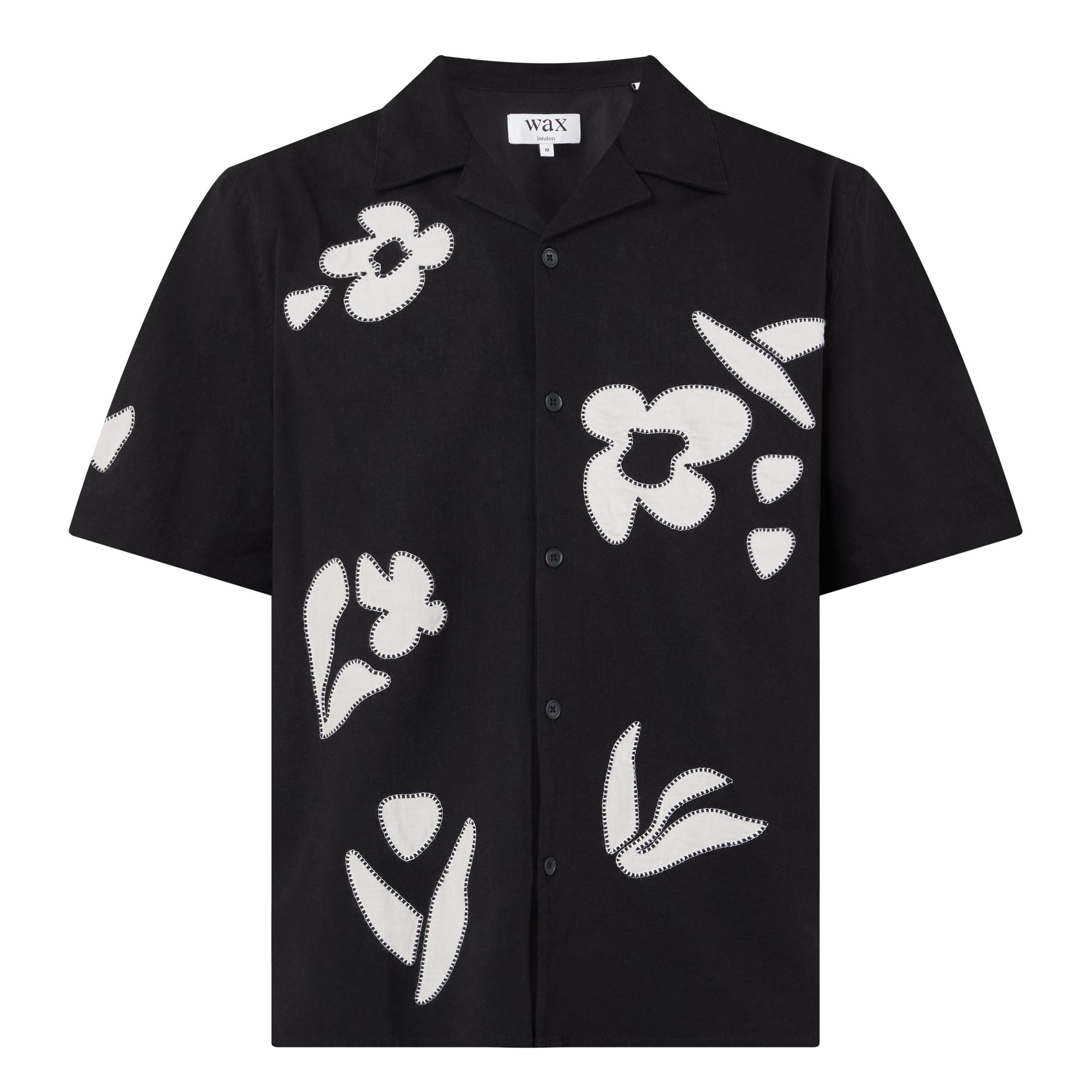 - Camp collar, short sleeves, front button placket, straight hem, embroidered detailing, logo tag
