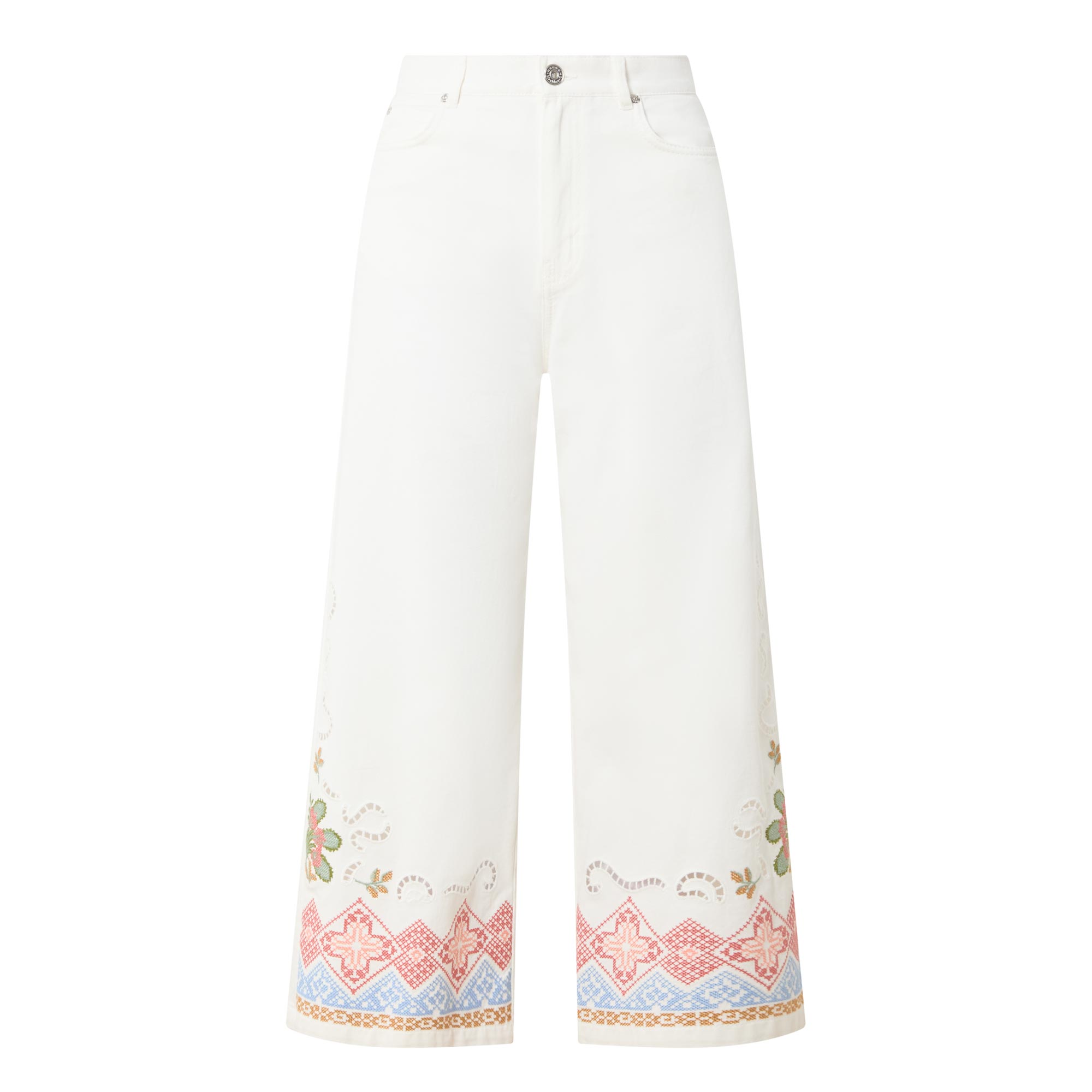 • High-rise, wide-leg, cropped length, belt loops, concealed fly and button fastening, five-pocket styling, clean hems, embroidered detailing, rear logo patch