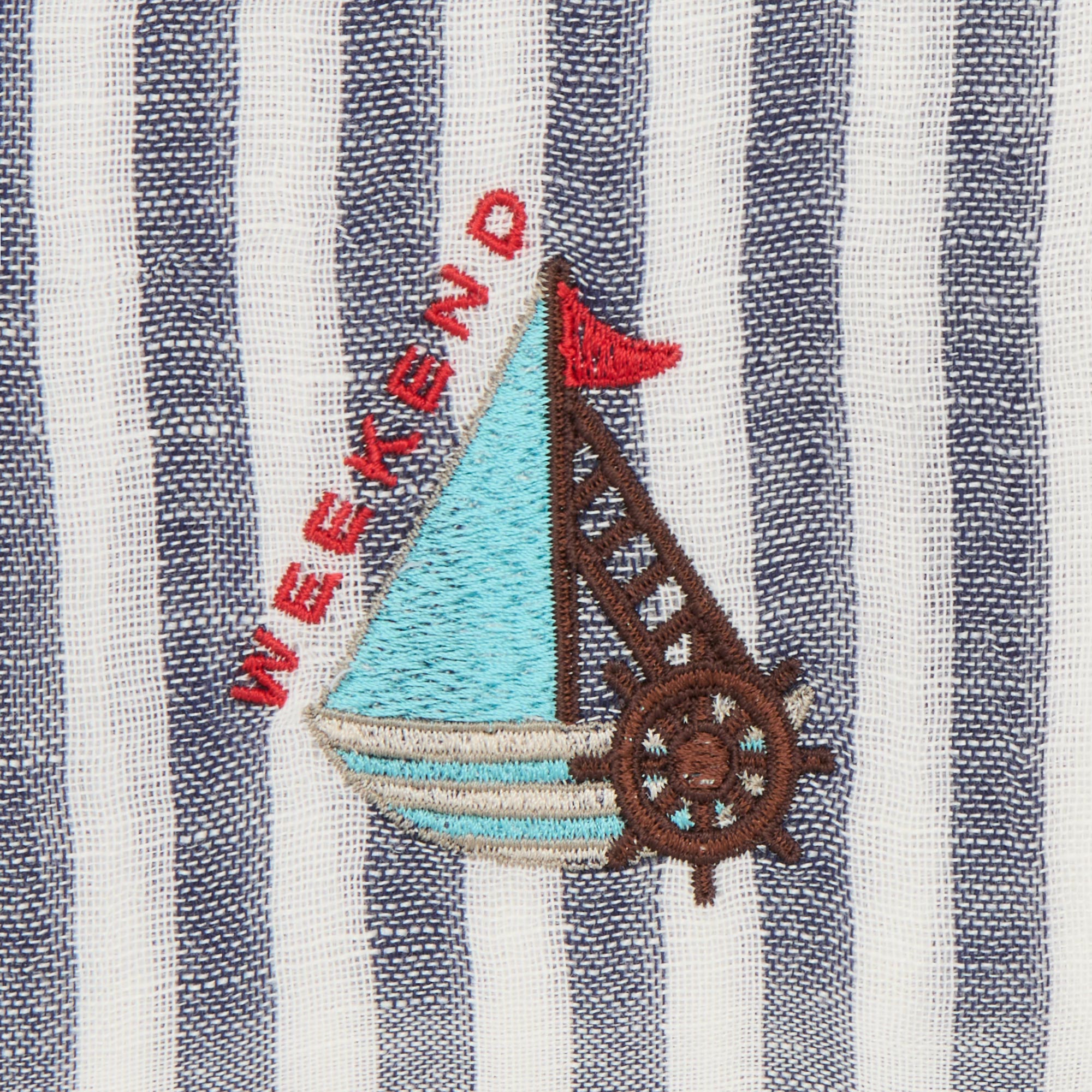 - Wrap-around design, frayed edges, nautical logo embroidery, striped pattern, woven finish