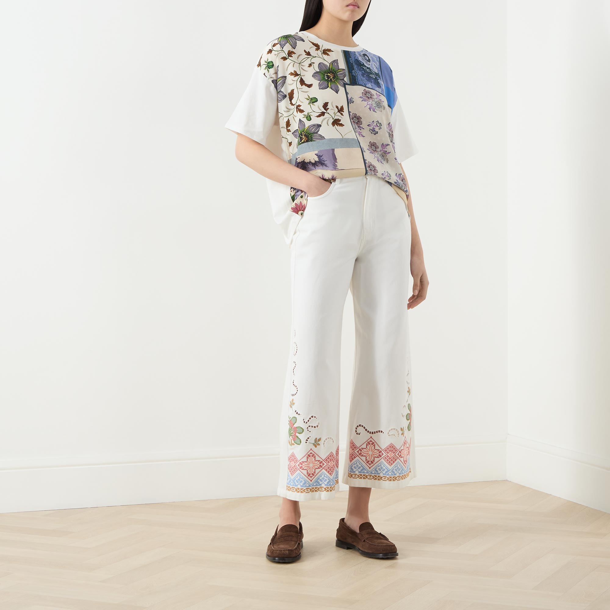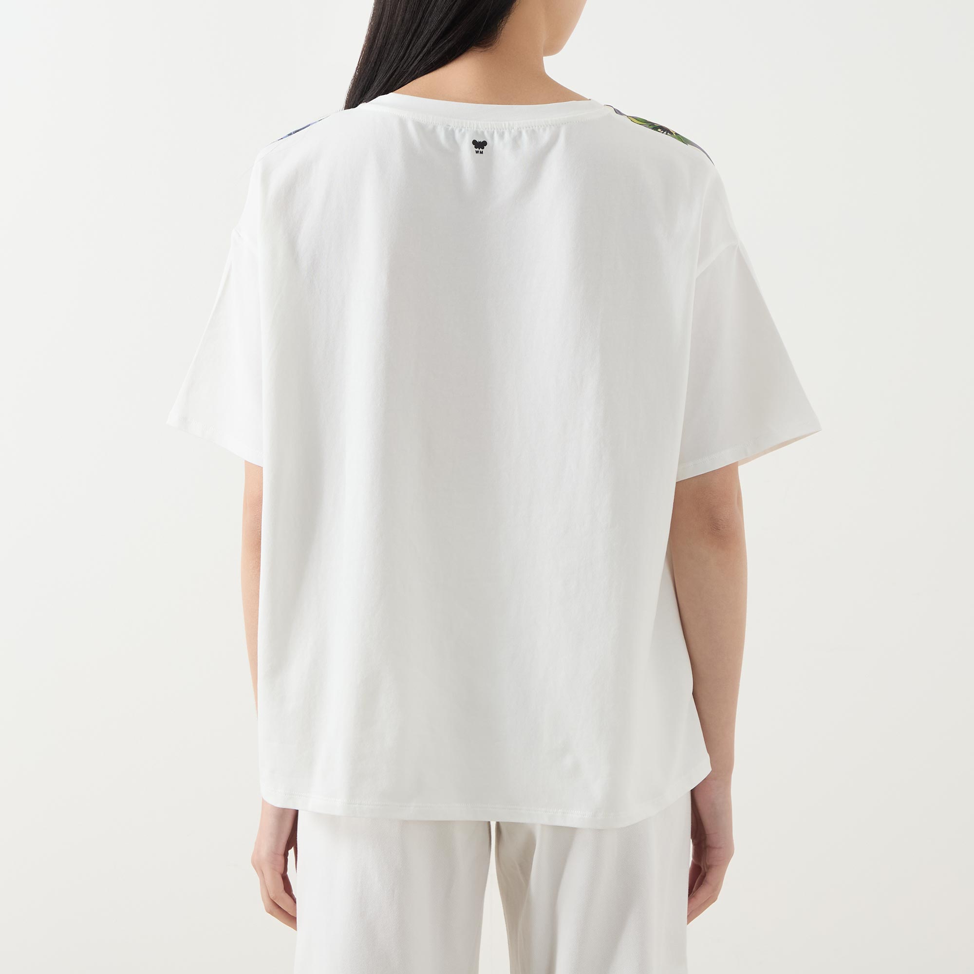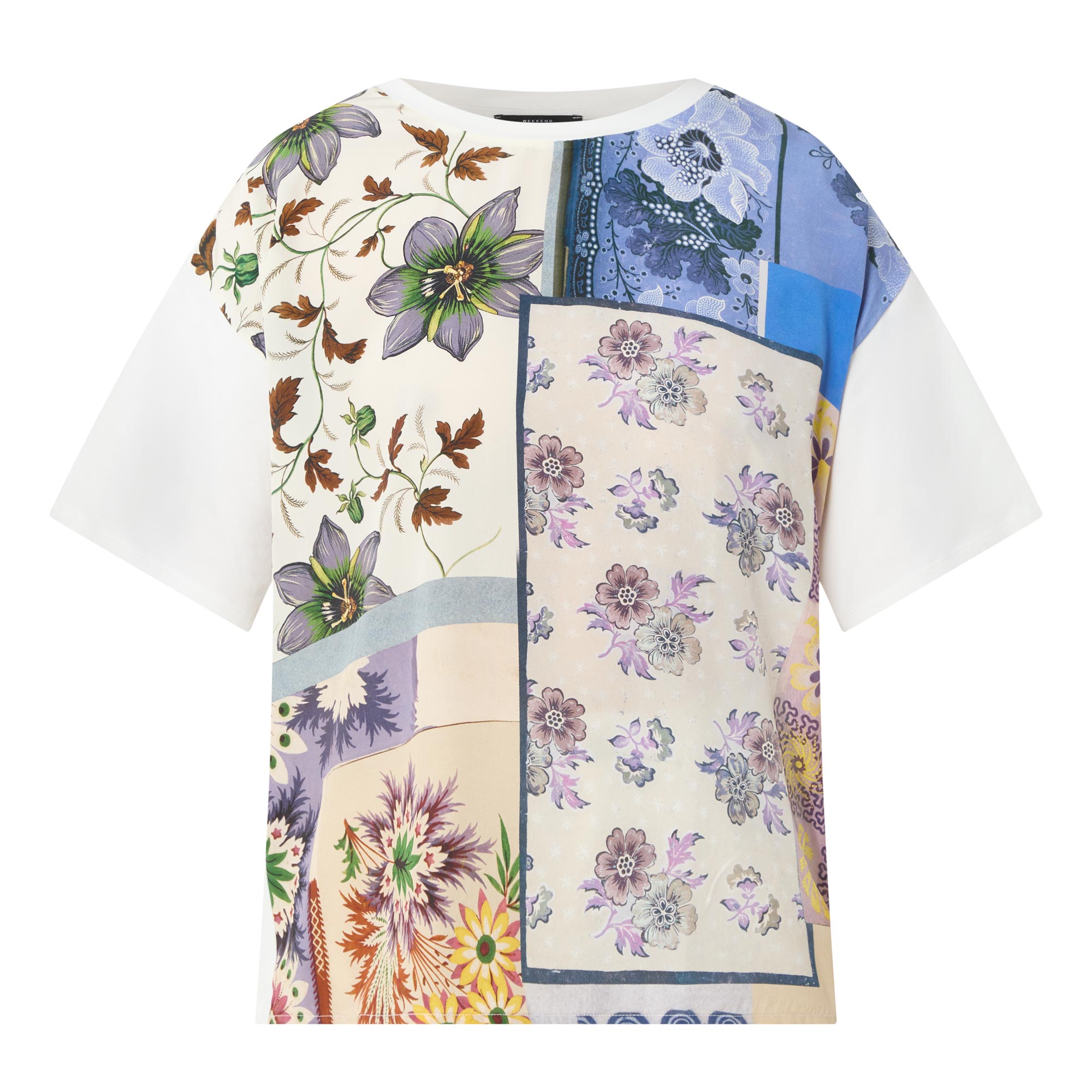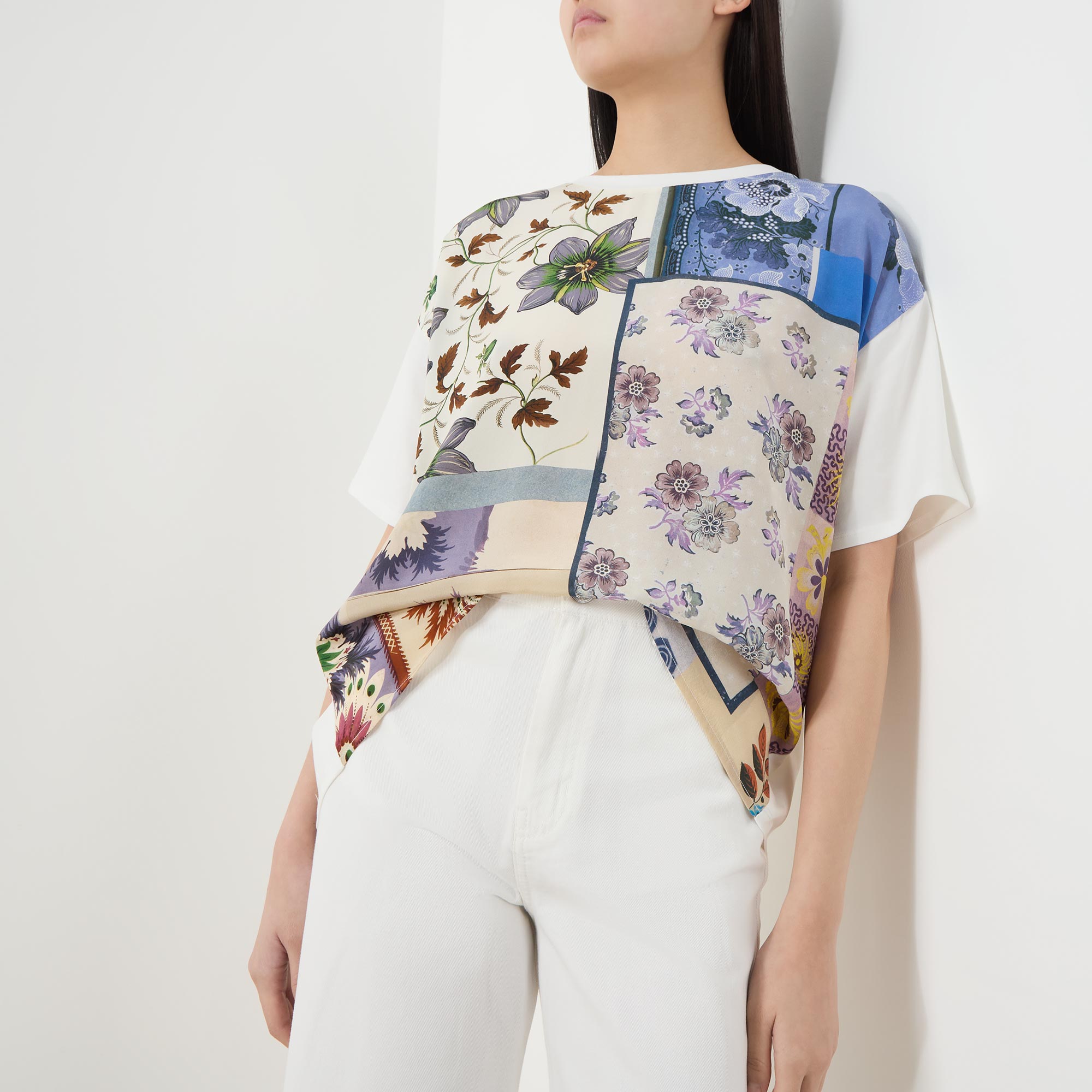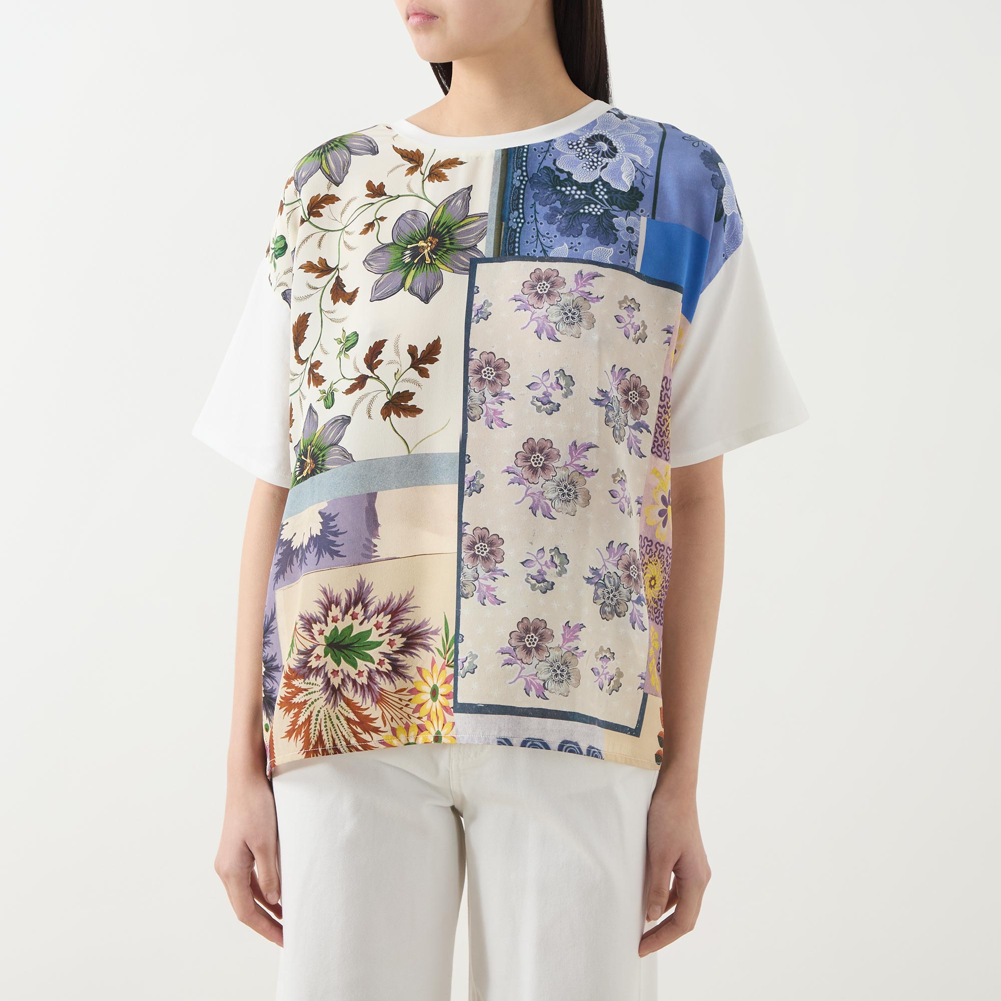 • Round neck, dropped shoulders, short sleeves, straight hem, rear logo embroidery, front patchwork printed design
