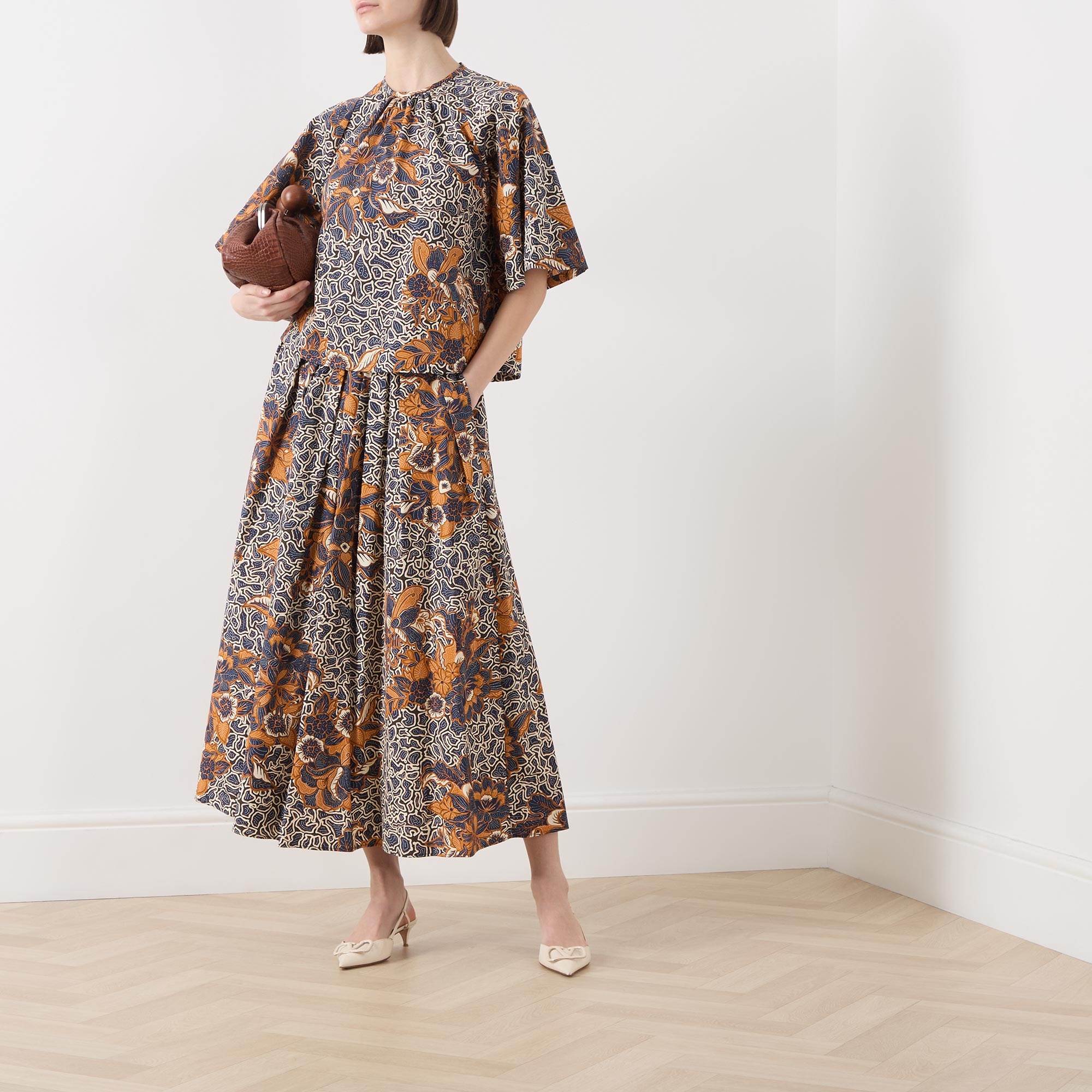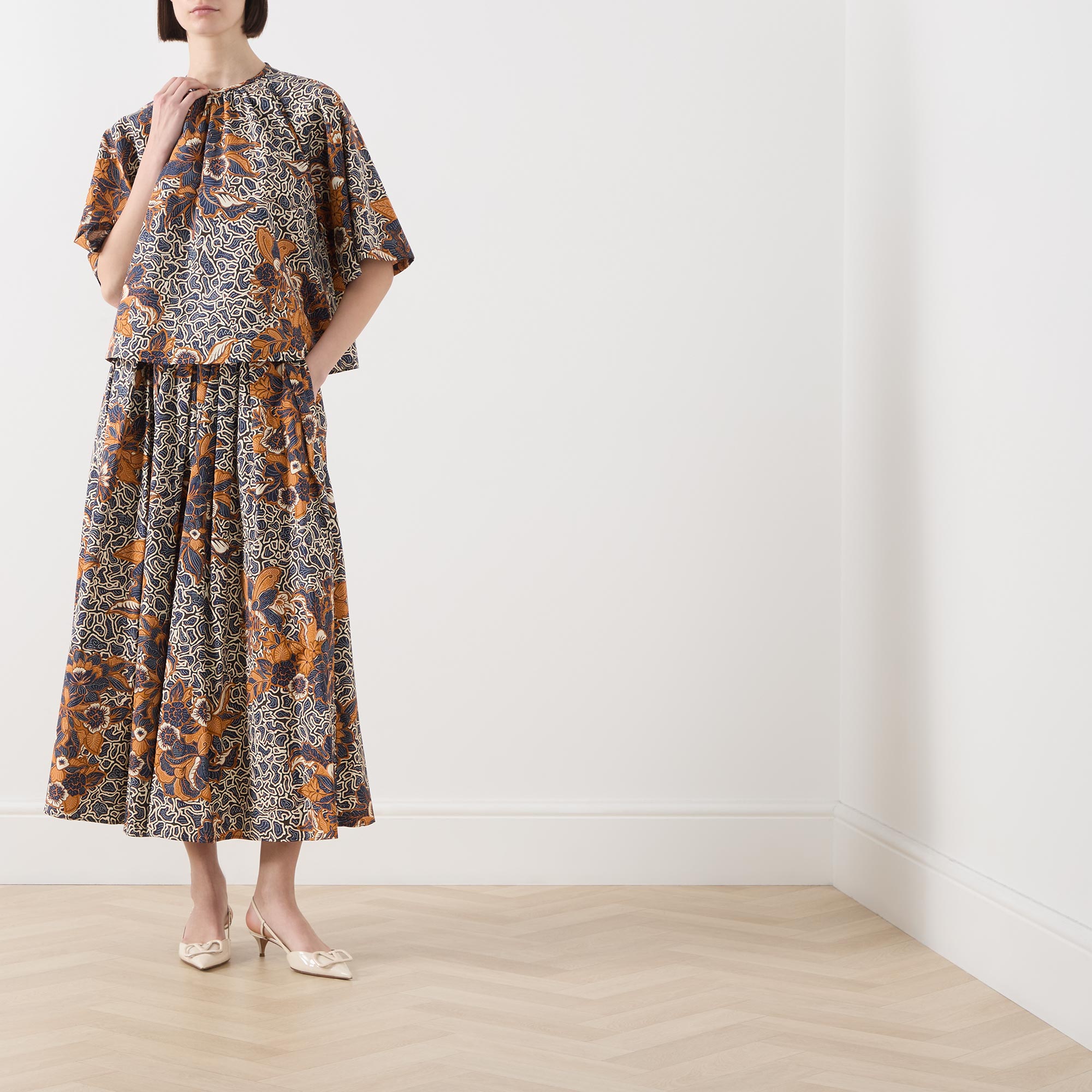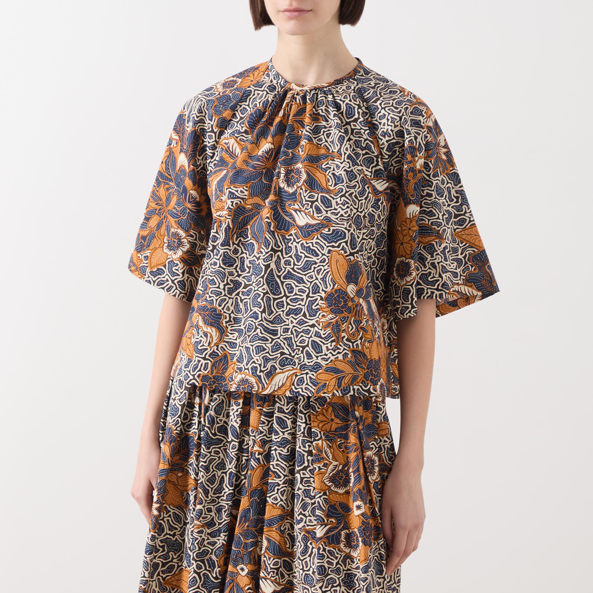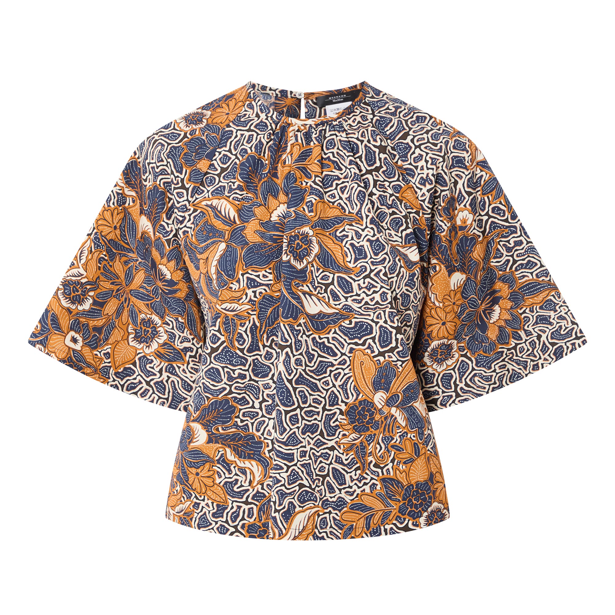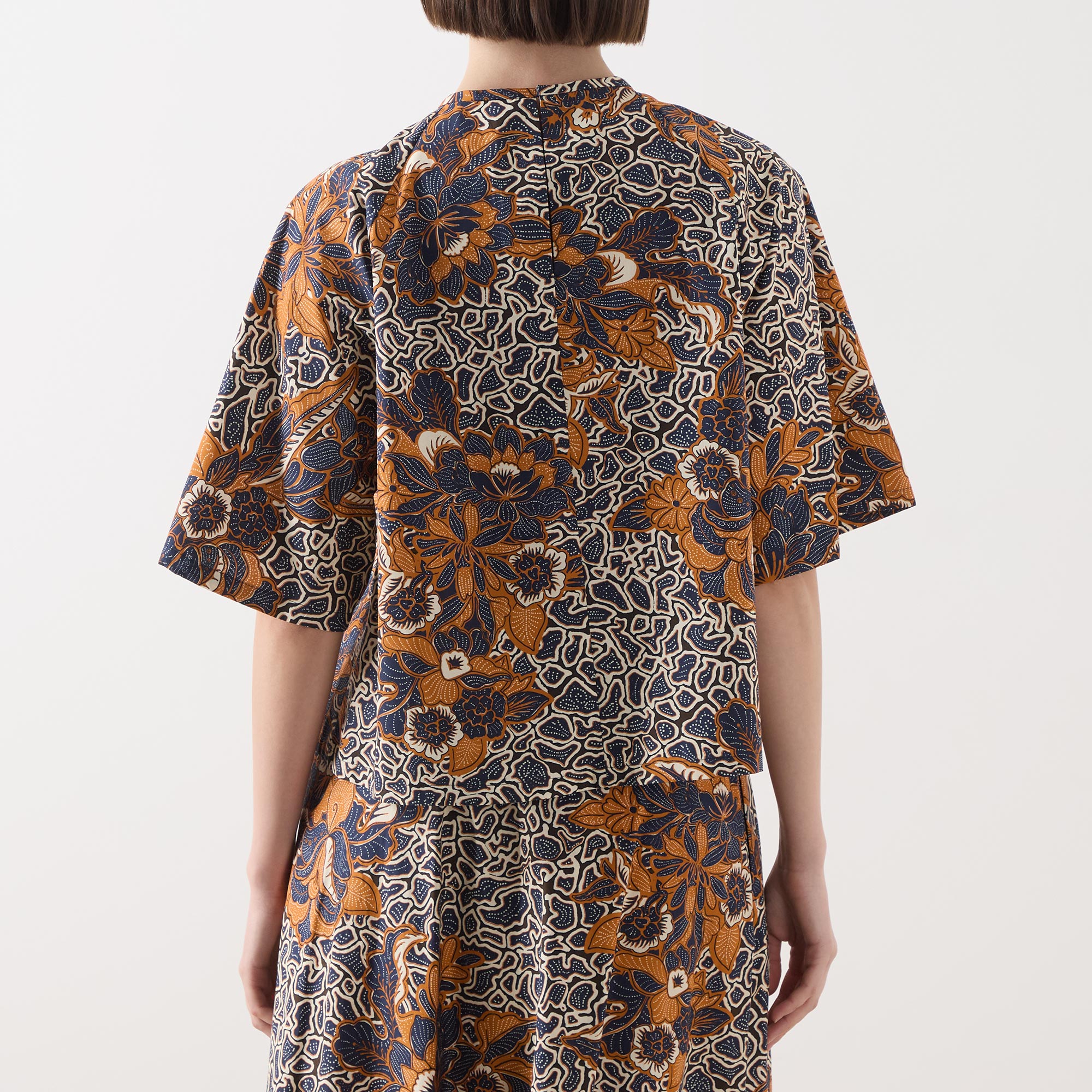 • Round neck with gathered details, short wide-cut raglan sleeves, teardrop and button fastening to the back, floral and geometric shape