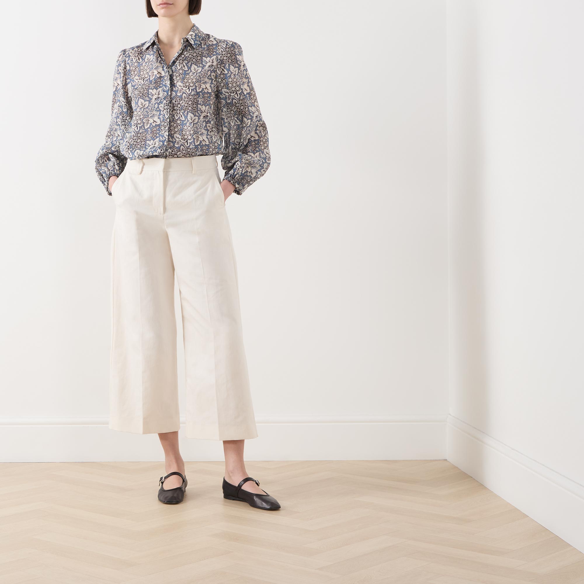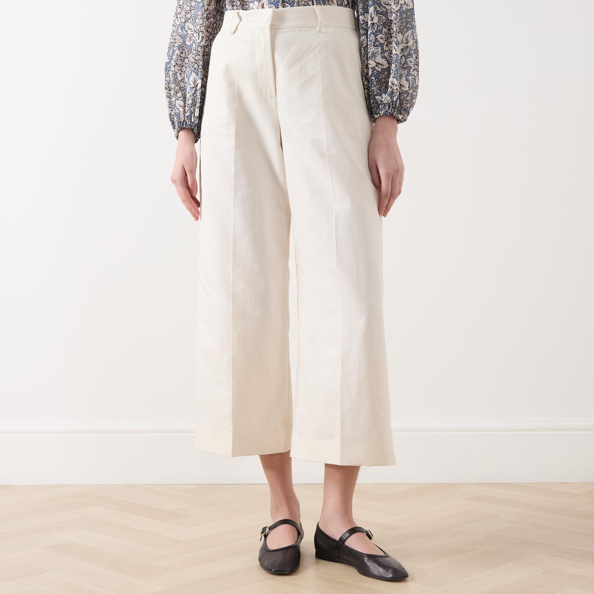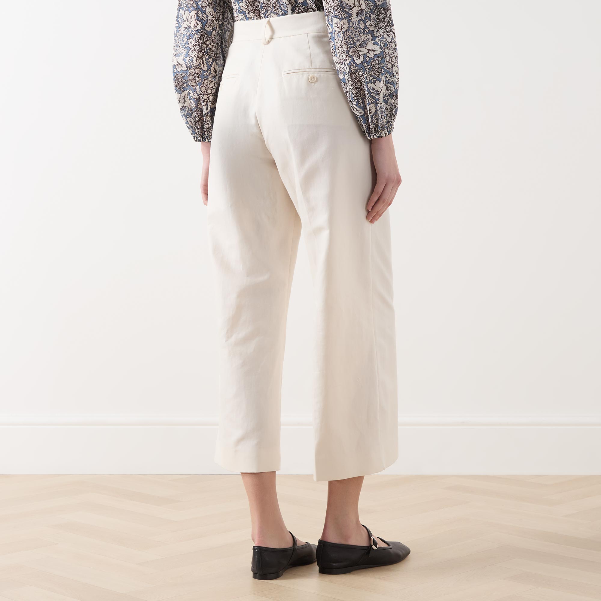 - Mid rise, wide leg, cropped length, belt loops, concealed fly with hook and bar fastening, two side entry pockets, two rear jetted pockets with button fastenings, clean hems, pressed creases, tonal stitching