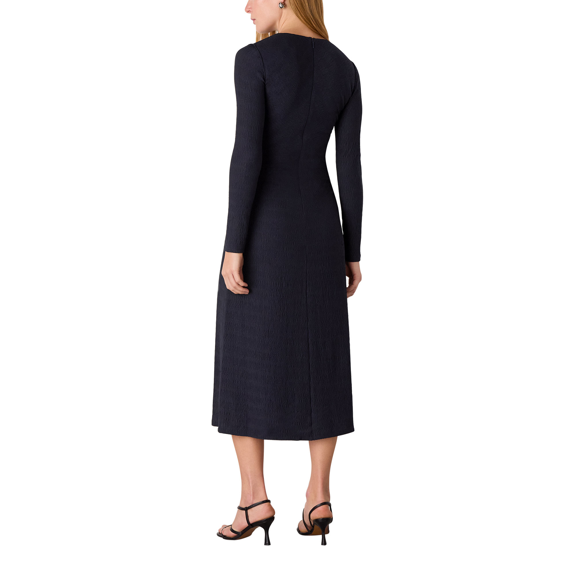 - Round neckline, long sleeves, back zip-fastening closure, inverted seams, midi length, textured finish