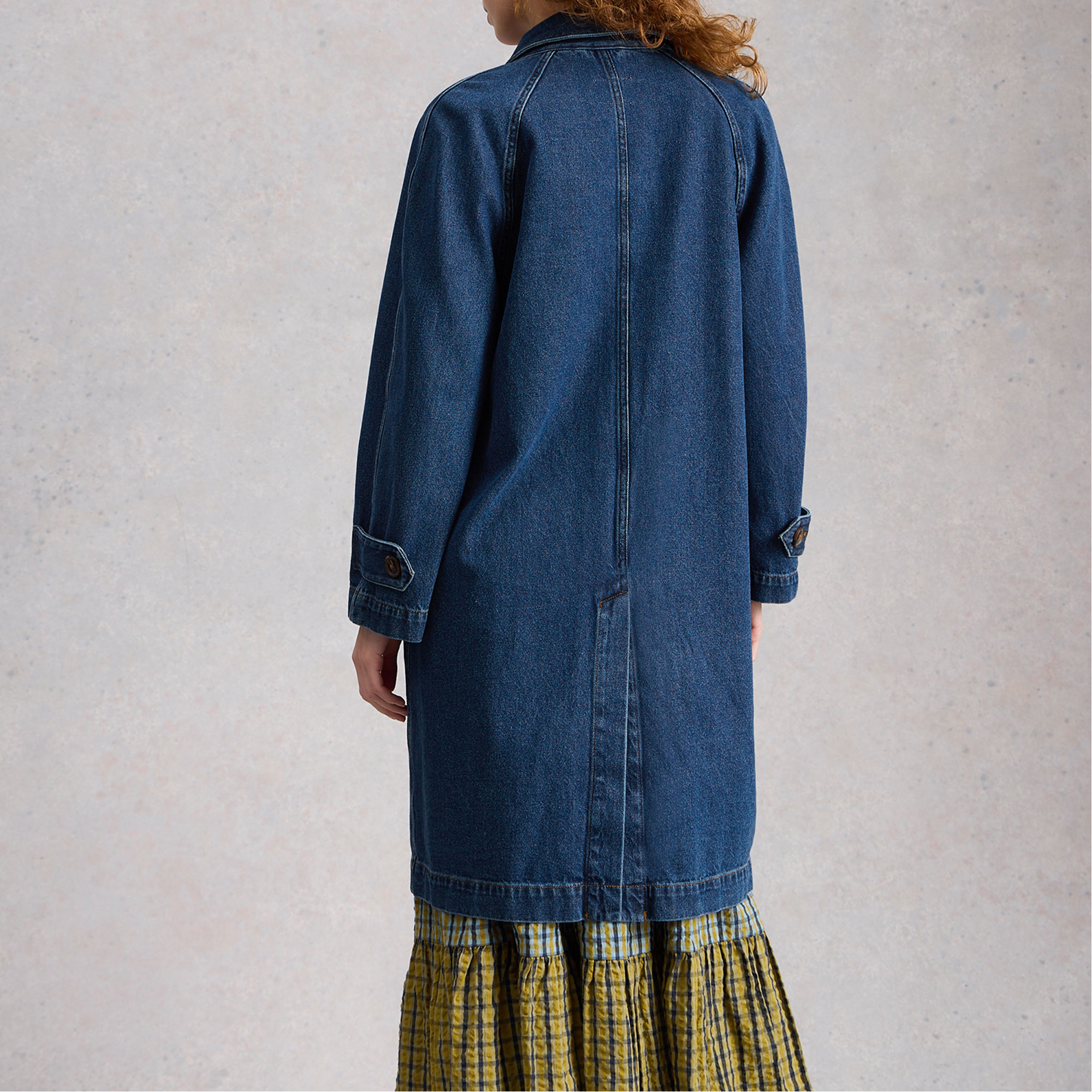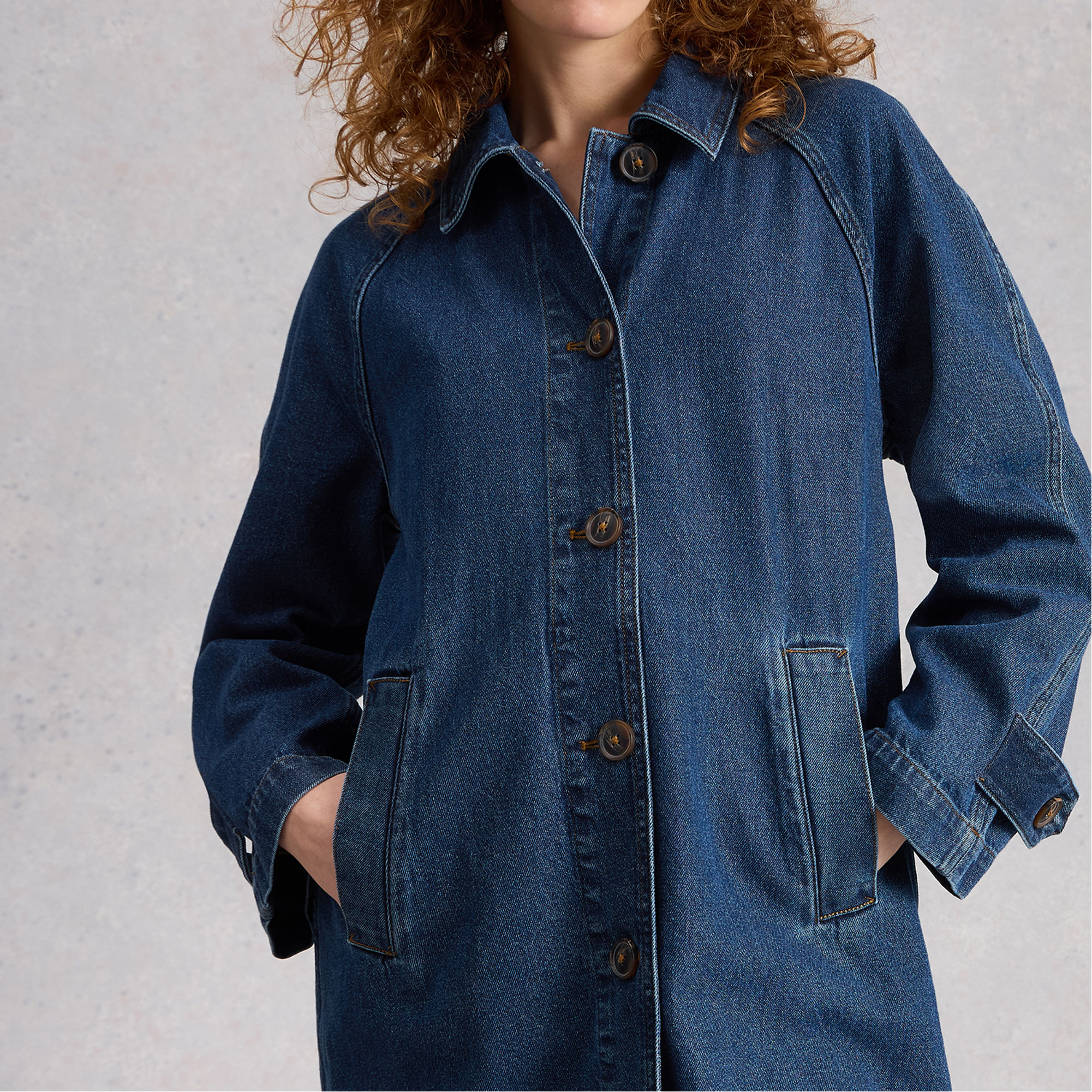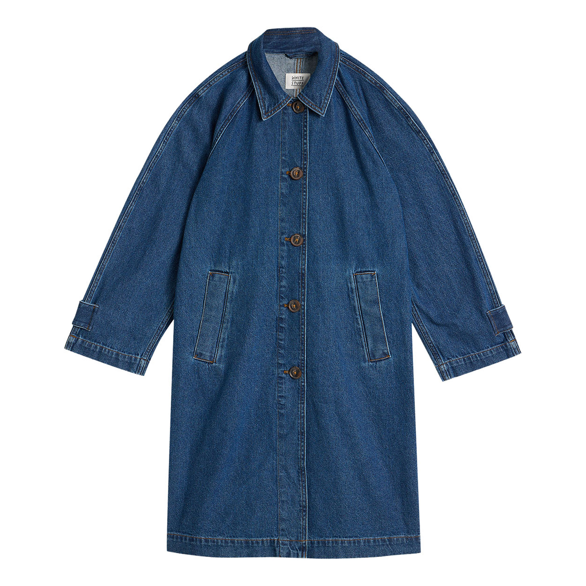 • Denim fabric, longline, collar, front button fastenings, side pockets
