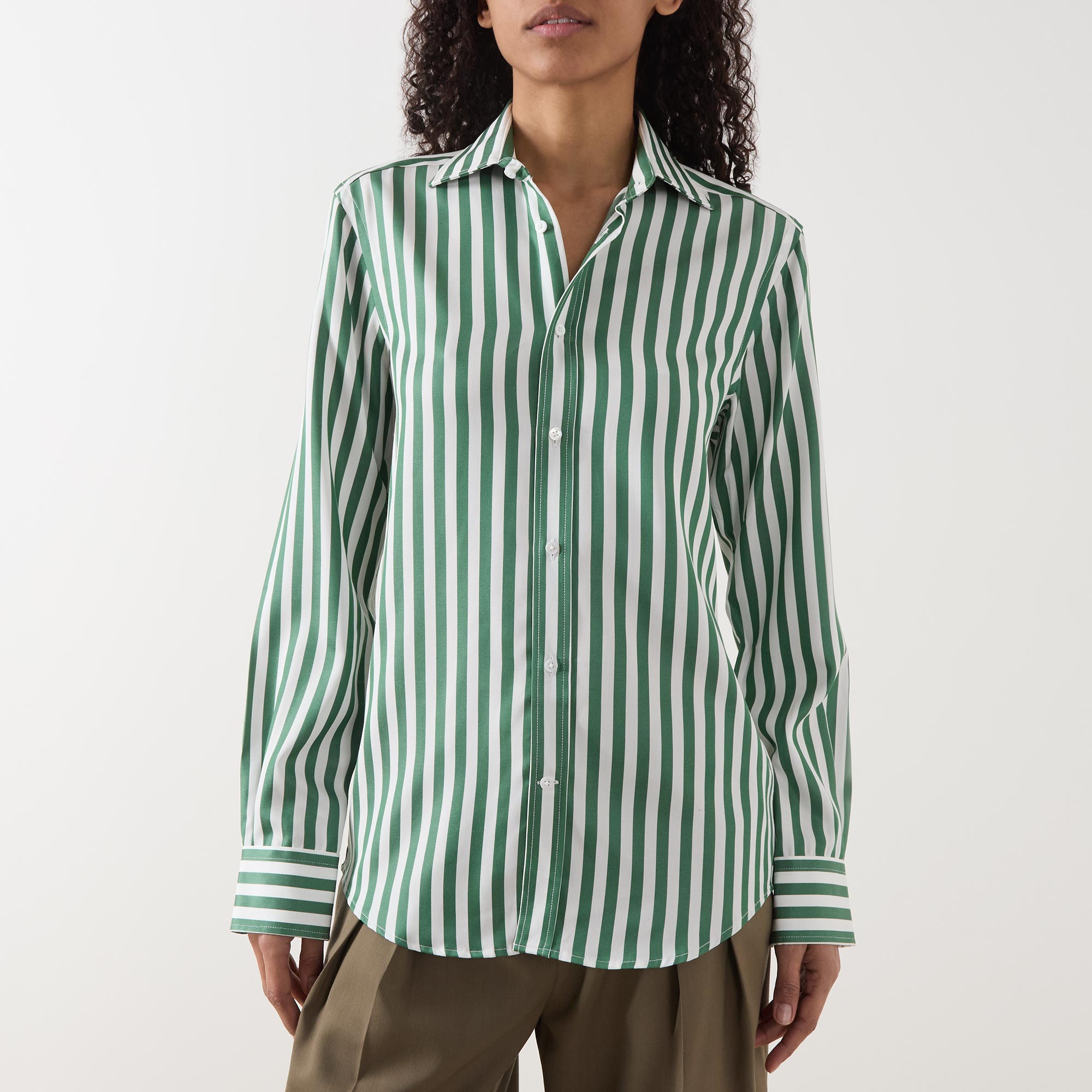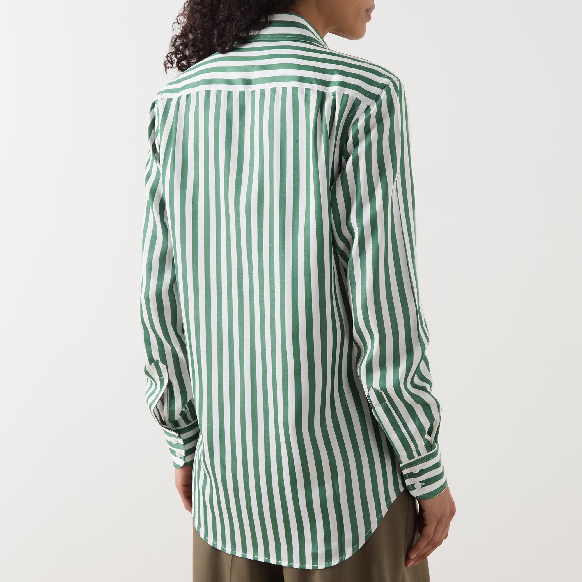 - Classic collar with collarbones, button fastening, long sleeves, buttoned cuffs, two pleats across the yoke, stripe pattern, curved hemline